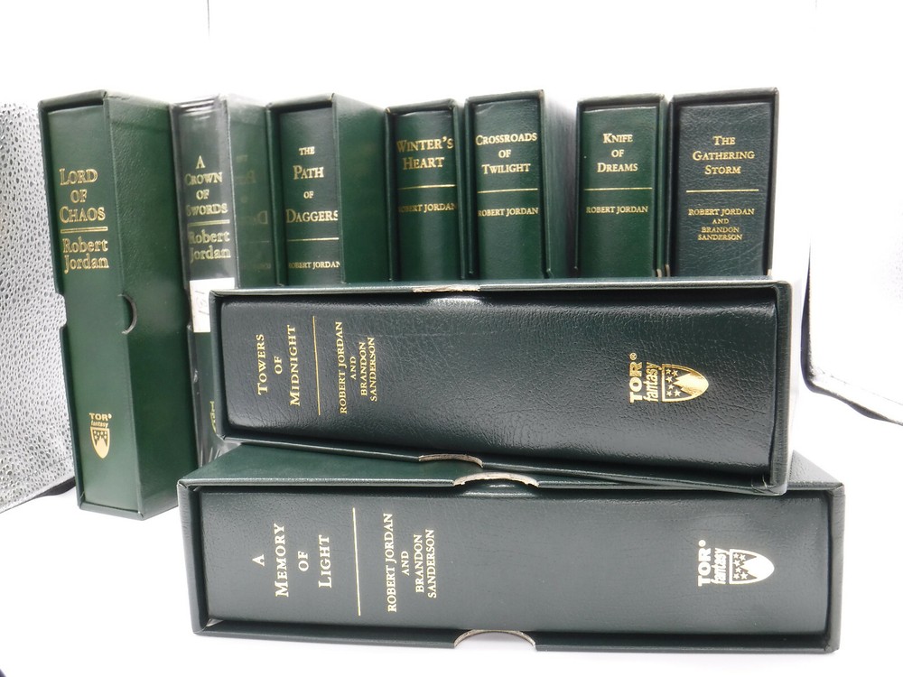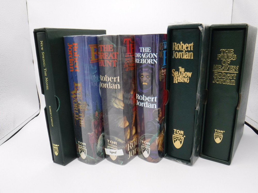 Very Unique Set-Will ship extremely well packed with the collector in mind. Shipping restrictions will apply. Full Tor Limited Edition run plus extras New Spring 37/150 The Eye of the World First Edition First Printing First State Signed/lined/dated near publication date! The Great Hunt First Edition First Printing Flat Signed Signed The Dragon Reborn First Edition First Printing Signed/lined/dated The Shadow Rising Limited Numbered Edition 76/100 The Fires of Heaven Limited Numbered 2/150 Lord of Chaos Limited Numbered 155/200 A Crown of Swords Limited Numbered 131/175 The Path of Daggers Limited Numbered 101/175 Winter's Heart Limited Numbered 131/150 Crossroads of Twilight Limited Lettered QQ/52 Knife of Dreams Limited Lettered W/52 The Gathering Storm Limited numbered 89/100 Towers of Midnight limited Numbered 18/125 A Memory of Light Limited Numbered 63/125