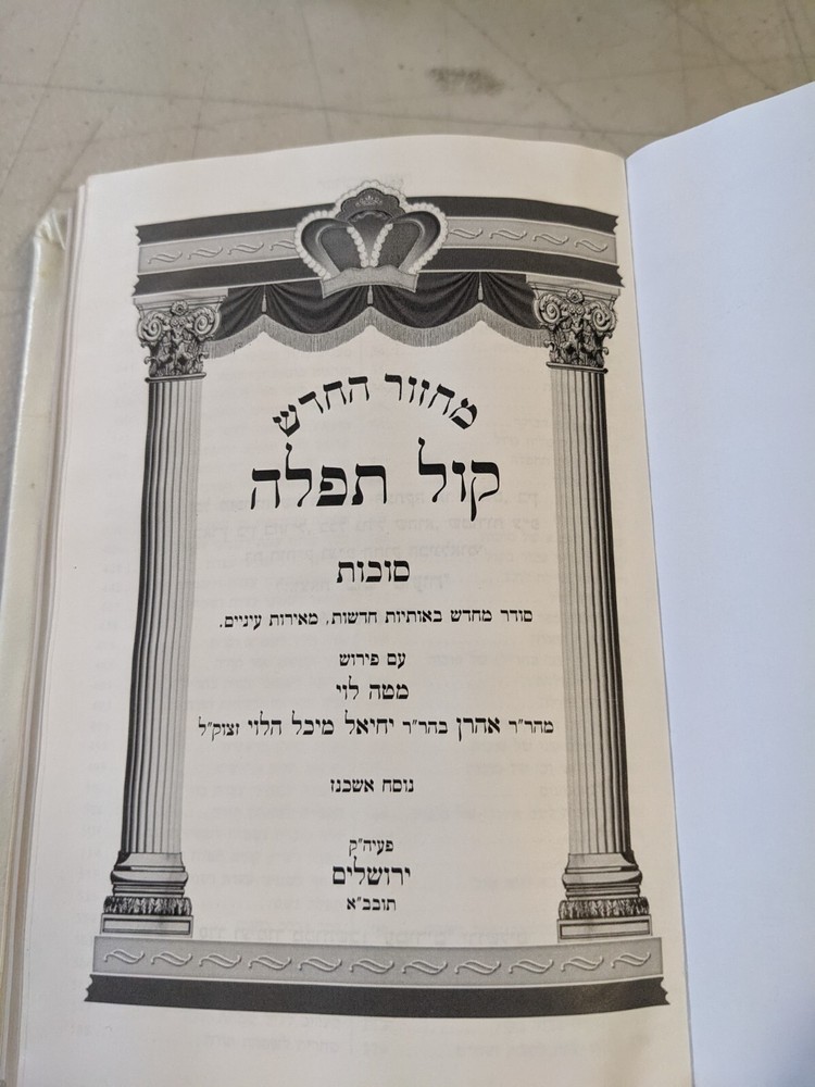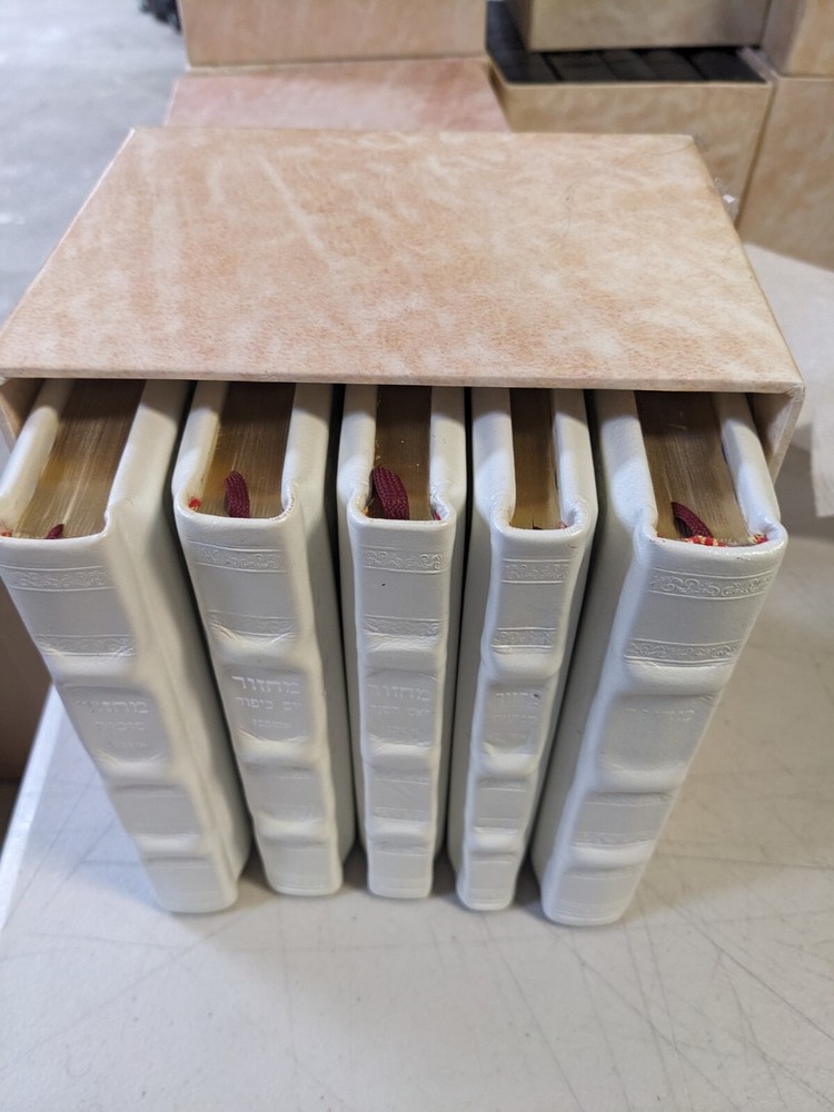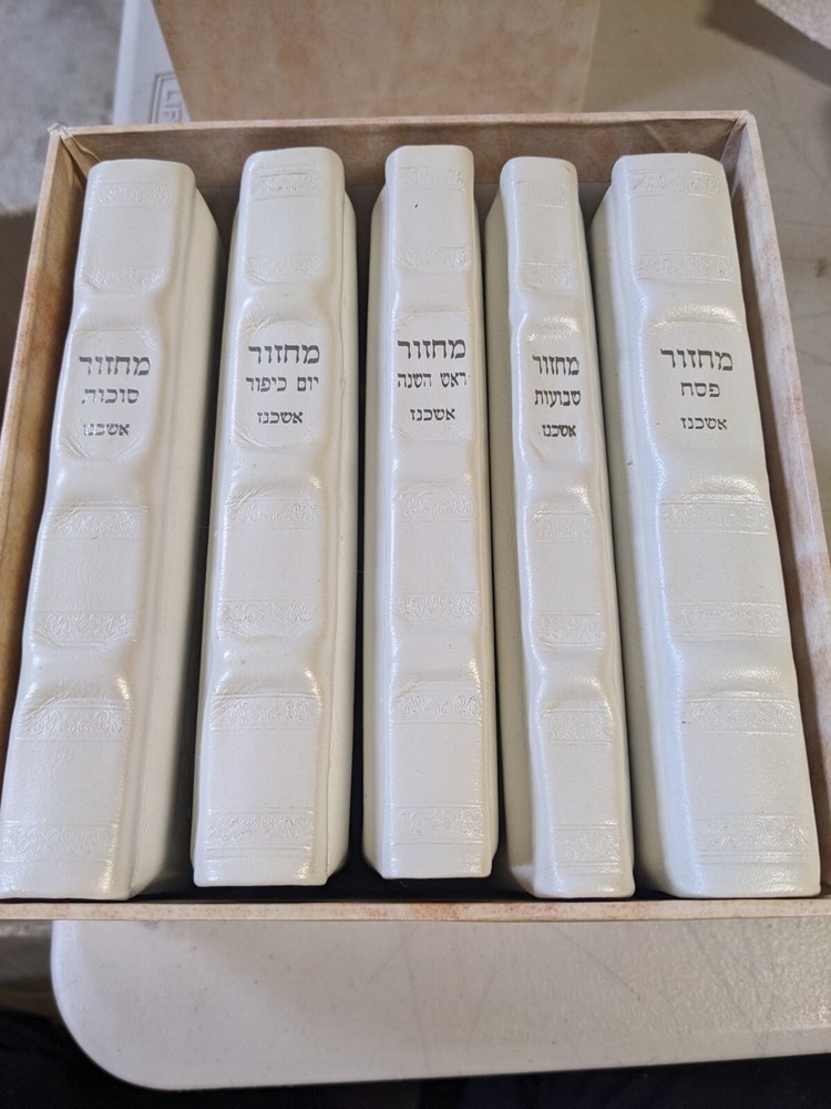 This is a set of white leather-bound Machzorim, specifically designed for the Ashkenazic Jewish community. The set is titled "Kol Tefilah" and is a collection of prayers and liturgy used during Jewish holidays and special occasions. The set is a collectible item and falls under the categories of Books, Judaism, and Religion & Spirituality.