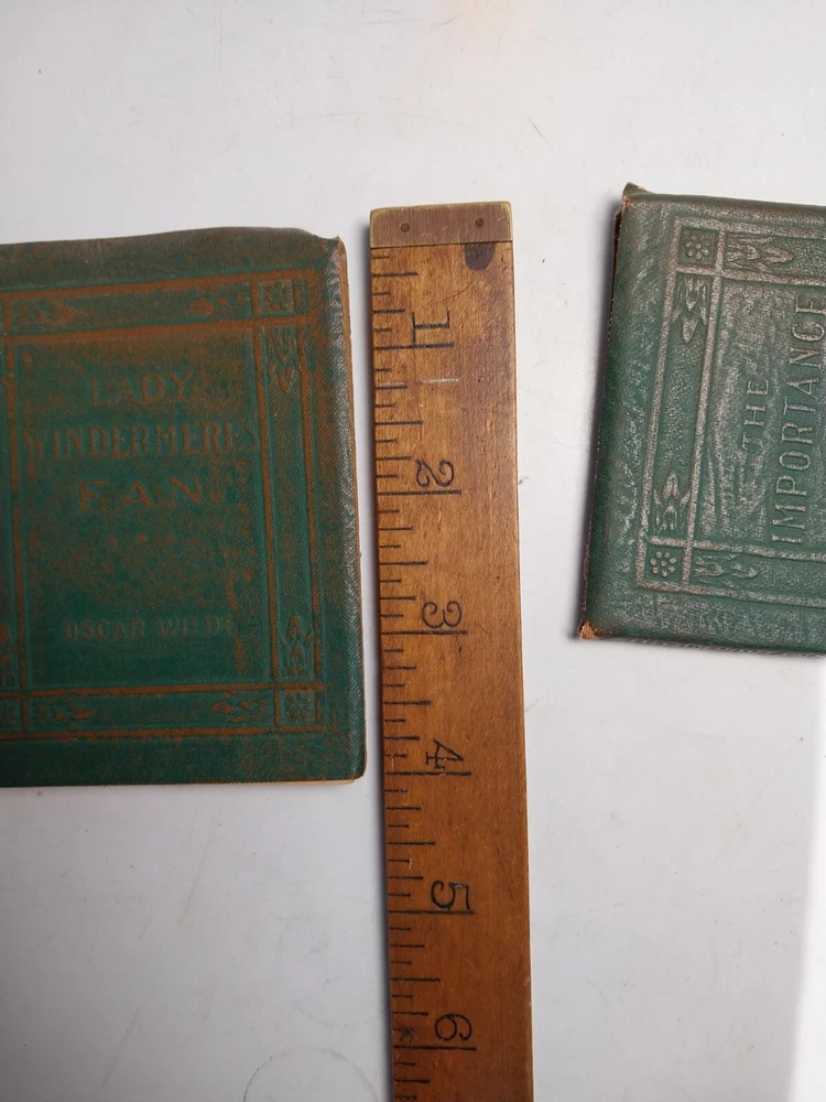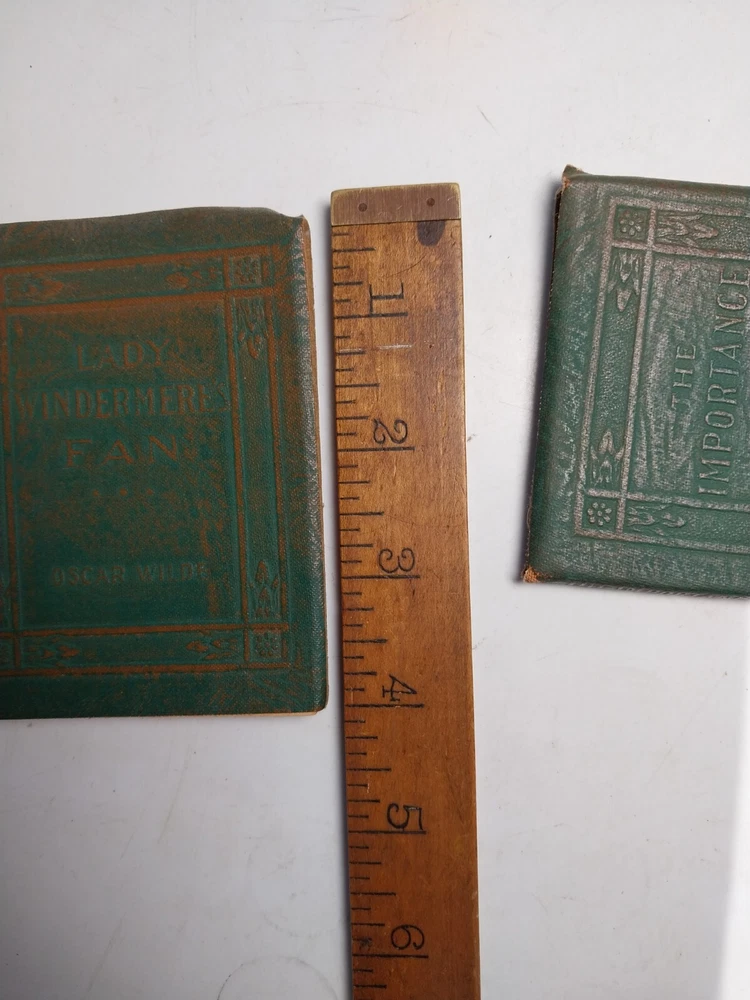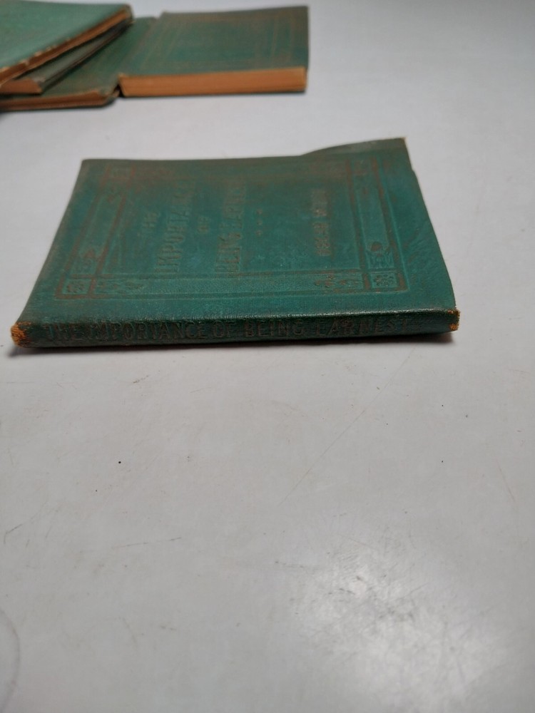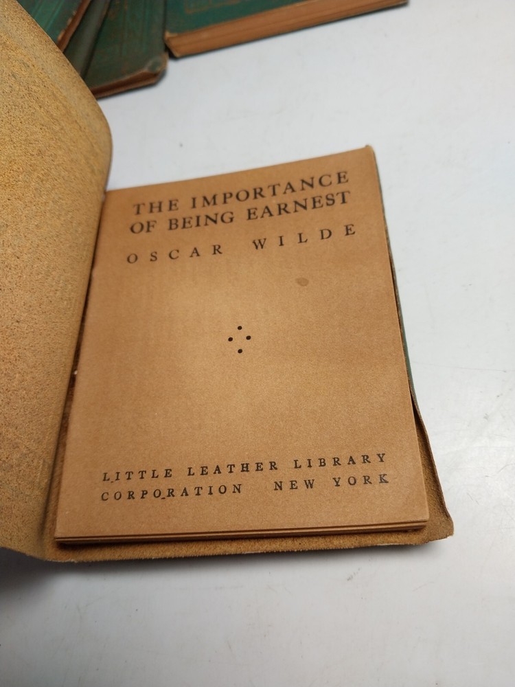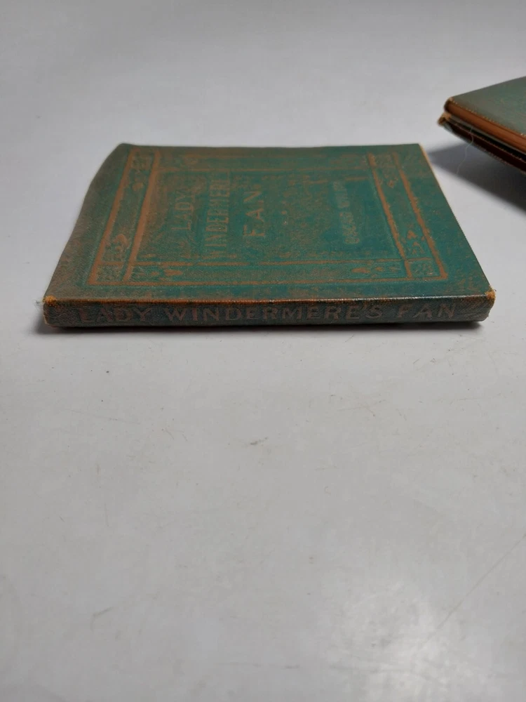 Wilde Windermer's Fan Earnest Salome Reading Goal Little Leather Library Book Set Book set measures approximately 3" x 4" and is in good used condition with some signs of age, use, and wear; age related toning to pages, please see photographs for condition details.