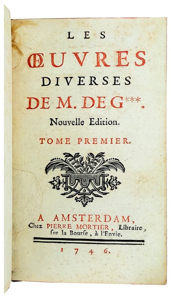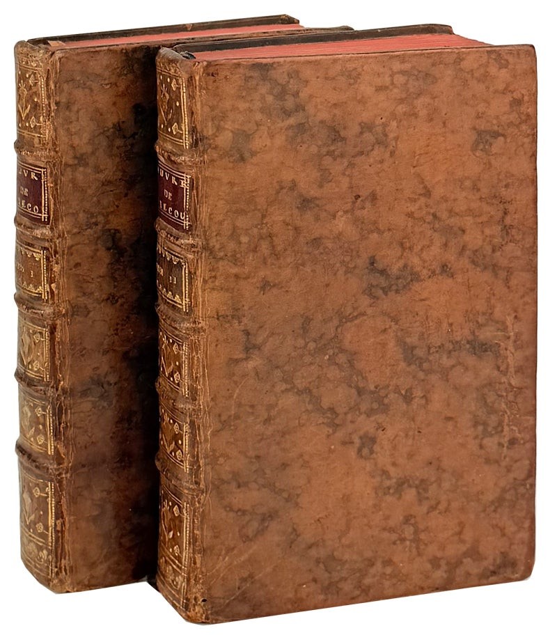 Les Oeuvres Diverses de M. de G*** [Two Volume Set] Author: [Jean-Baptiste Willart de Grecourt] Title: Les Oeuvres Diverses de M. de G*** [Two Volume Set] Publication: Amsterdam: Pierre Moriter, 1746 Description: Very Good. Amsterdam: Chez Pierre Mortier, Libraire, sur la Bourse, a l'Envie, 1746. Nouvelle Edition. Four volumes bound in two; 12mos; full contemporary calf, gilt spines in six compartments, all edges red, marbled endpapers; bound without final blank at end of Vol. I, else collated complete; title pages printed in red and black, woodcut devices, initials, head- and tail-pieces. Light scuffing to leather margins with brief exposure to corners, else a Very Good and sound set. Uncommon and early posthumous edition of the works of French poet Jean-Baptiste Willard de Grécourt (1684-1743), including madrigals, epigrams, and fables in the tradition of Aesop or La Fontaine: The Ant and the Cat; The Bee and the Owl; the Wasp and the Andouille. Seller ID: 32468 Subject: 18th Century, France / French Writers, French Language, Poetry Capitol Hill Books is a used bookstore located on historic Capitol Hill in Washington DC, with three floors of quality used books, first editions, and rare books. [Note: Our online inventory is stored and managed at a separate location from at our brick and mortar shop. If you have a question about an item listed online, please send a direct message here rather than calling the store so that we can make sure someone familiar with the item in question can respond.] Terms Books described only as First Editions are First Printings unless otherwise specified. All items are guaranteed to be as described or they may be returned within 30 days of receipt for a full refund. All orders ship within two business days. Standard mail is USPS Media Mail. Expedited and international shipping are also available (please contact for estimates). We offer combined shipping on multiple orders. This listing was created by Bibliopolis.