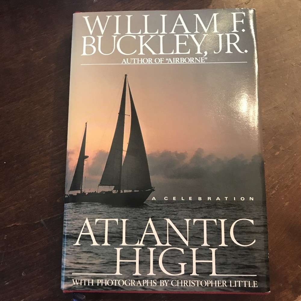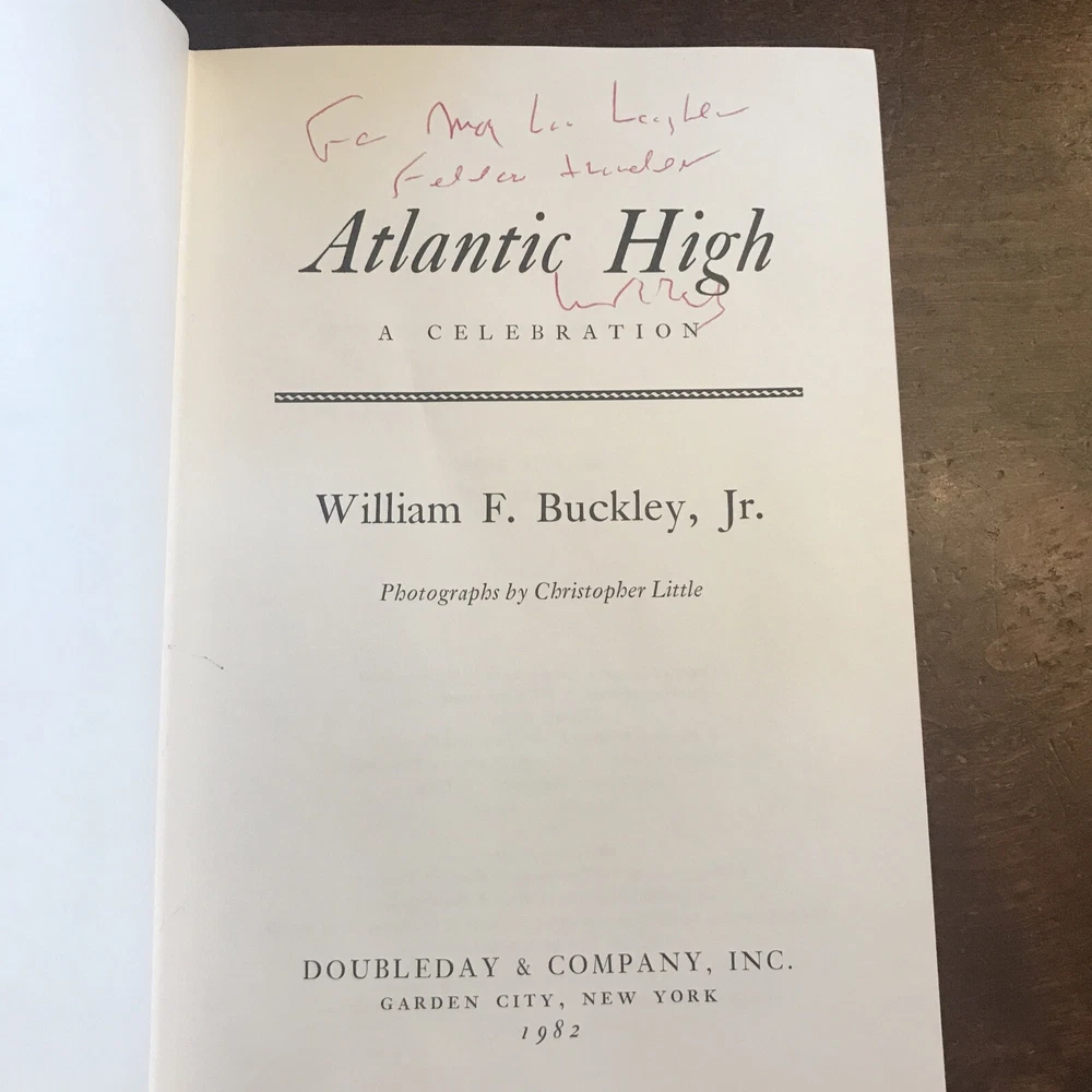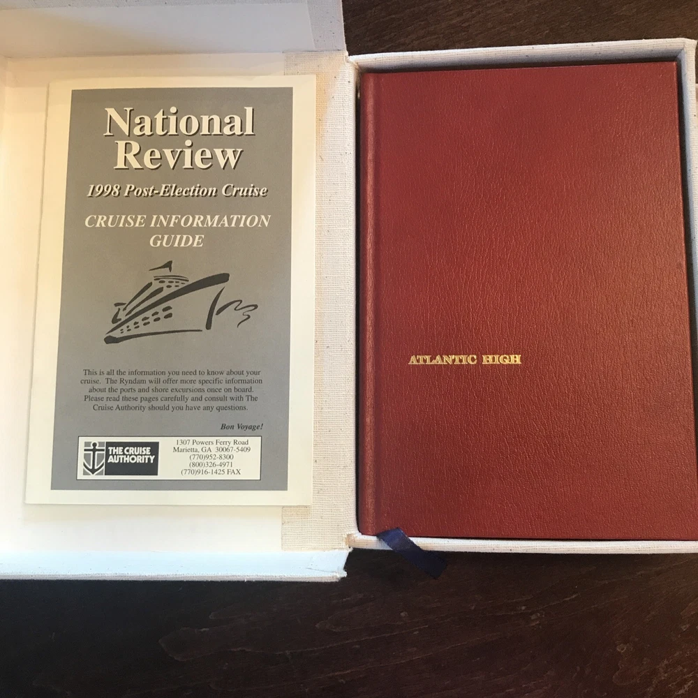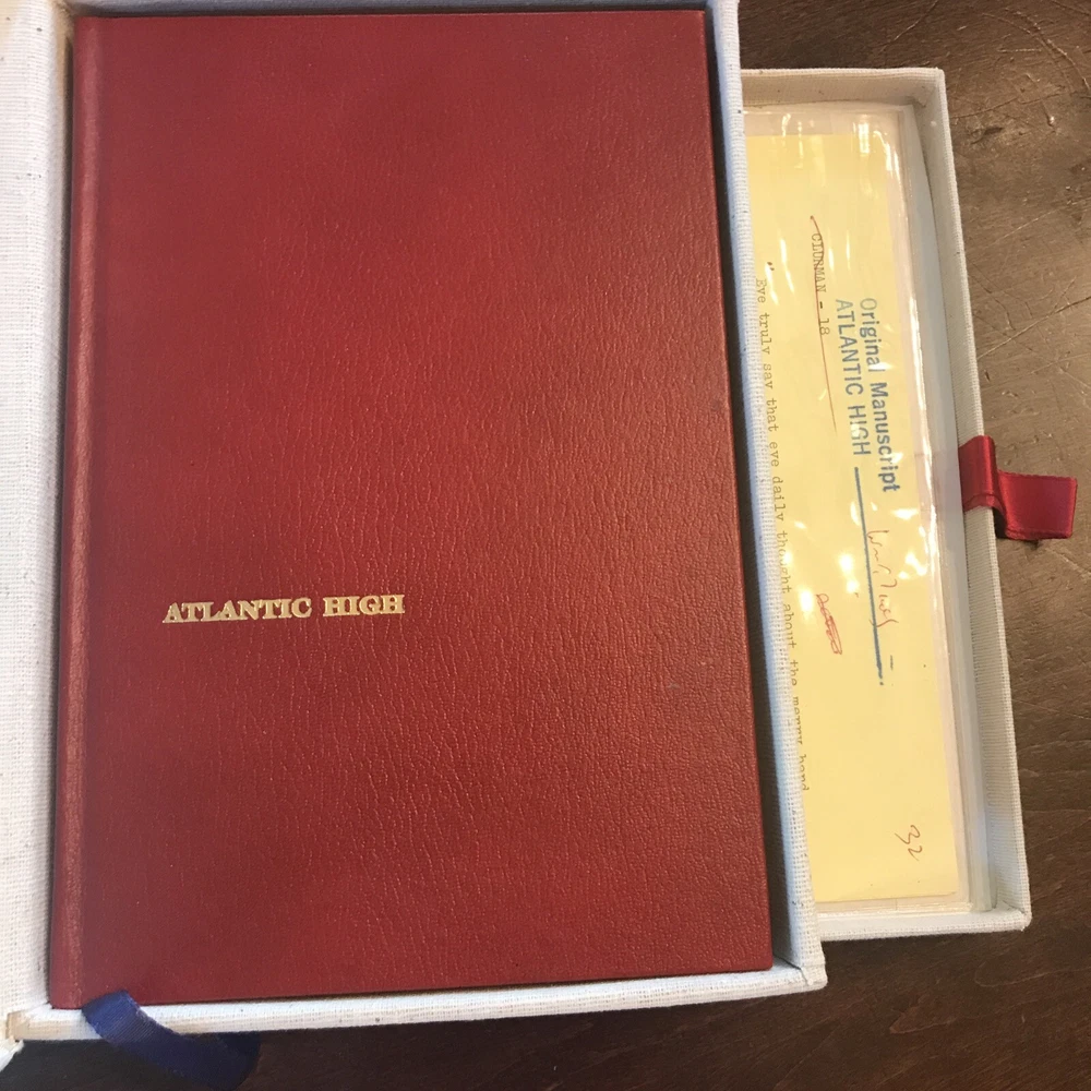 William F. Buckley Jr. – Atlantic High – Signed First Edition, Special 1982 Issue + Manuscript Doubleday, 1982 This is a special signed edition of Atlantic High by William F. Buckley Jr., issued in 1982 and housed in a custom clamshell box . F irst edition , full red leather boards with gilt titles and page edges . I llustrated endpapers , blue silk ribbon marker , and the original dust jacket in very good condition, save for a neat crease along the spine from being folded to fit inside the case. Inside the clamshell, a pull-out drawer holds page 32 of the book’s original manuscript , signed by Buckley at the top and showing his handwritten edits . The page is protected in a clear sleeve. Buckley has also signed the title page , inscribed: “For [obscure], fellow traveler.” Also tucked into the case is a 1998 National Review Post-Election Cruise Guide —a bit of extra Buckley-related ephemera. An uncommon and well-presented edition, especially appealing for collectors interested in Buckley, sailing, or political writing with a personal touch.