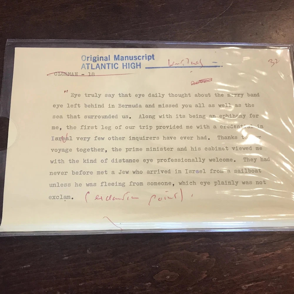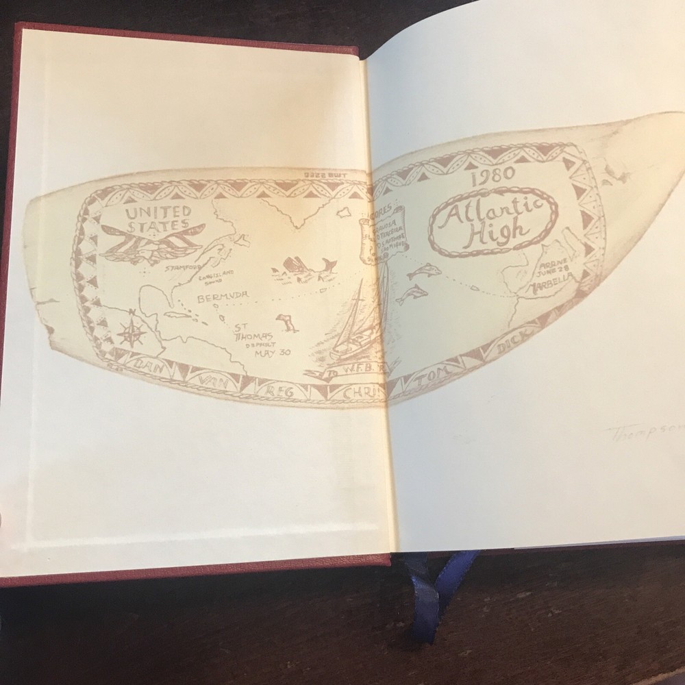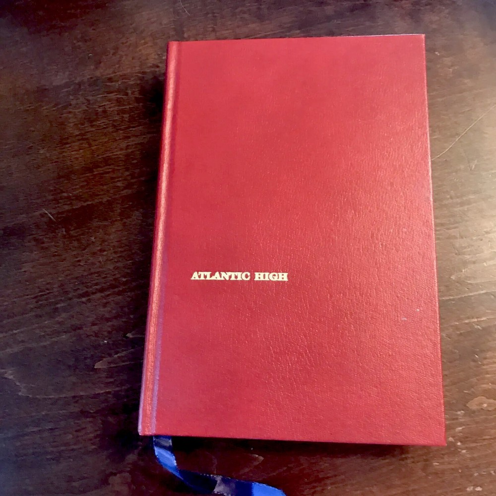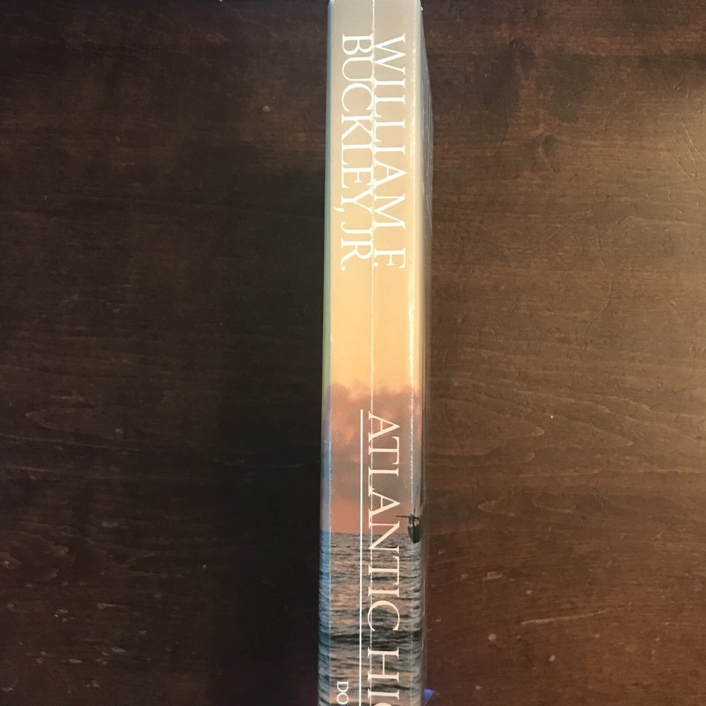 William F. Buckley Jr. – Atlantic High – Signed First Edition, Special 1982 Issue + Manuscript Doubleday, 1982 This is a special signed edition of Atlantic High by William F. Buckley Jr., issued in 1982 and housed in a custom clamshell box . F irst edition , full red leather boards with gilt titles and page edges . I llustrated endpapers , blue silk ribbon marker , and the original dust jacket in very good condition, save for a neat crease along the spine from being folded to fit inside the case. Inside the clamshell, a pull-out drawer holds page 32 of the book’s original manuscript , signed by Buckley at the top and showing his handwritten edits . The page is protected in a clear sleeve. Buckley has also signed the title page , inscribed: “For [obscure], fellow traveler.” Also tucked into the case is a 1998 National Review Post-Election Cruise Guide —a bit of extra Buckley-related ephemera. An uncommon and well-presented edition, especially appealing for collectors interested in Buckley, sailing, or political writing with a personal touch.