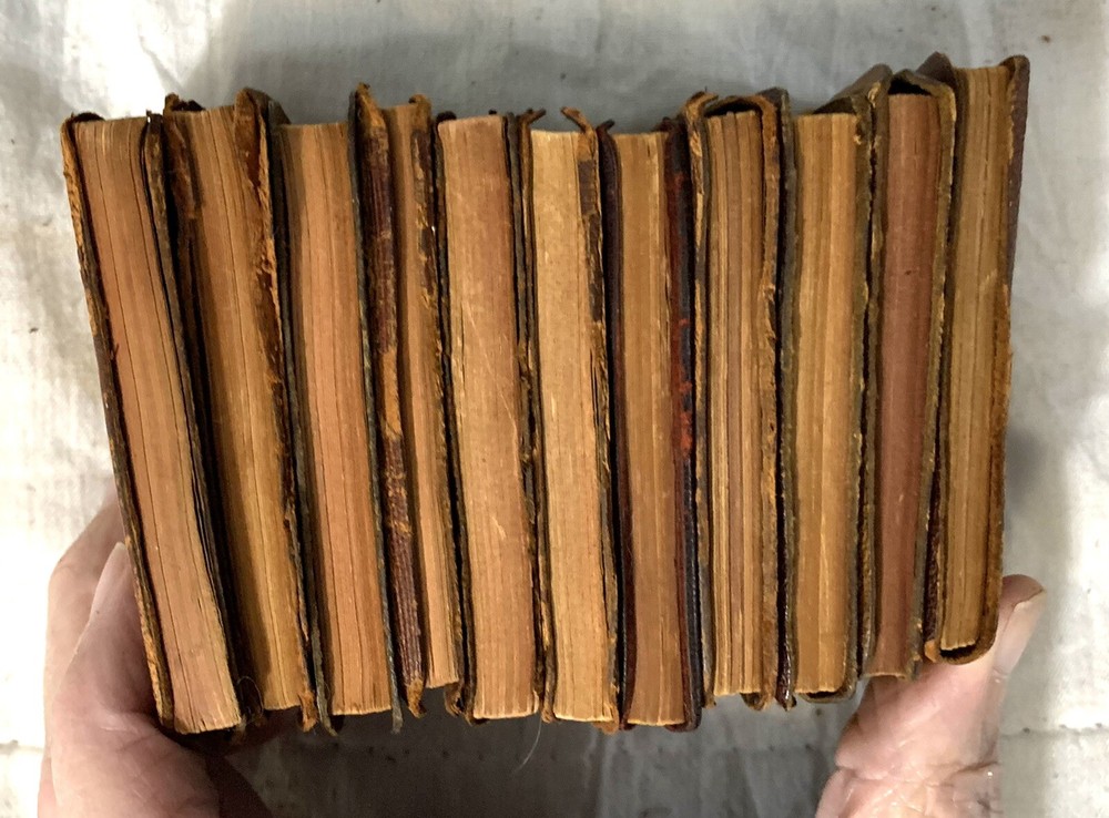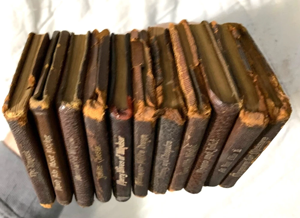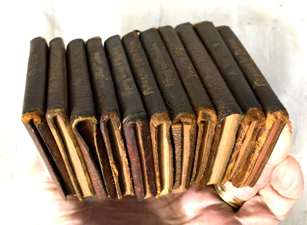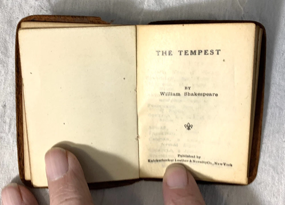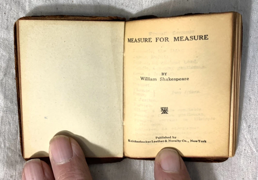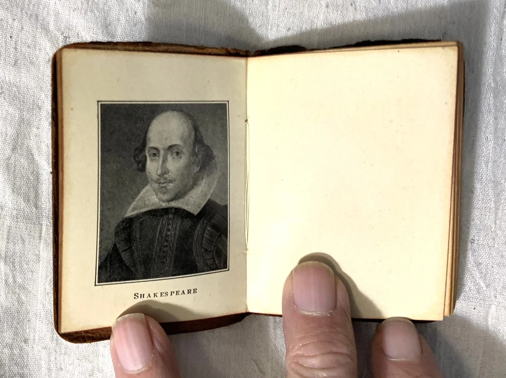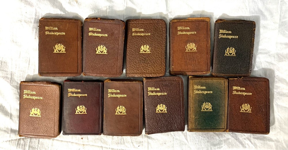 William Shakespeare 11 Miniature Gold Gilt Leather Bound Books Knickerbocker Co. These mini books are in fair to good condition. Books are about 3-1/8” tall Good condition leather bound books. Bindings are clean square and tight. Wear to the spine ends, corners, and edges. Some worn less than others. Pages are clean with no handwriting or tears. Titles: Much Ado About Nothing Merchant of Venice Julius Caesar Merry Wives of Windsor Midsummer Nights Dream Antony and Cleopatra Twelfth Night Romeo and Juliet As You Like It Measure for Measure The Tempest