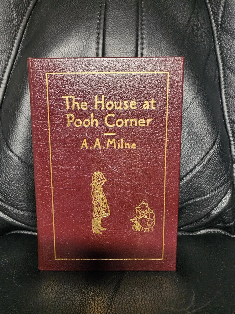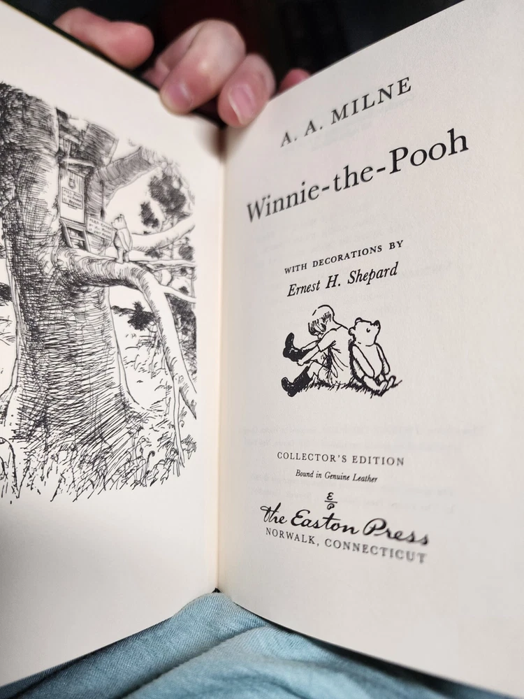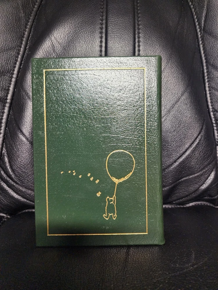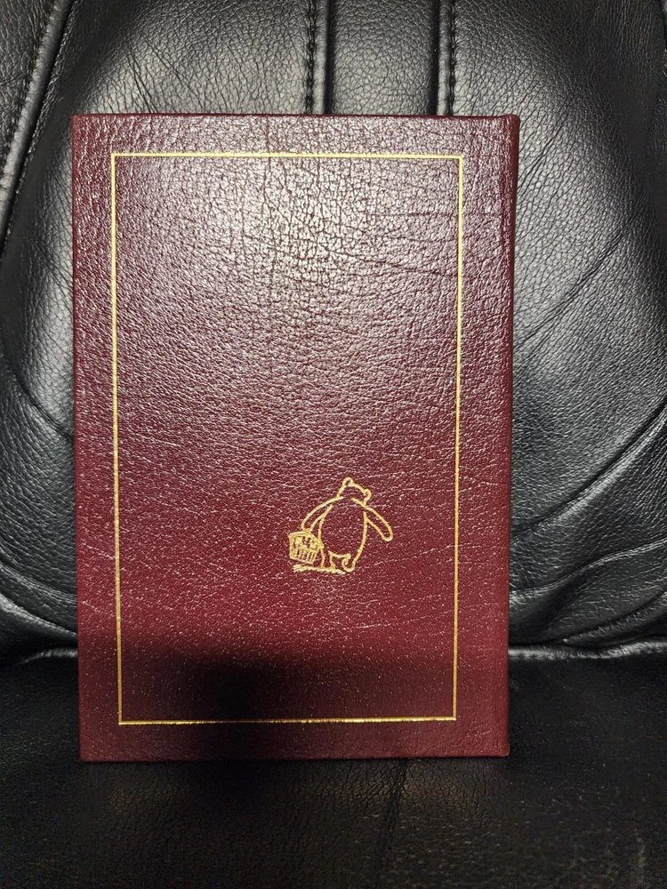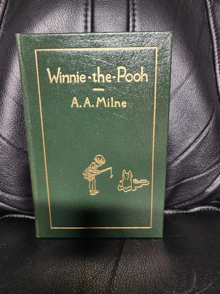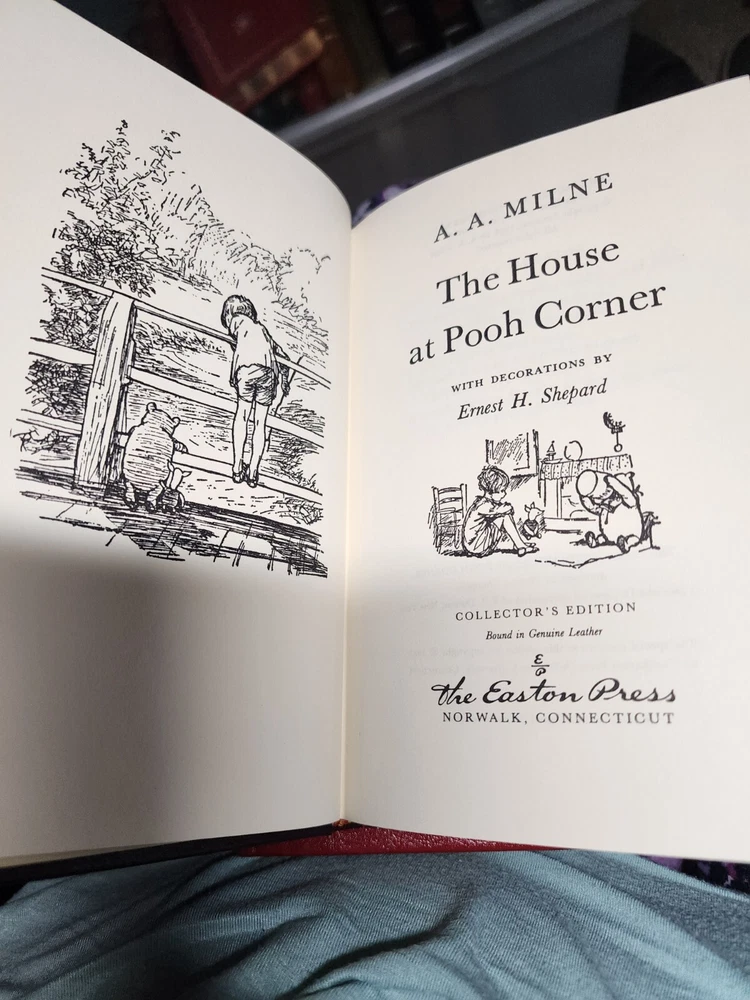 This product is a complete set of 4 leather-bound editions of the classic children's book series "Winnie-the-Pooh" by A.A. Milne, published by Easton Press. Each book features gold-gilded page edges, making them a collector's edition. The illustrations are in English and the special attributes make these books a charming addition to any book collection, perfect for fans of children's literature and classic tales. Made in the United States, these beautifully crafted books are a timeless treasure for readers of all ages. Slight damage to gilting, see photos. Never read. Bookmark in factory position. What is pictured is what you get.