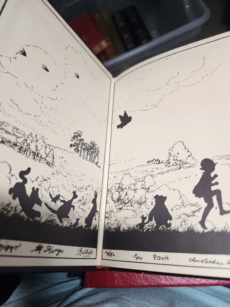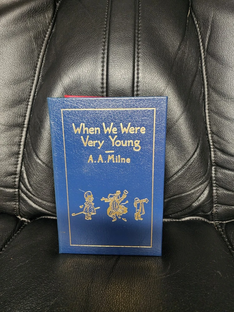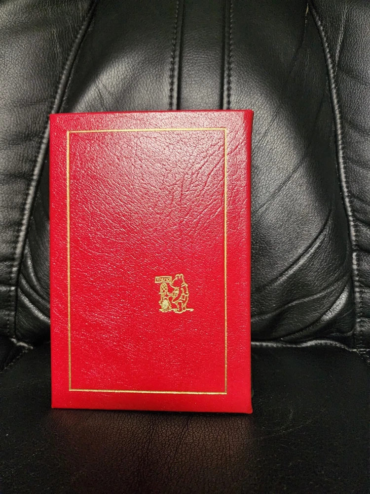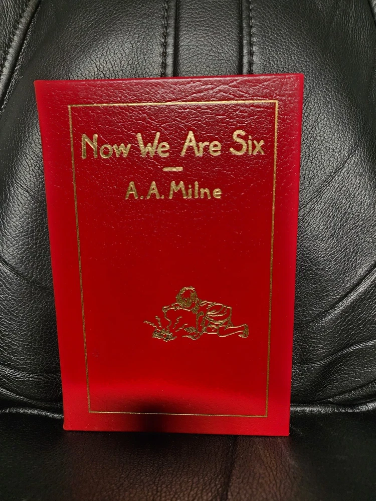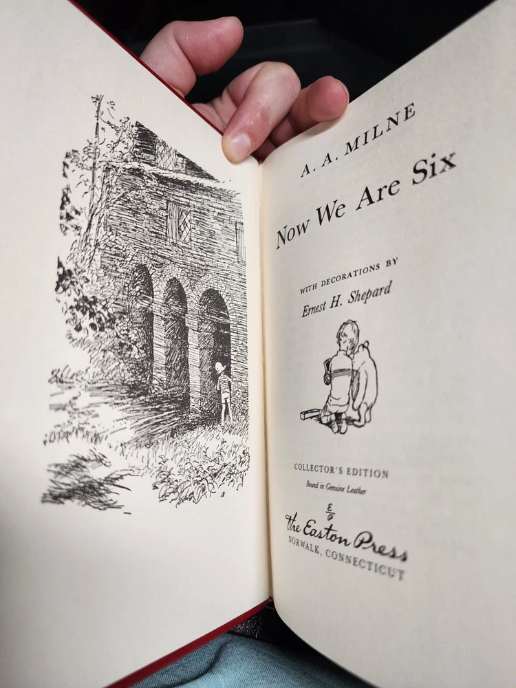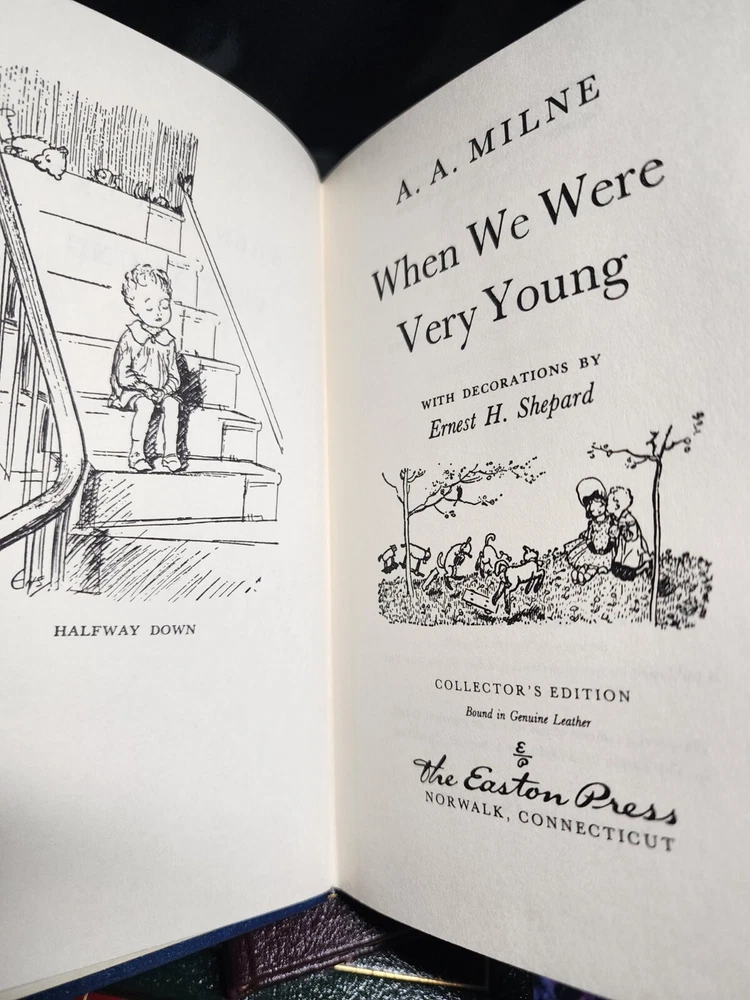 This product is a complete set of 4 leather-bound editions of the classic children's book series "Winnie-the-Pooh" by A.A. Milne, published by Easton Press. Each book features gold-gilded page edges, making them a collector's edition. The illustrations are in English and the special attributes make these books a charming addition to any book collection, perfect for fans of children's literature and classic tales. Made in the United States, these beautifully crafted books are a timeless treasure for readers of all ages. Slight damage to gilting, see photos. Never read. Bookmark in factory position. What is pictured is what you get.