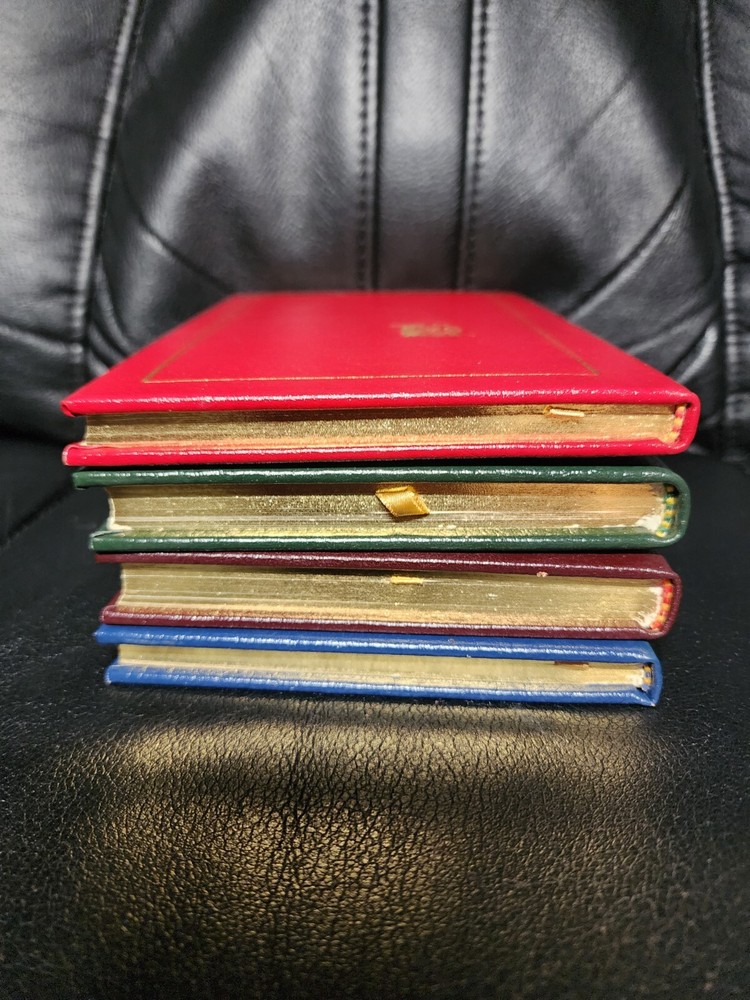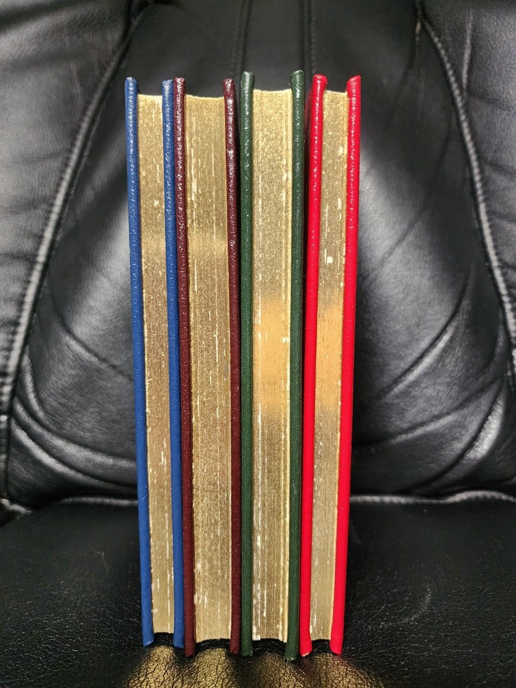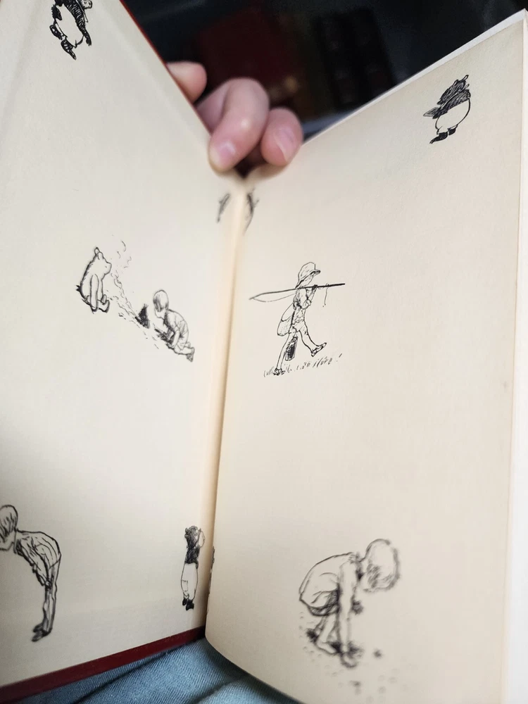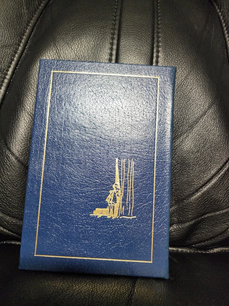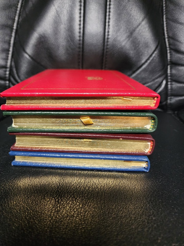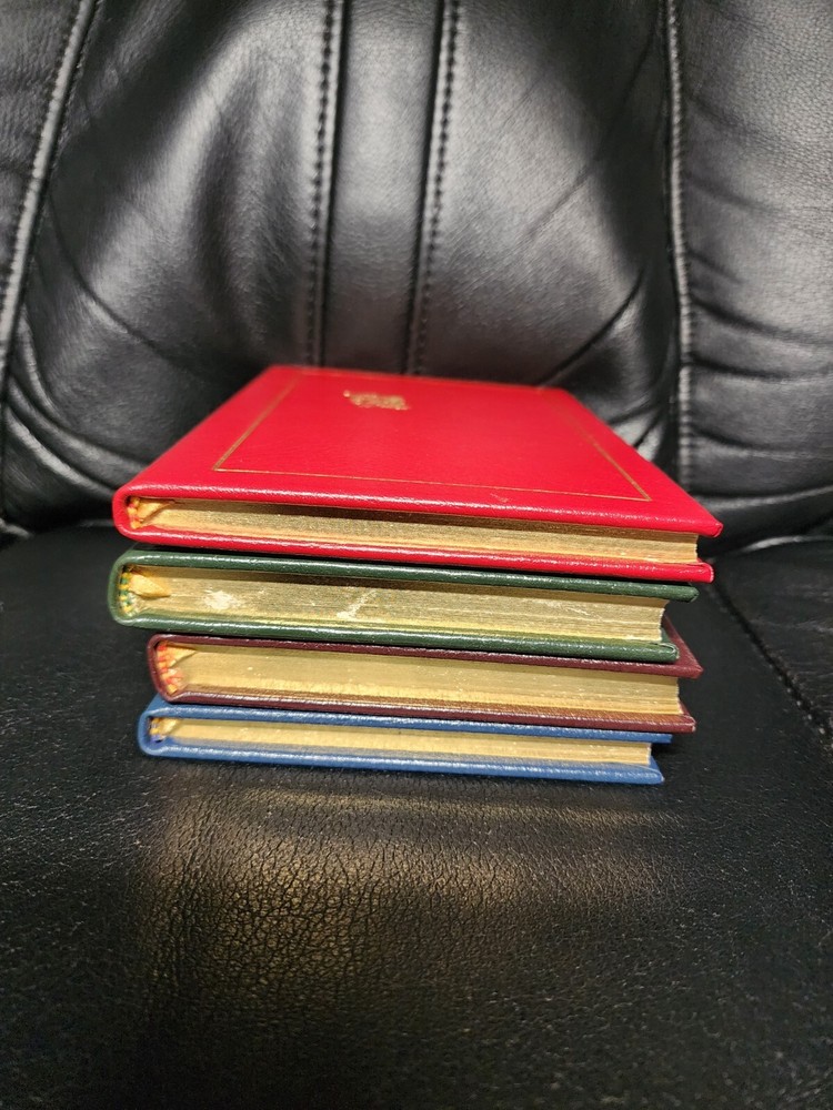 This product is a complete set of 4 leather-bound editions of the classic children's book series "Winnie-the-Pooh" by A.A. Milne, published by Easton Press. Each book features gold-gilded page edges, making them a collector's edition. The illustrations are in English and the special attributes make these books a charming addition to any book collection, perfect for fans of children's literature and classic tales. Made in the United States, these beautifully crafted books are a timeless treasure for readers of all ages. Slight damage to gilting, see photos. Never read. Bookmark in factory position. What is pictured is what you get.