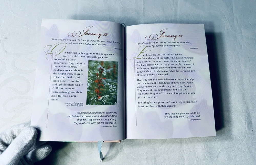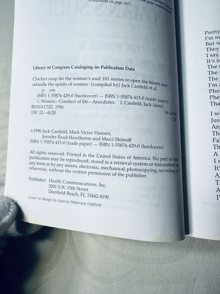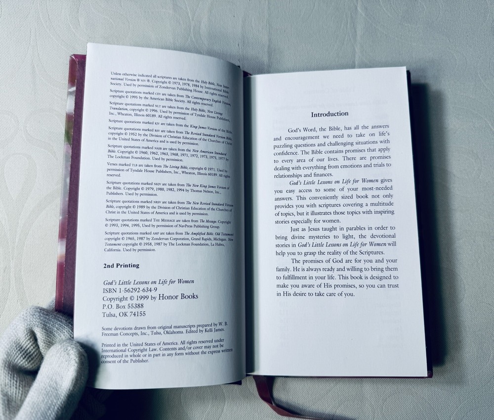 Lot x8 of vintage through contemporary devotions, inspirational reading and Christian books for women. 1995 God’s Little Lessons on Life for Women. Hardcover. Built-in ribbon bookmark. 2013 A Mother’s Daily Prayer Book. Built-in ribbon bookmark and hummingbird charm centered amid faux leather design. Hardcover. Inscribed inside front cover (pictured). No other writing. 1996 Chicken Soup for the Woman’s Soul. Paperback. No writing. 2005 Captivating: Unveiling the Mystery of a Woman’s Soul. Hardcover with dust jacket. No writing. 1975 Guideposts Edition. How Can I Find You, God? by Marjorie Holmes. Hardcover with dust jacket. No writing. 1993 2nd printing. Joy for the Heart by Helen Steiner Rice. Hardcover with dust jacket. No writing. 2005 1st edition. Change Your Mind and Your Life Will Follow by Karen Casey. Hardcover with dust jacket. No writing. 2001 1st edition. Wake-Up Calls: Making the Most Out of Every Day by Joan Lunden. Hardcover with dust jacket. No writing.