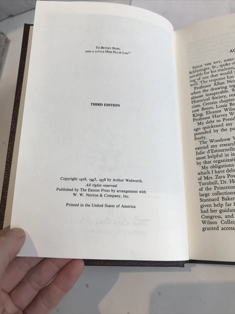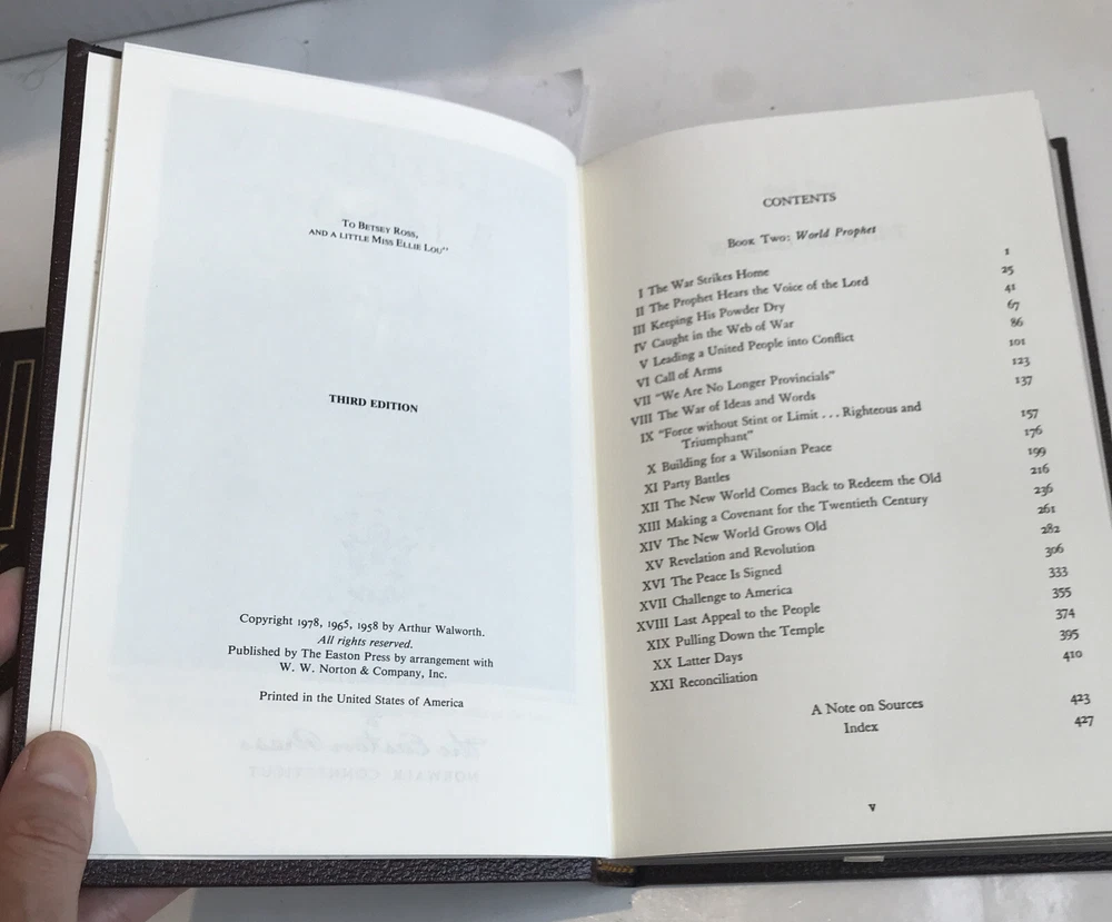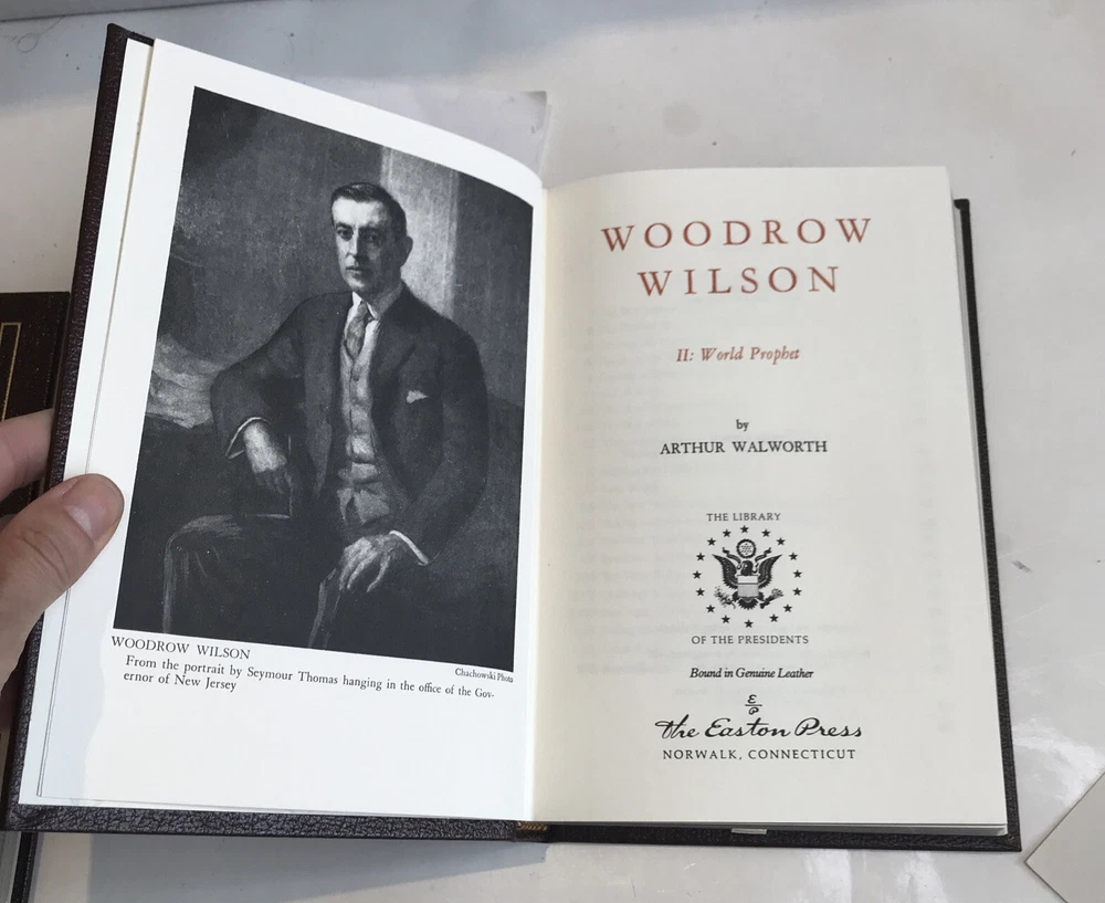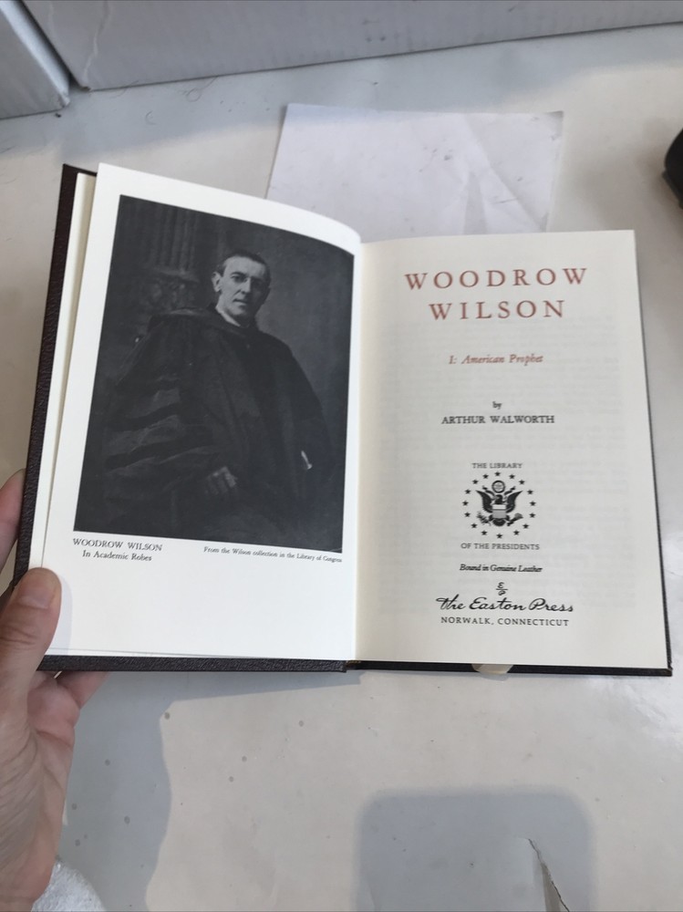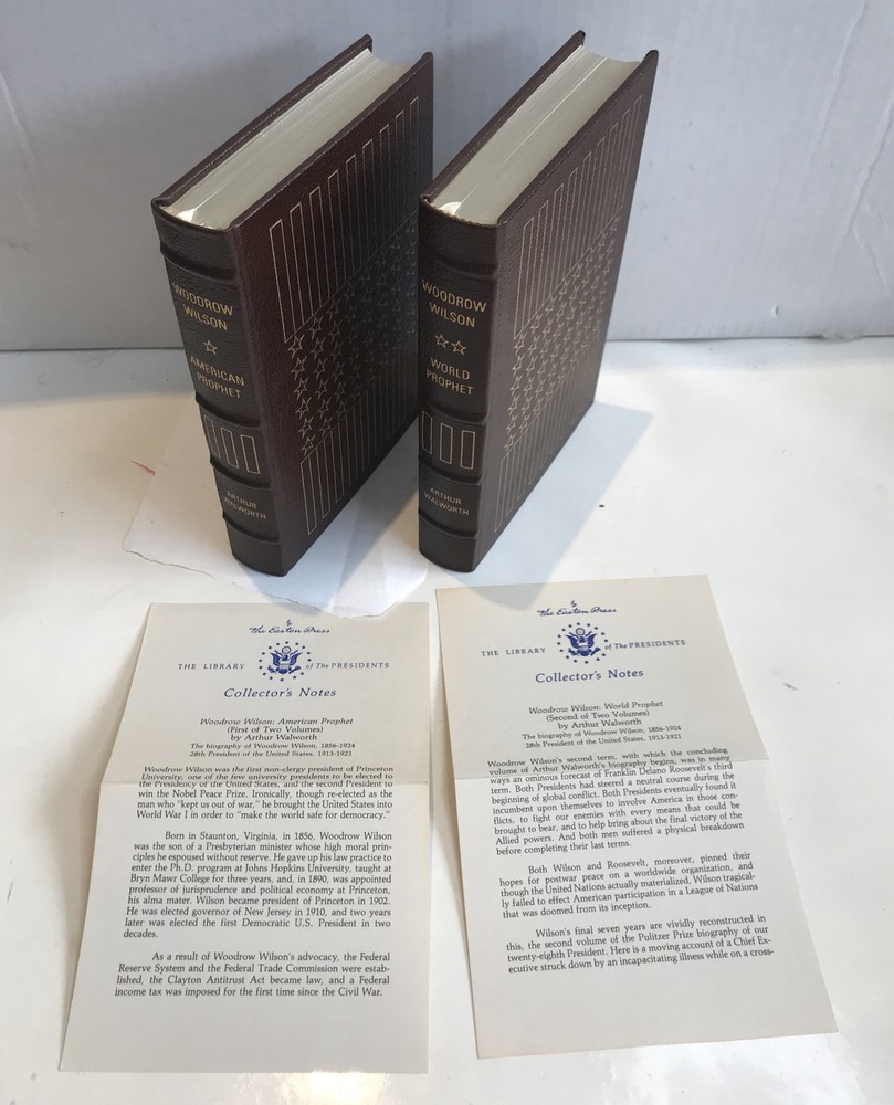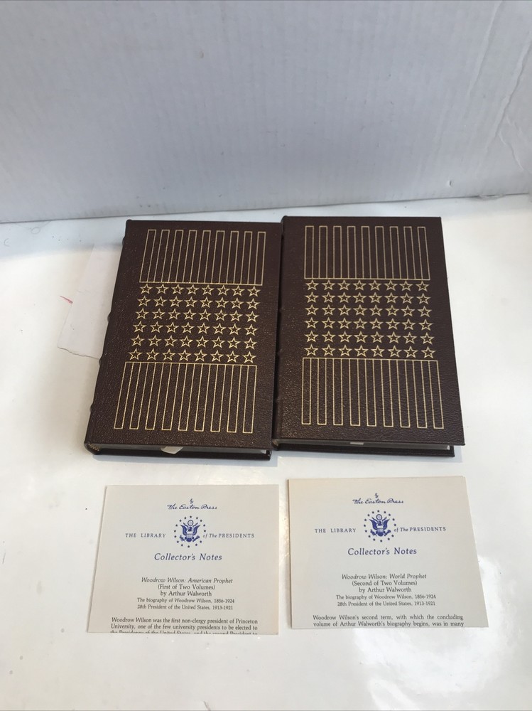 Woodrow Wilson: American Prophet and World Prophet [Easton Press - 2 Volume Set] Preowned Good condition Both Books have former owners bookplate affixed front board on inside . (see photos) Light wear to gold gild around pages both books come with Easton press collectors notes American prophet book has leather missing at bottom corner ( see photos)