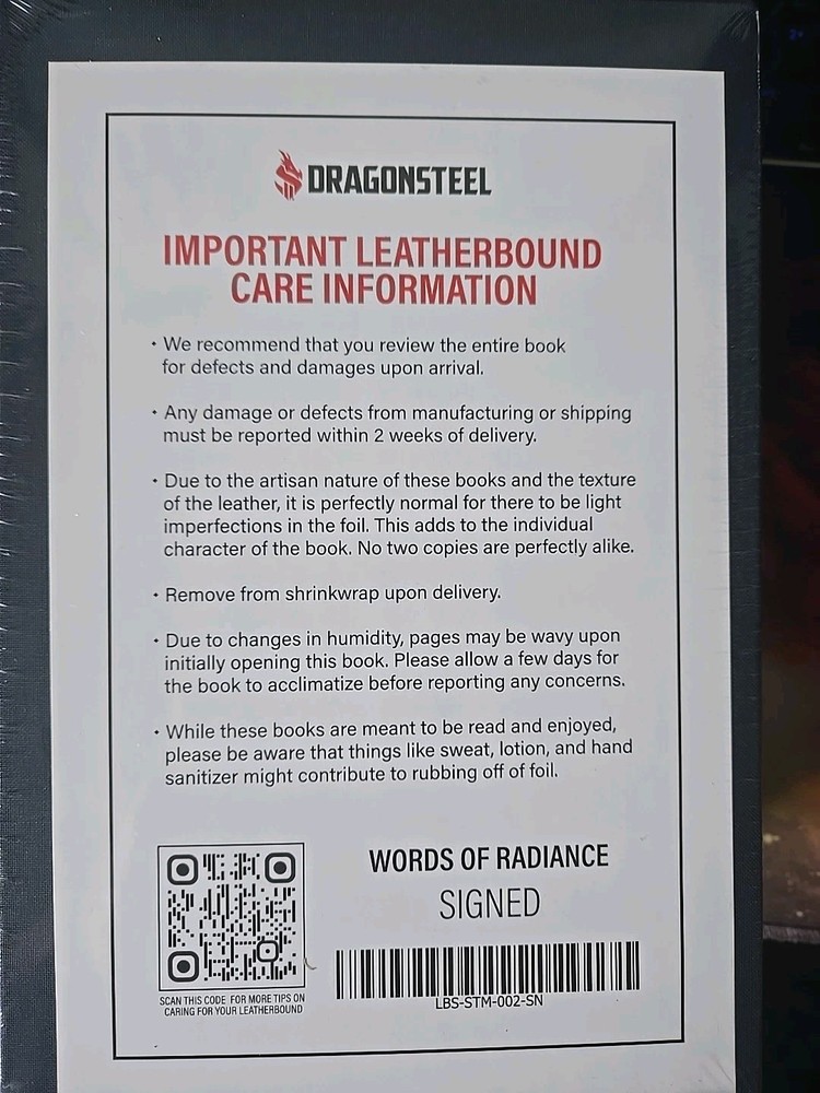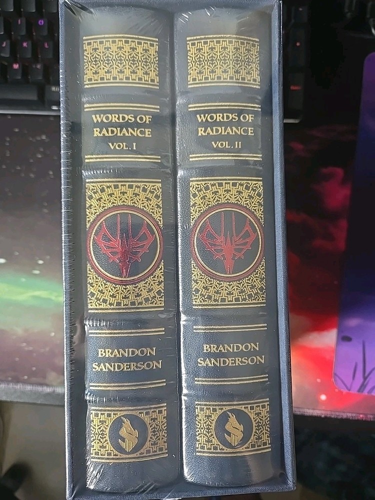 Comes with the signed two volume Words of Radiance set from Brandon Sandersons Kickstarter, as well as the Willshaper Swag set This Words of Radiance 2-Vol set is a must-have for any fantasy lover. The leather-bound box set is signed by the author, Brandon Sanderson, and includes Willshaper swag. The set is sealed and in perfect condition. The set is published by Dragonsteel, LLC and is the tenth anniversary edition of Book Two of The Stormlight Archive. The genre is fiction and the topic is fantasy. This set is in English and has a publication year of 2023. Get your hands on this beautiful set today!