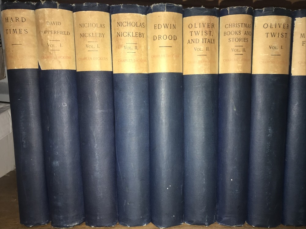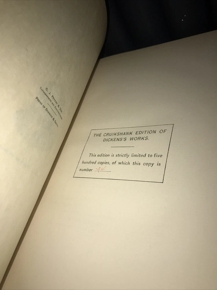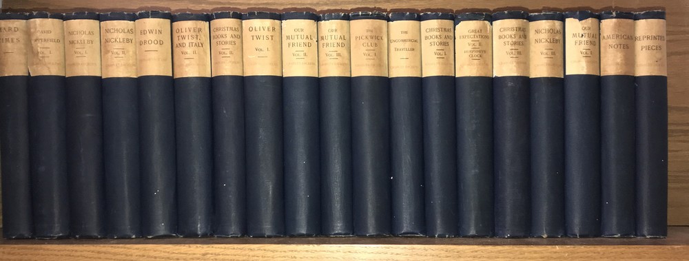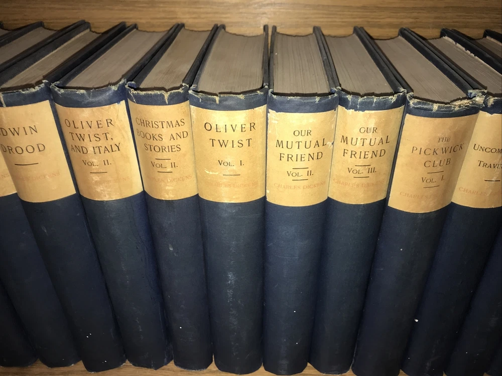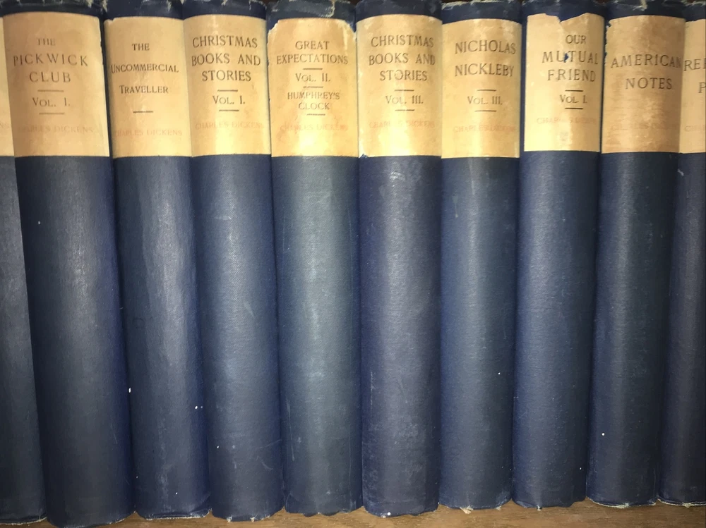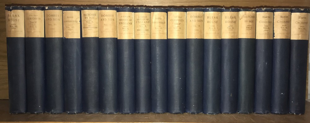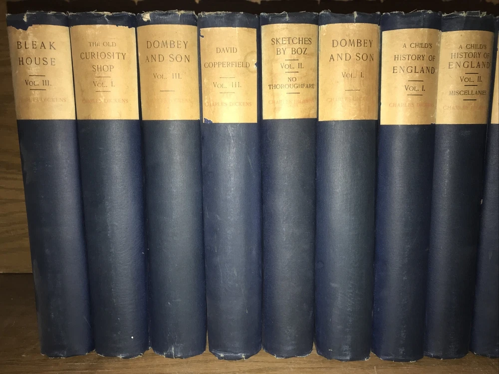 The Works of CHARLES DICKENS! 44 volumes out of 45. NOT COMPLETE. Missing one volume of: ATale of Two Cities. This is a really good reading set. This is a massive collection. Printed on high grade rag paper. These are a pleasure to read. Cruikshank Edition. 1 of 500 sets. Set #34. Set is supposed to be 45-volumes. Printed in 1890. This is a MASSIVE COLLECTION.This set is not complete. Works of Charles Dickens. Illustrated with plates. Bound in the publisher's original blue cloth. Top edge gilded. These are extremely large and heavy books.Approximately 9 inches tall. These are large books. Not complete. Estes & Lauriat, Boston. Printed in 1890. A gorgeous set. Printed on extremely high quality paper. These are a pleasure to read. Vet good+ interior. Very Good overall with generalized shelf wear and abrasions. Damage at spine heads. All hinges are all fully attached. Interior is very fresh. Hinges attached. Light general rubbing. Interior is clean. Free of foxing. Early inscription. Edition de Luxe. Includes wide margins.Illustrated with full page plates, protected with tissue. A quality, and particularly large collection that would be a pleasure to read. Missing one book. SET SHOULD HAVE THE FOLLOWING: David Copperfield Vol. 1 David Copperfield Vol. 2 Our Mutual Friend Vol. 1 Our Mutual Friend Vol. 2 Our Mutual Friend Vol. 3 Christmas Books and Stories Vol. 1 Christmas Books and Stories Vol. 2 Christmas Books and Stories Vol. 3 Nicholas Nickleby Vol. 1 Nicholas Nickleby Vol. 2 Nicholas Nickleby Vol. 3 Dombey and Son Vol. 1 Dombey and Son Vol. 2 Dombey and Son Vol. 3 Pickwick Papers Vol. 1 Pickwick Papers Vol. 2 Pickwick Papers Vol. 3 Oliver Twist Vol. 1 Oliver Twist Vol. 2 Bleak House Vol. 1 Bleak House Vol. 2 Old Curiosity Shop Vol. 1 Old Curiosity Shop Vol. 2 Little Dorrit Vol. 1 Little Dorrit Vol. 2 Little Dorrit Vol. 3 A Child's History of England Barnaby Rudge Vol. 1 Barnaby Rudge Vol. 2 Tale of Two Cities Great Expectations Vol. 1 Great Expectations Vol. 2 / Humphrey's Clock American Notes / Hunted Down A Child's History of England Vol. 1 A Child's History of England Vol. 2 / Miscellaneous Sketches by Boz Vol. 1 Sketches by Boz Vol. 2 / No Thoroughfare Hard Times The Uncommercial Traveller Martin Chuzzlewit Vol. 1 Martin Chuzzlewit Vol. 2 Martin Chuzzlewit Vol. 3 Martin Chuzzlewit Vol. 4 Edwin Drood Reprinted Pieces Each book will be individually wrapped and professionally padded for shipping. (2022.03.24 19 h, 2022.04.05 8 h, 2022.04.07h) February 1812 – 9 June 1870) was an English writer and social critic. He created some of the world's best-known fictional characters and is regarded as the greatest novelist of the Victorian era.[1] His works enjoyed unprecedented popularity during his lifetime, and by the twentieth century critics and scholars had recognised him as a literary genius. His novels and short stories enjoy lasting popularity.[2][3] Born in Portsmouth, Dickens left school to work in a factory when his father was incarcerated in a debtors' prison. Despite his lack of formal education, he edited a weekly journal for 20 years, wrote 15 novels, five novellas, hundreds of short stories and non-fiction articles, lectured and performed extensively, was an indefatigable letter writer, and campaigned vigorously for children's rights, education, and other social reforms. Dickens's literary success began with the 1836 serial publication of The Pickwick Papers . Within a few years he had become an international literary celebrity, famous for his humour, satire, and keen observation of character and society. His novels, most published in monthly or weekly instalments, pioneered the serial publication of narrative fiction, which became the dominant Victorian mode for novel publication.[4][5] The instalment format allowed Dickens to evaluate his audience's reaction, and he often modified his plot and character development based on such feedback.[5] For example, when his wife's chiropodist expressed distress at the way Miss Mowcher in David Copperfield seemed to reflect her disabilities, Dickens improved the character with positive features.[6] His plots were carefully constructed, and he often wove elements from topical events into his narratives.[7] Masses of the illiterate poor chipped in ha'pennies to have each new monthly episode read to them, opening up and inspiring a new class of readers.[8] Dickens was regarded as the literary colossus of his age.[9] His 1843 novella, A Christmas Carol , remains popular and continues to inspire adaptations in every artistic genre. Oliver Twist and Great Expectations are also frequently adapted, and, like many of his novels, evoke images of early Victorian London. His 1859 novel, A Tale of Two Cities , set in London and Paris, is his best-known work of historical fiction. Dickens's creative genius has been praised by fellow writers—from Leo Tolstoy to George Orwell and G. K. Chesterton—for its realism, comedy, prose style, unique characterisations, and social criticism. On the other hand, Oscar Wilde, Henry James, and Virginia Woolf complained of a lack of psychological depth, loose writing, and a vein of saccharine sentimentalism. The term Dickensian is used to describe something that is reminiscent of Dickens and his writings, such as poor social conditions or comically repulsive characters.[10] Contents [hide] 1Early years 2Journalism and early novels 3First visit to the United States 4Philanthropy 5Religious views 6Middle years 7Last years 8Second visit to the United States 9Farewell readings 10Death 11Literary style 11.1Characters 11.2Autobiographical elements 11.3Episodic writing 11.4Social commentary 11.5Literary techniques 12Reception 13Influence and legacy 14Notable works 15References 16Further reading 17External links 17.1Works 17.2Organizations and portals 17.3Museums 17.4Other Early yearsCharles Dickens's birthplace, 393 Commercial Road, Portsmouth2 Ordnance Terrace, Chatham, Dickens's home 1817 – May 1821[11] Charles John 