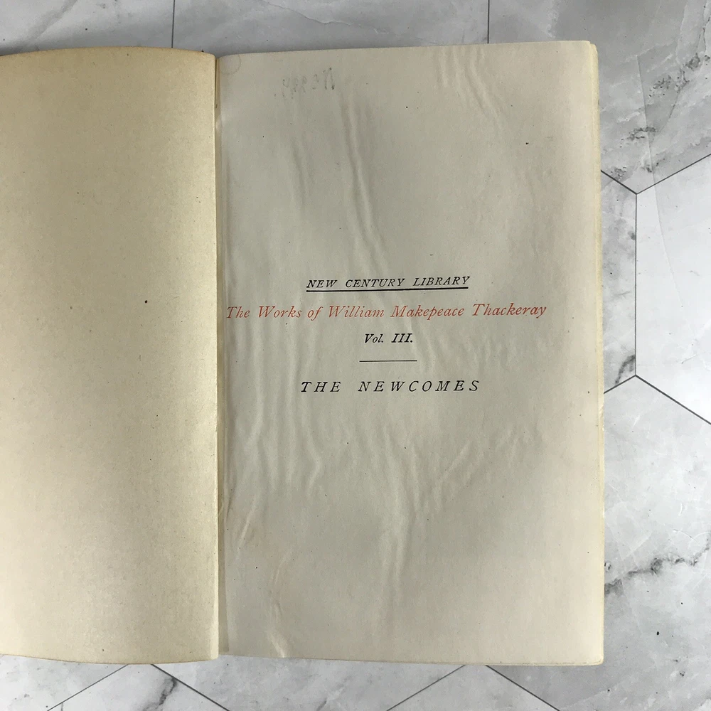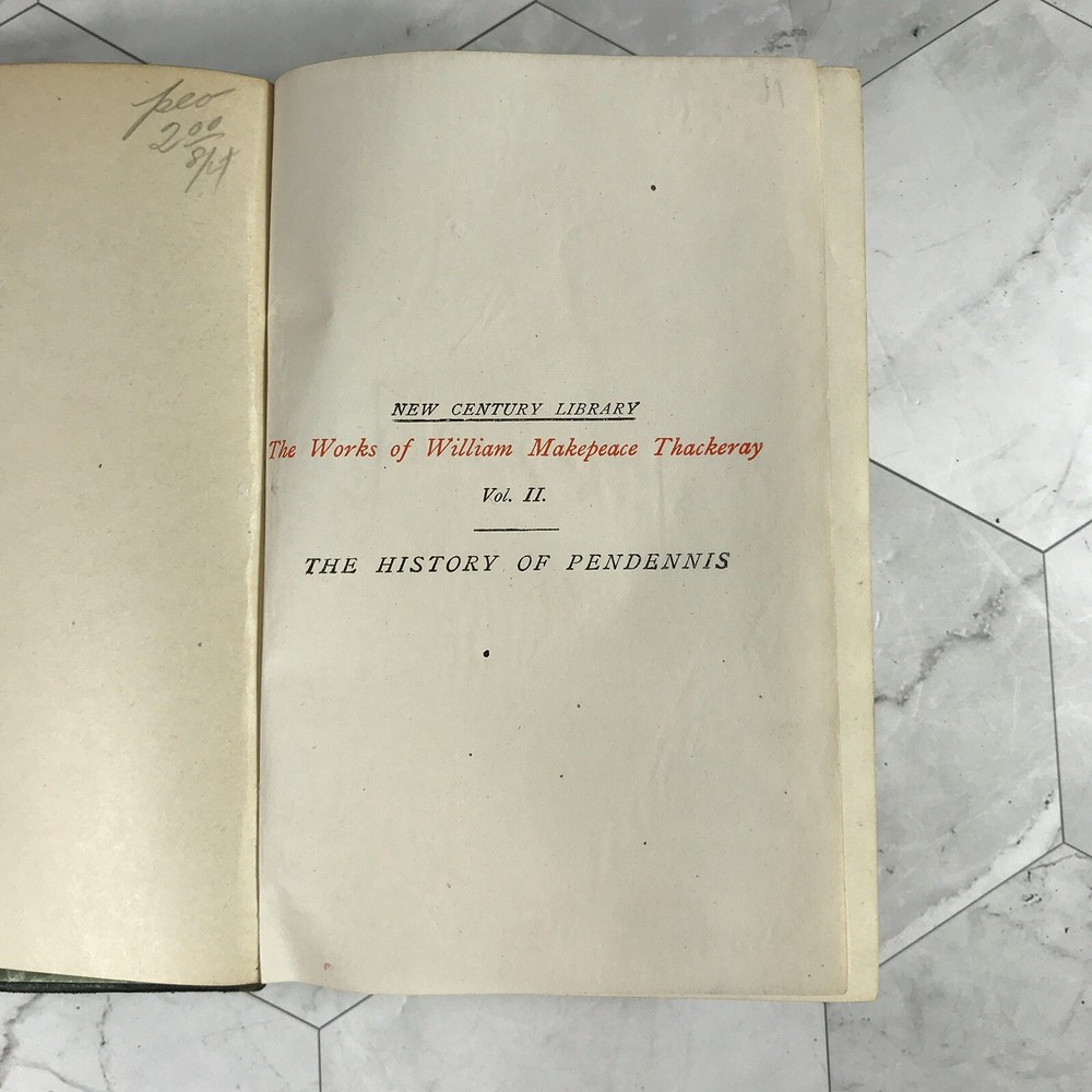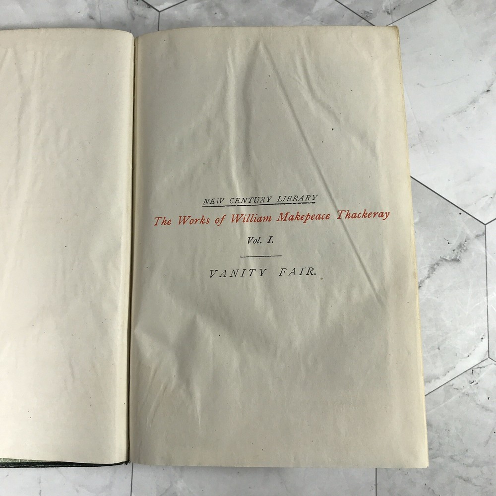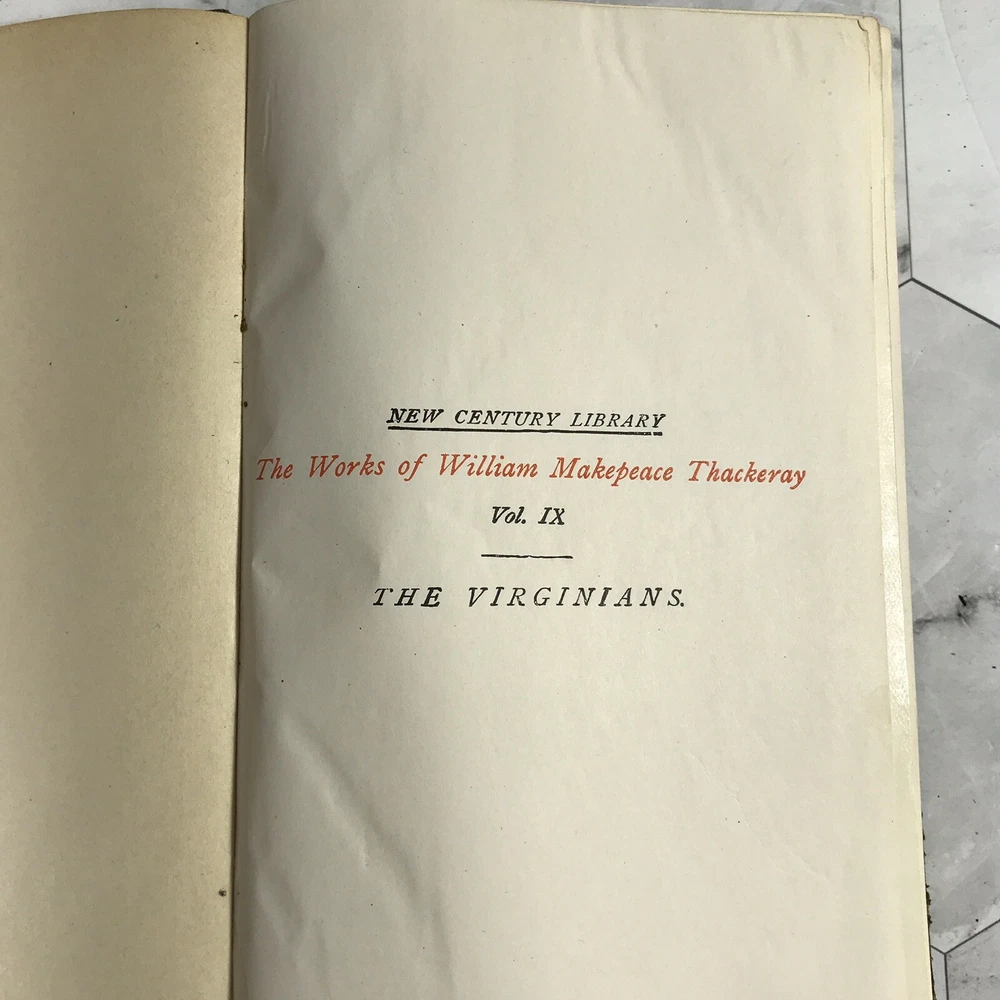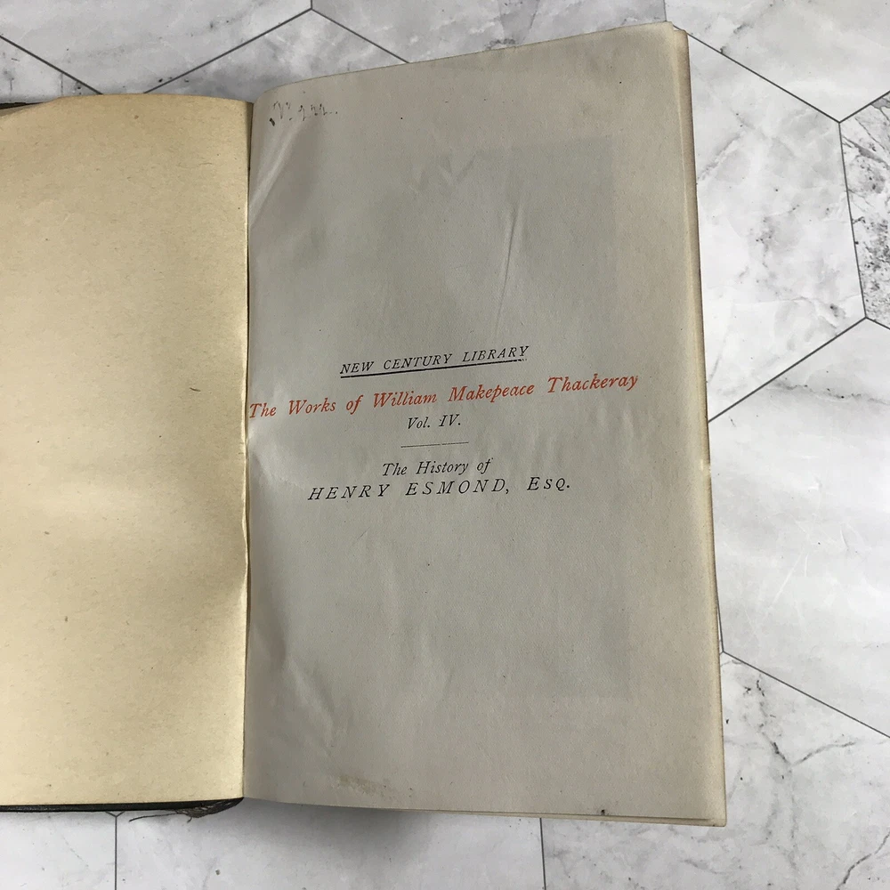 VTG Works Of Thackeray Set New Century Library Vanity Fair The Virginians Etc. Set of five antique small leather books from New Century Library. Set in sequence volumes 1-4, plus volume 9. Books in the set are as follows: Vol. 1 Vanity Fair. Vol. 2 The History of Pendennis. Vol. 3 The Newcomes. Vol. 4 The History of Henry Esmond, Esq. Edited by Thackeray. Vol. 9 The Virginians. Books measure about 6 1/4” x 4 1/4” each. Wear to the leather, some have folds or writing on first few pages, most interior pages in very good condition, some folds in a volume. Vol. 3 and 4 have placeholder ribbon attached, Vol. 2 has ribbon unattached but intact tucked between pages. Pre-owned with visible wear and damage. As-is. See photos.