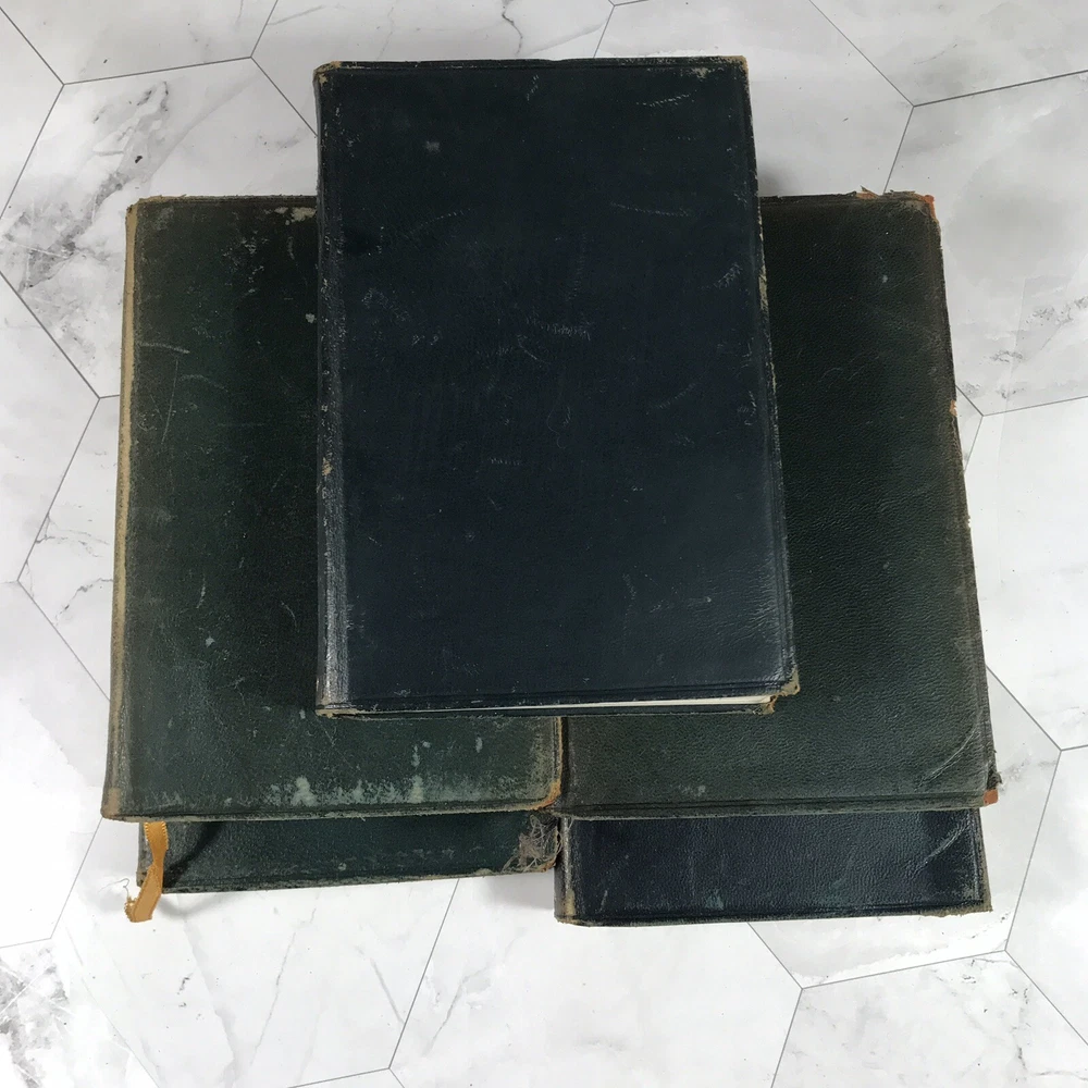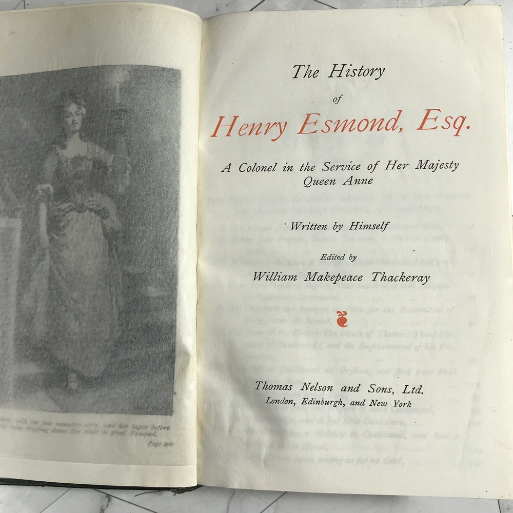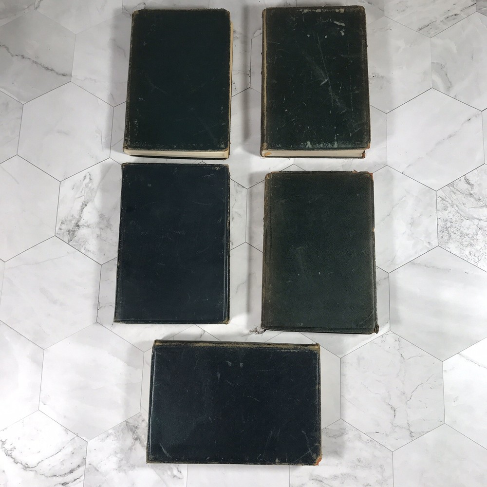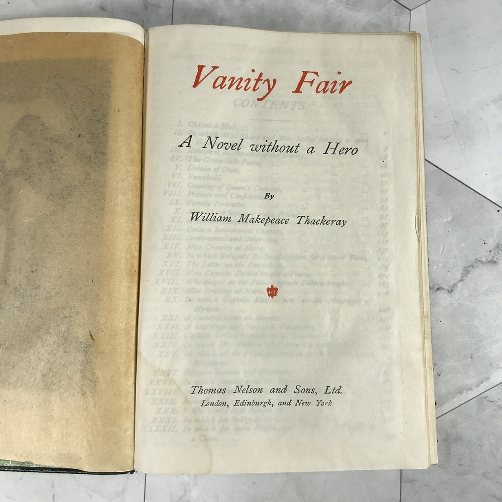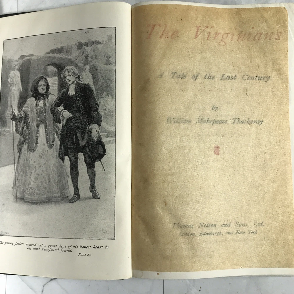 VTG Works Of Thackeray Set New Century Library Vanity Fair The Virginians Etc. Set of five antique small leather books from New Century Library. Set in sequence volumes 1-4, plus volume 9. Books in the set are as follows: Vol. 1 Vanity Fair. Vol. 2 The History of Pendennis. Vol. 3 The Newcomes. Vol. 4 The History of Henry Esmond, Esq. Edited by Thackeray. Vol. 9 The Virginians. Books measure about 6 1/4” x 4 1/4” each. Wear to the leather, some have folds or writing on first few pages, most interior pages in very good condition, some folds in a volume. Vol. 3 and 4 have placeholder ribbon attached, Vol. 2 has ribbon unattached but intact tucked between pages. Pre-owned with visible wear and damage. As-is. See photos.