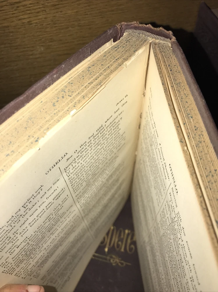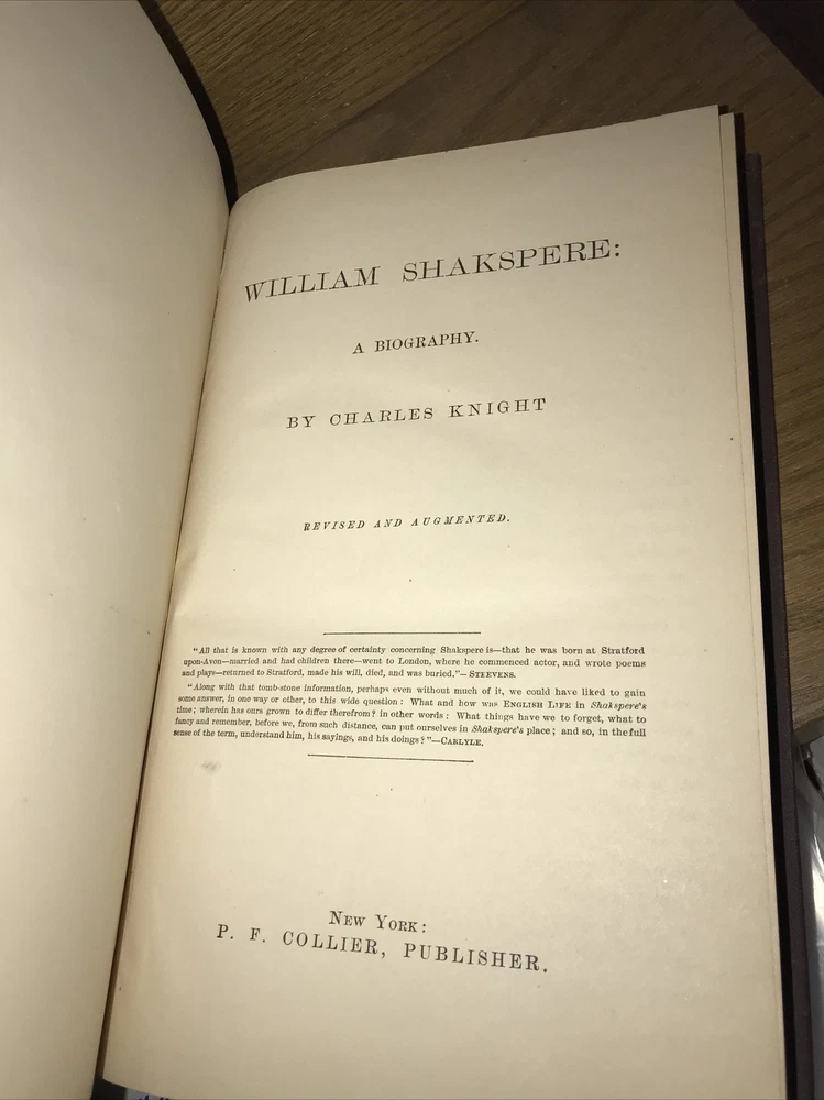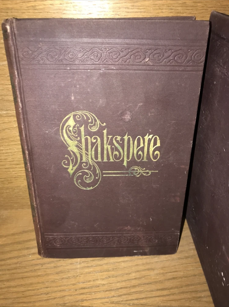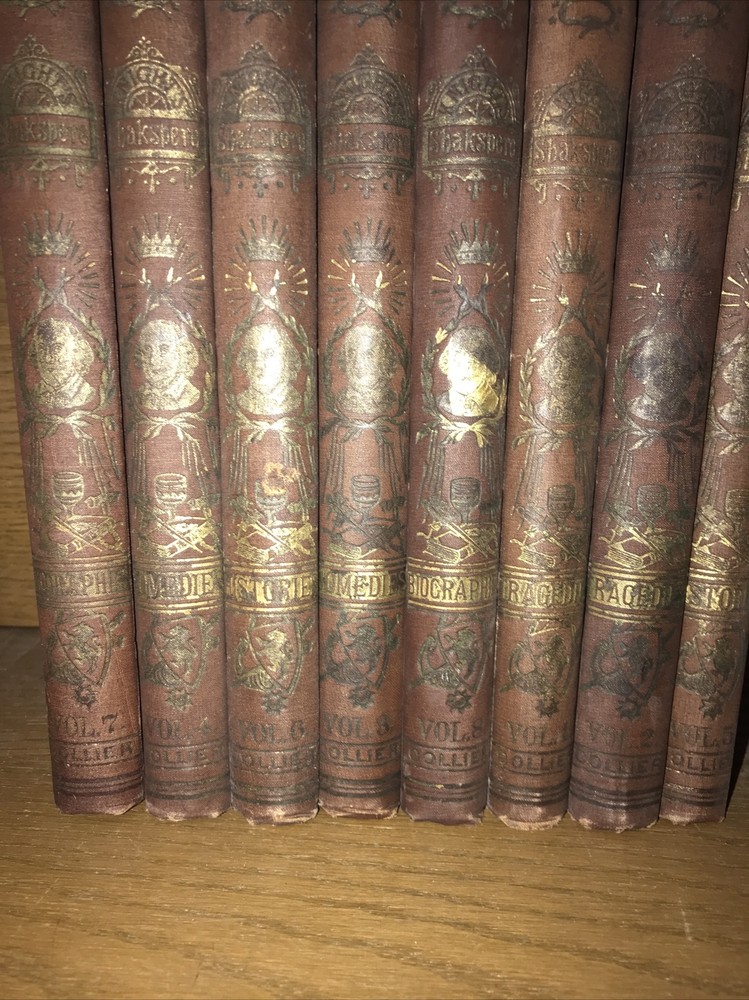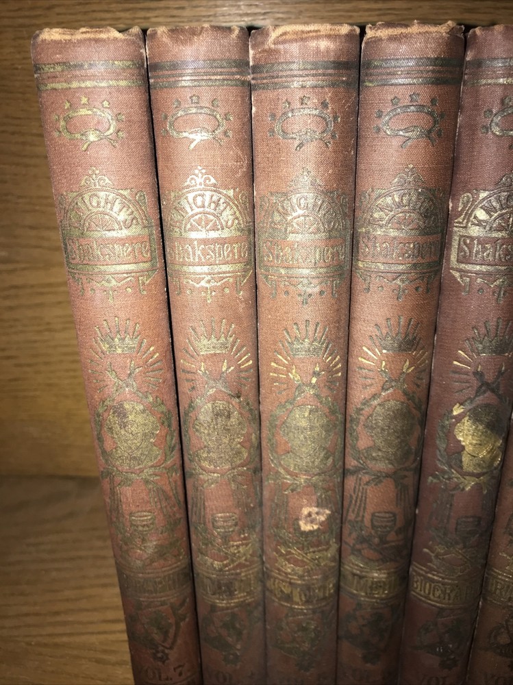 Complete in 8 volumes. Large volumes. Ten inches tall. Quality paper is still fresh, not brittle. Not dated on the title page. Published circa 1890-1910. Charles Knights’ pictorial Shakespeare. Heavily illustrated. The bindings are original. Generalized abrasion to the spines. The most wear is to the spines, they have a lot of the gilt abraded. Old 2- price in pencil on end papers. No owner names. Some generalized usage wear. It’s still a nice old set of Shakespeare. Still good as a reading set. The paper is good. I showed pictures of the worst condition. These will be well protected for shipping via Priority Mail. 2023.04