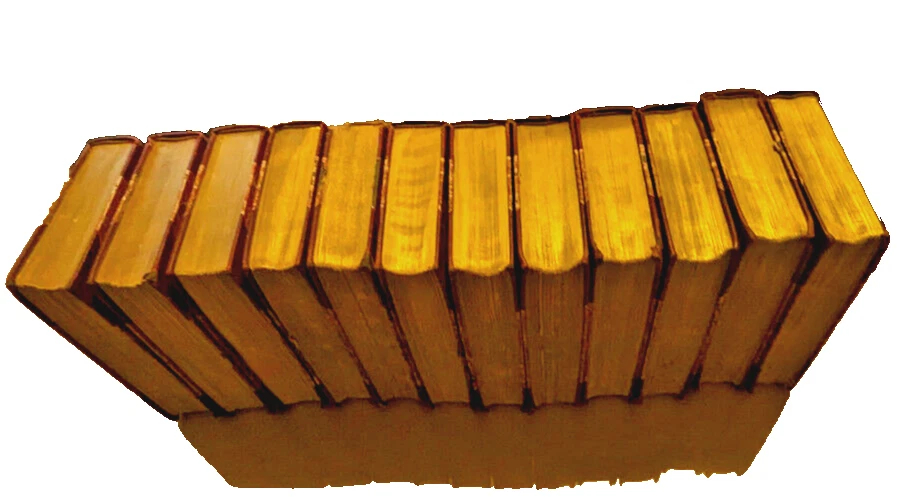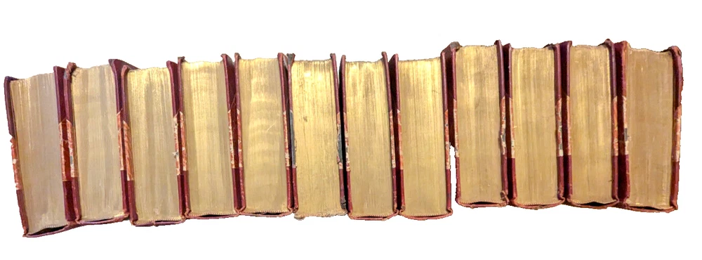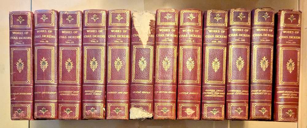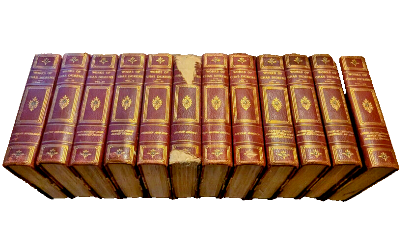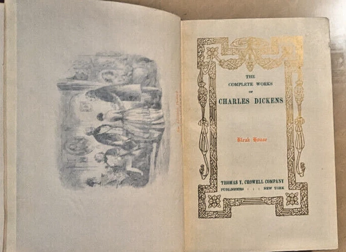 The set is old and not dated. The publisher is Thomas Y. Crowell & Co It is meant to be a 15 volume set but three are missing. One damaged volume, Bleak House , has its volume number missing. Top edge of all books is gilded Edges are deckle edges. gfl