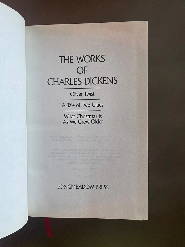 Works of Charles Dickens (1990 hardcover) Oliver Twist, A Tale of Two Cities .... Shoes some wear and rubbing. Some scratching to gold edge of pages. Has writing (personal message) on front inside cover. Please see pics.