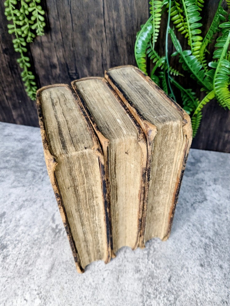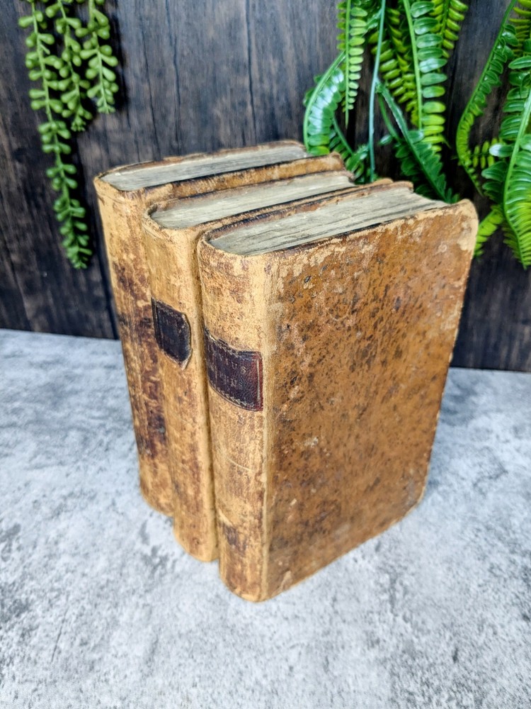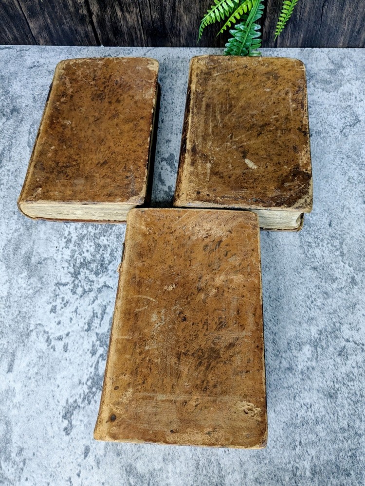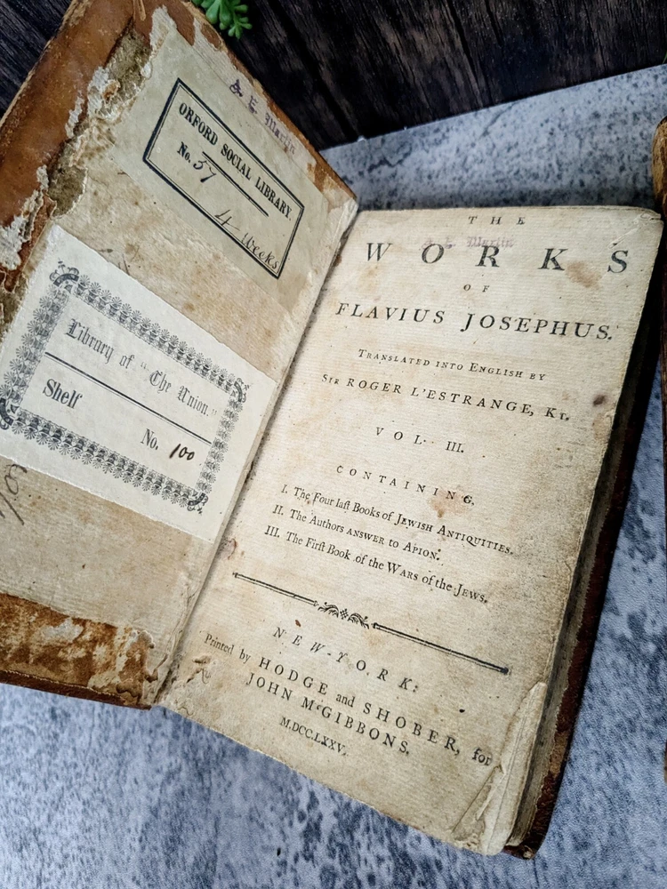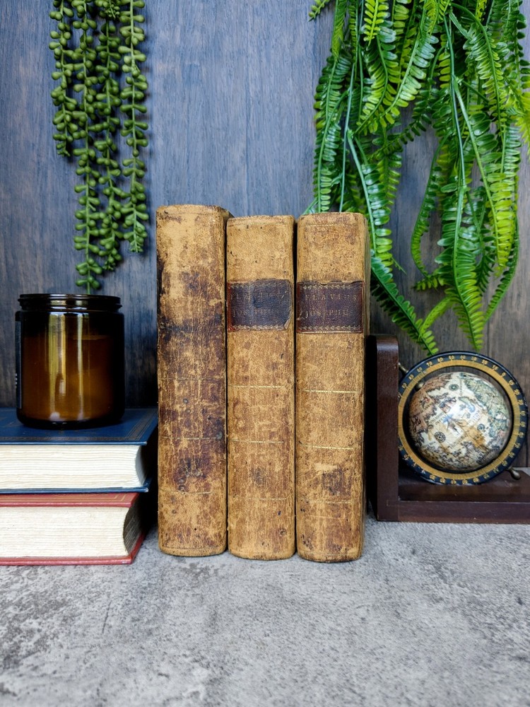 A 3 volume set of antique books from Flavius Josephus printed in the 1700s on Jewish Antiquities. The volumes are the collected works of Flavius Josephus as translated into English by Sir Roger L'Estrange. Volume 3 has the title page dated 1775 and printed by Hodge and Shober in New York. Each book is in the original leather binding and conditions/notes will be listed below by volume. Volume 1: The first 12 pages of this book are missing. The book starts with "The Life of Flavius Joseph" before going into Jewish Antiquities and up to "Book 7". Bookplate on the inside front panel titled "Library of 'The Union'". Original endpaper is missing and there is a partially torn bookplate from a previous owner. There is heavy scuffing on the panels, edges and corners. Cracking on the leather of the spine. Page edges and internals are heavily toned. Some pages have holes indicative of former bookworm residents. Rear endpapers missing. the last present page has some tearing/chipping towards the bottom but the "End of the First Volume" is present and legible. Page # 520 Item Dimensions: 8"x 5"x 1.62" Book 2: The first 10 pages of this book are missing. The book starts where volume 1 left off with "Book 8". Scuffing on the front and rear panels. Shelfwear on the edges and rounded corners. Title on the spine is present but starting to flake off. Cracking of the leather on the spine. Page edges and internals are heavily toned. Library of 'The Union' Bookplate is present on the inside front panel. Original endpapers are missing. Previous owner signature stamped on the inside front panel. Rear endpapers missing. The book ends with Book 15 and a notation that it is the end of the second volume. Pages # 502 Item Dimensions: 7.88"x 5"x 1.62" Book 3: Title page present in this book dated 1775 and much of the publishing information. Page edges and internals are heavily toned. Library of 'The Union' Bookplate is present on the inside front panel. Scuffing to the panels and shelfwear to the edges and rounded corners. The spine is in the best shape out of all three volumes but has much of the same creasing and cracking. Binding and hinges are in good shape though the front hinge is cracked. Evidence of long evicted previous bookworm residents in the book itself. Starts with where vol 2 left off and ends with "end of the third volume". Endpapers are in rough shape including partially being torn off in the rear. Pages # 485 Item Dimensions: 7.88"x 5"x 1.62" Please read the full description! We are not book restorers and while we do our best to note all conditions issues in the description and via photos, it's impossible for us to go through each individual page so some things might get missed. If you have any questions or concerns or would like more photos prior to purchasing, please send us a message.