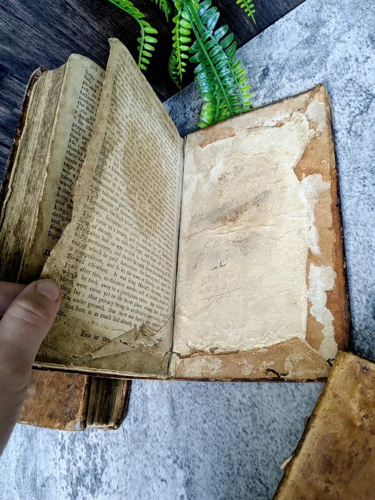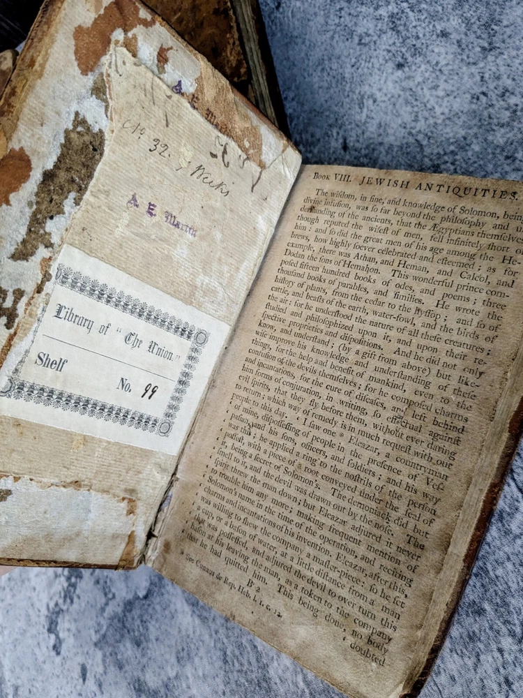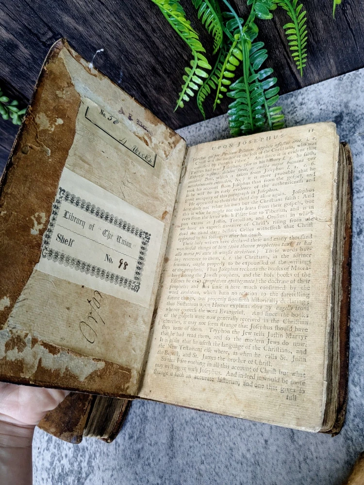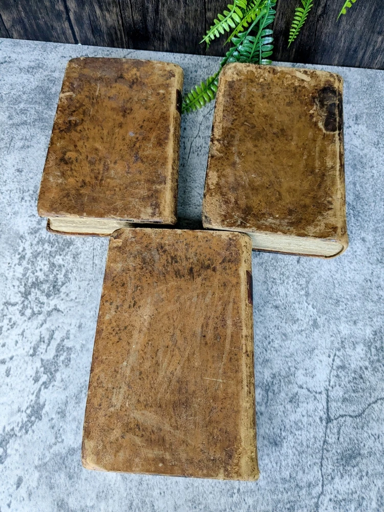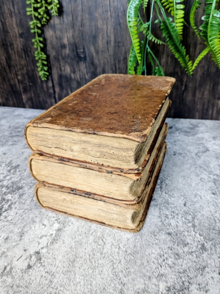 A 3 volume set of antique books from Flavius Josephus printed in the 1700s on Jewish Antiquities. The volumes are the collected works of Flavius Josephus as translated into English by Sir Roger L'Estrange. Volume 3 has the title page dated 1775 and printed by Hodge and Shober in New York. Each book is in the original leather binding and conditions/notes will be listed below by volume. Volume 1: The first 12 pages of this book are missing. The book starts with "The Life of Flavius Joseph" before going into Jewish Antiquities and up to "Book 7". Bookplate on the inside front panel titled "Library of 'The Union'". Original endpaper is missing and there is a partially torn bookplate from a previous owner. There is heavy scuffing on the panels, edges and corners. Cracking on the leather of the spine. Page edges and internals are heavily toned. Some pages have holes indicative of former bookworm residents. Rear endpapers missing. the last present page has some tearing/chipping towards the bottom but the "End of the First Volume" is present and legible. Page # 520 Item Dimensions: 8"x 5"x 1.62" Book 2: The first 10 pages of this book are missing. The book starts where volume 1 left off with "Book 8". Scuffing on the front and rear panels. Shelfwear on the edges and rounded corners. Title on the spine is present but starting to flake off. Cracking of the leather on the spine. Page edges and internals are heavily toned. Library of 'The Union' Bookplate is present on the inside front panel. Original endpapers are missing. Previous owner signature stamped on the inside front panel. Rear endpapers missing. The book ends with Book 15 and a notation that it is the end of the second volume. Pages # 502 Item Dimensions: 7.88"x 5"x 1.62" Book 3: Title page present in this book dated 1775 and much of the publishing information. Page edges and internals are heavily toned. Library of 'The Union' Bookplate is present on the inside front panel. Scuffing to the panels and shelfwear to the edges and rounded corners. The spine is in the best shape out of all three volumes but has much of the same creasing and cracking. Binding and hinges are in good shape though the front hinge is cracked. Evidence of long evicted previous bookworm residents in the book itself. Starts with where vol 2 left off and ends with "end of the third volume". Endpapers are in rough shape including partially being torn off in the rear. Pages # 485 Item Dimensions: 7.88"x 5"x 1.62" Please read the full description! We are not book restorers and while we do our best to note all conditions issues in the description and via photos, it's impossible for us to go through each individual page so some things might get missed. If you have any questions or concerns or would like more photos prior to purchasing, please send us a message.