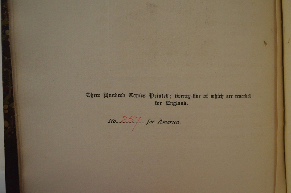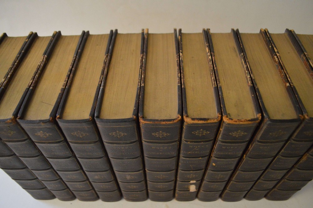 eBay template The Works of Henry Wadsworth Longfellow 11 Volume Set plus Life of and Memorial by Henry Wadsworth Longfellow The Riverside Press; Cambridge, 1886. Hardcover. Eleven Volume Set plus 2 Volumes Life of and 1 Memorial Volume. Large Paper Edition. Limited Edition. Set is limited to 500 numbered copies. This set is number 462. A Very Good, three-quarter leather binding, marbled boards, gilt lettering and ornate design on spines, binding sturdy and intact, TEG with few blemishes, marbled endpapers and pastedowns, some rubbing along board edges and joints, leather joints are a bit dry and brittle, some age toning to text block, previous owner bookplate affirmed to front pastedown Volume 2, spot of paint on spine Volume 4, without Dust wrapper. Memorials of Longfellow (limited to 300 numbered copies and this book is number 257), published by Ticknor and Company in Boston in 1887 with 447pp. Life of Henry Wadsworth Longfellow Volume 1 and 2 were published by Ticknor and Company in Boston in 1886 and 1887 (limited to 300 numbered copies and this book is number 257), (Vol.1) 433pp., (Vol.2) 447pp. A nice and clean set. 8vo[octavo or approx. 6 x 9 inches]., (Vol.1) 436pp., (Vol.2) 417pp., (Vol.3) 330pp., (Vol.4) 366p., (Vol.5) 306pp., (Vol.6) 266pp., (Vol.7) 455pp., (Vol.8) 489pp., (Vol.9) 446pp., (Vol.10) 440pp., (Vol.11) 450pp., notes, indexed. We pack securely and ship daily with delivery confirmation on every book. The picture on the listing page is of the actual book for sale. Additional Scan(s) are available for any item, please inquire. 111111113630 SHIPPING: Domestic Media Mail is an additional $5.00. Domestic Priority S&H is an additional $10.00 per item. All domestic orders are moisture protected and shipped in either a well padded box or depending on price/size of book it will be cardboard sleeved & shipped in a well padded bubble envelope. The handling includes Delivery Confirmation on every domestic order which will be emailed upon processing. We always combine on shipping on multiple orders. Foreign shipments are at cost with a dollar handling. PAYMENT: Immediate payment only on this item. RETURNS: All books returnable for a full refund within 30 days after delivery for any reason. A NOTE ON GRADING: Ebay's catalog database can be faulty, please read notes section to clarify particulars on an item, if you have any questions please contact us for more information or pictures. We grade Fine, Near Fine, Very Good, Good, Fair. Any faults are always noted including remainder marks, price clipped dust jackets, and previous owner markings. If not noted then they do not exist on this book. © 1998 - 2023 Lavendier Books. All rights reserved.