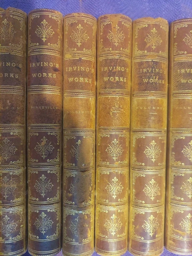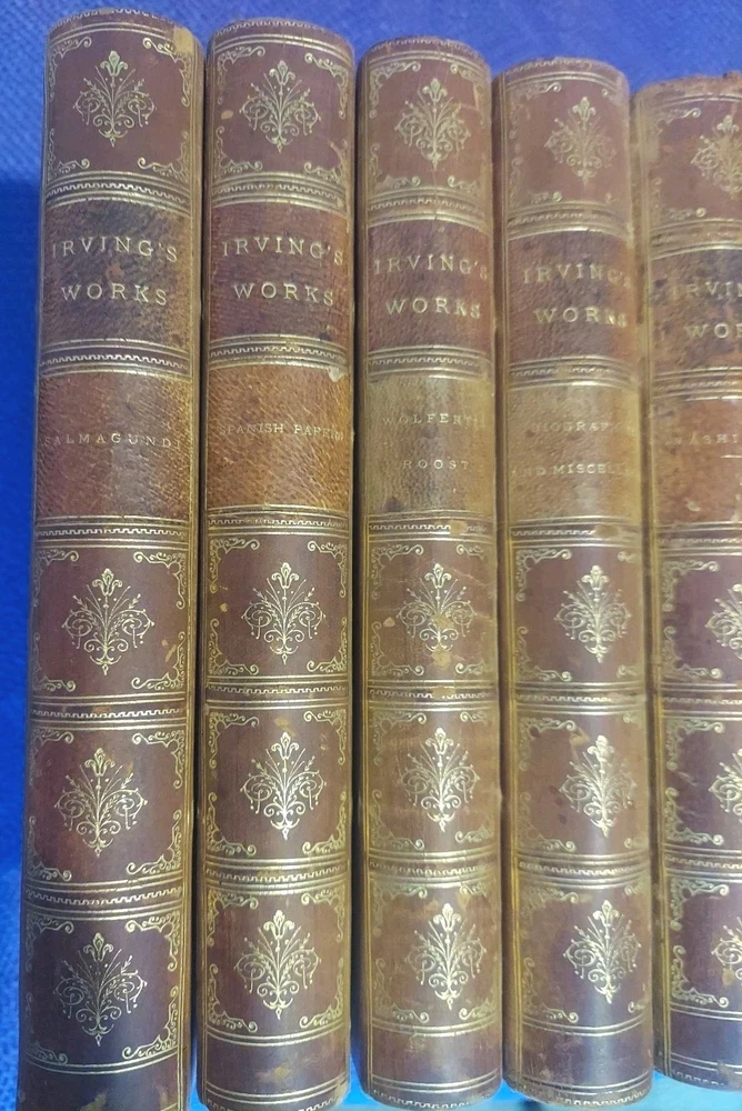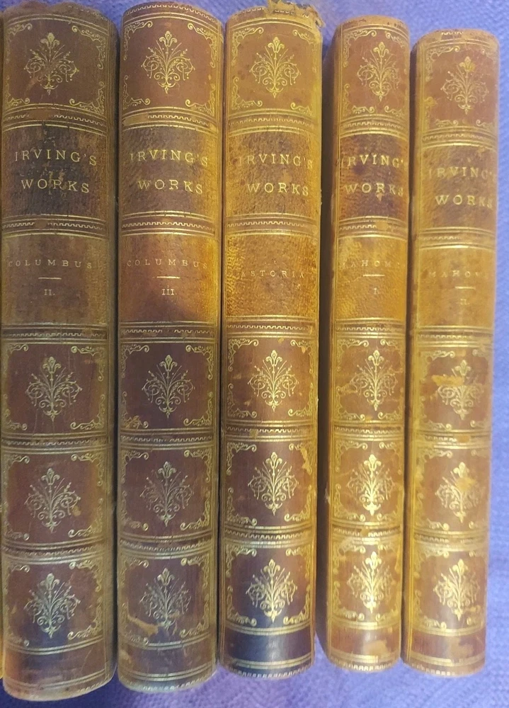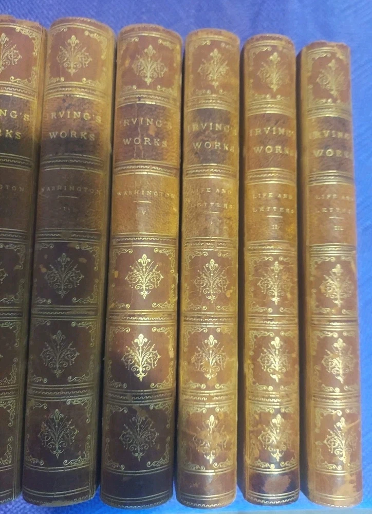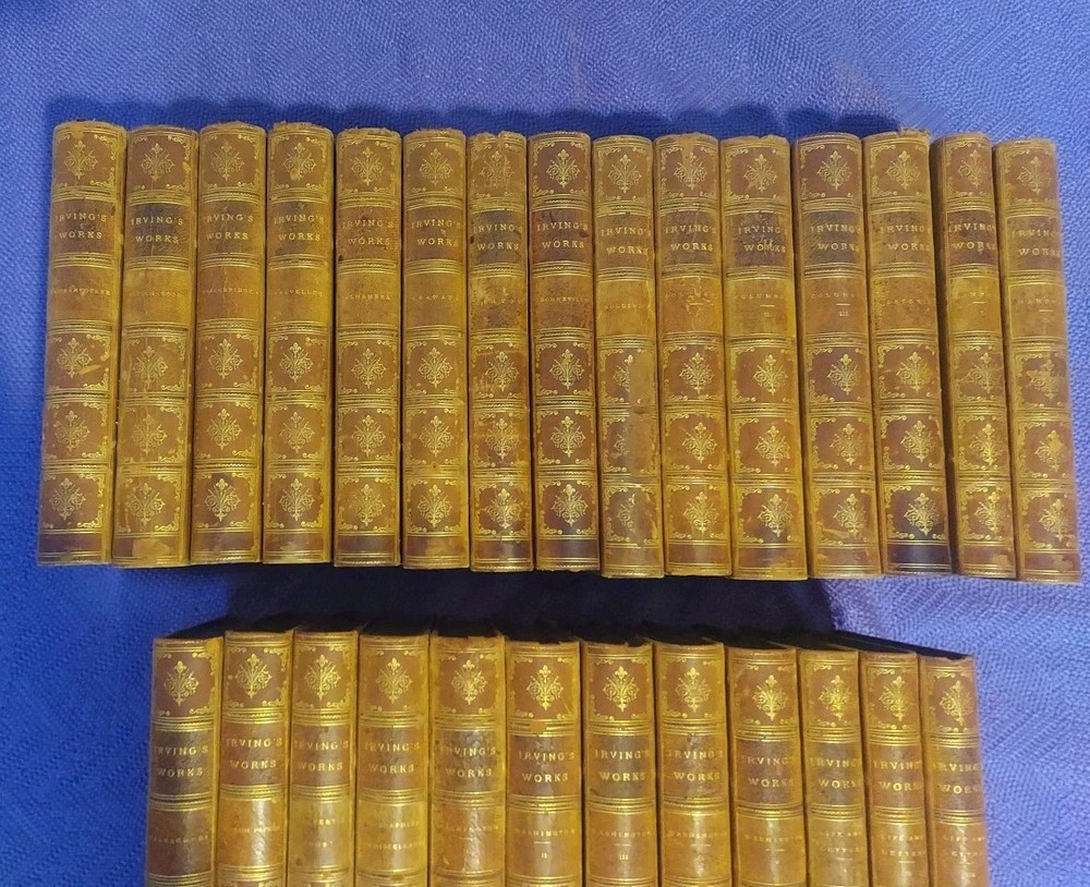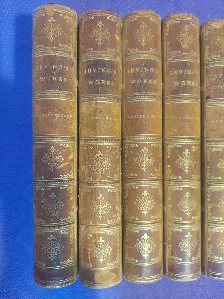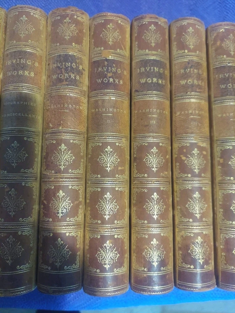 The Works of Washington Irving complete 27 volumes 1882 G.P. Putnam's Leather Hudson Edition is a rare and collectible set of literature and fiction by the renowned author Washington Irving. The stunning leather binding and Hudson Edition make it a valuable addition to any collector's library. Published in New York in 1882 by G.P. Putnam's Sons, this set features beautiful illustrations and is a testament to the enduring appeal of classic literature from North America. Each book size is approximately 8 1/4 x 5 3/4 x 1 - 1.5 " Publisher’s 1/2 morocco light brown over marbled boards and matching marbled end papers. Bumps and wear on top/bottom of spine edges, corner edges of the boards. All books are intact, no missing, marked or scribbled pages, tight bindings. Bookseller's small sticker on each books vack cover bottom edge. Excellent for reading or displaying. Condition is Very Good, not considering the age. Serious collector Set. Volumes: 1: Knickerbocker's New York 2: The Sketch Book 3: Bracebridge Hall 4: Tales of a Traveler 5: The Alhambra 6: Conquest of Granada 7: Crayon Miscellany 8: Captain Bonneville 9: Oliver Goldsmith 10-12: Christopher Columbus I, II, III 13: Astoria 14 & 15: Mahomet I , II 16: Salmagundi 17: Wolfert's Roost 18: Spanish Papers 19: Biographies & Miscellany 20-24: George Washington I, II, III, IV, V 25-27: Life and Letters I, II, III Please see the photos as they are also part of the description. Free shipping with USPS Media Mail, insured .