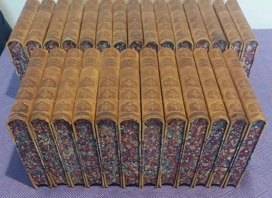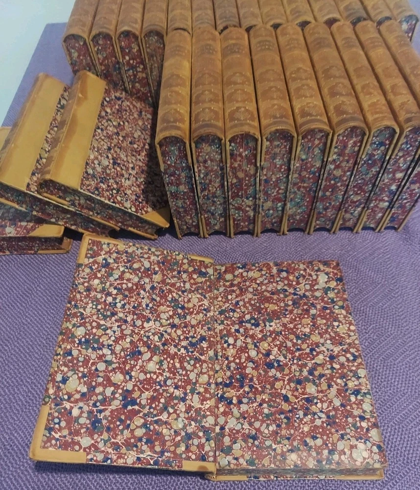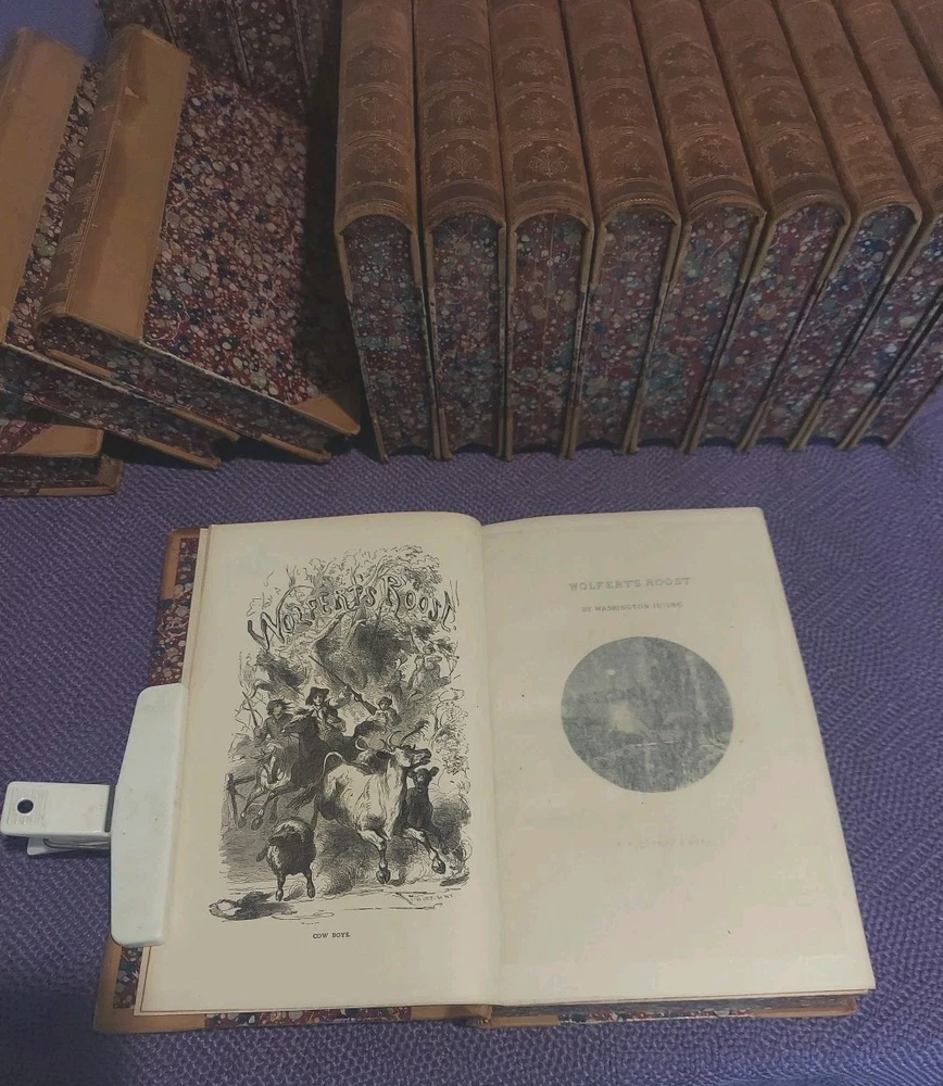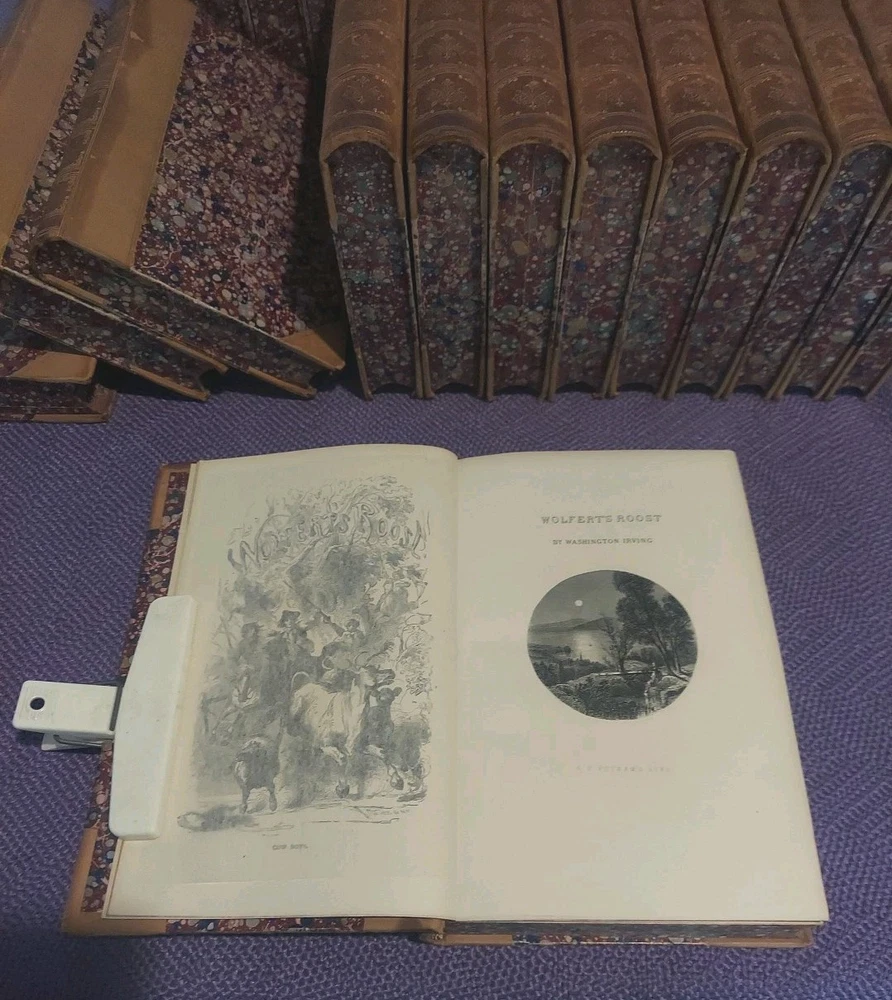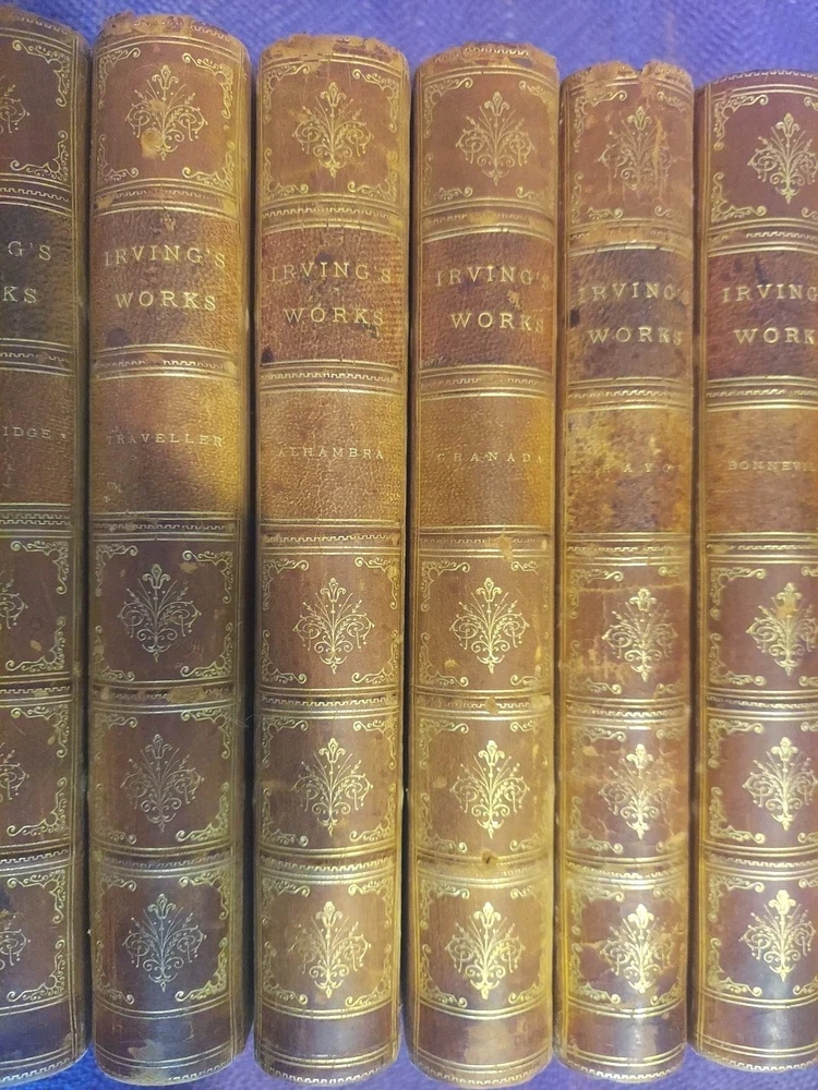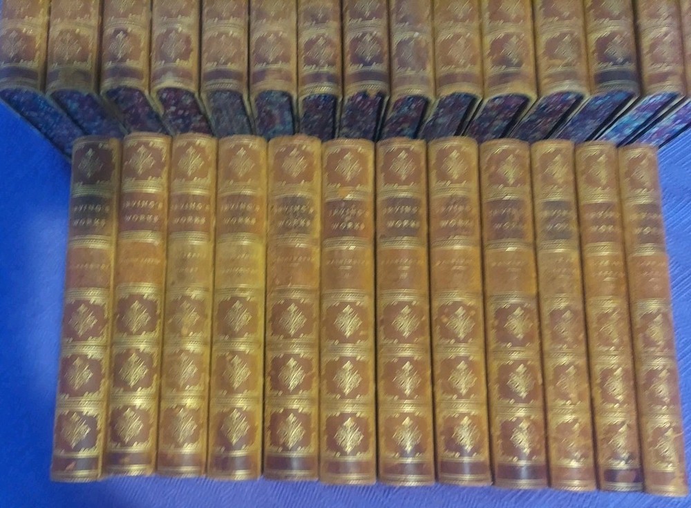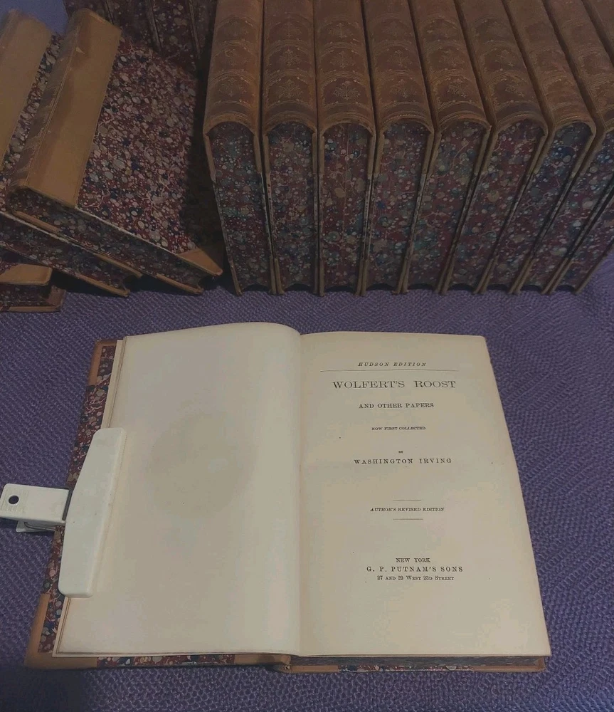 The Works of Washington Irving complete 27 volumes 1882 G.P. Putnam's Leather Hudson Edition is a rare and collectible set of literature and fiction by the renowned author Washington Irving. The stunning leather binding and Hudson Edition make it a valuable addition to any collector's library. Published in New York in 1882 by G.P. Putnam's Sons, this set features beautiful illustrations and is a testament to the enduring appeal of classic literature from North America. Each book size is approximately 8 1/4 x 5 3/4 x 1 - 1.5 " Publisher’s 1/2 morocco light brown over marbled boards and matching marbled end papers. Bumps and wear on top/bottom of spine edges, corner edges of the boards. All books are intact, no missing, marked or scribbled pages, tight bindings. Bookseller's small sticker on each books vack cover bottom edge. Excellent for reading or displaying. Condition is Very Good, not considering the age. Serious collector Set. Volumes: 1: Knickerbocker's New York 2: The Sketch Book 3: Bracebridge Hall 4: Tales of a Traveler 5: The Alhambra 6: Conquest of Granada 7: Crayon Miscellany 8: Captain Bonneville 9: Oliver Goldsmith 10-12: Christopher Columbus I, II, III 13: Astoria 14 & 15: Mahomet I , II 16: Salmagundi 17: Wolfert's Roost 18: Spanish Papers 19: Biographies & Miscellany 20-24: George Washington I, II, III, IV, V 25-27: Life and Letters I, II, III Please see the photos as they are also part of the description. Free shipping with USPS Media Mail, insured .
