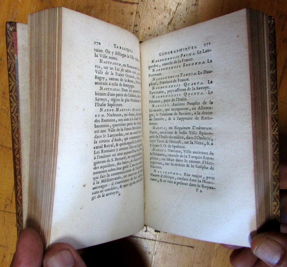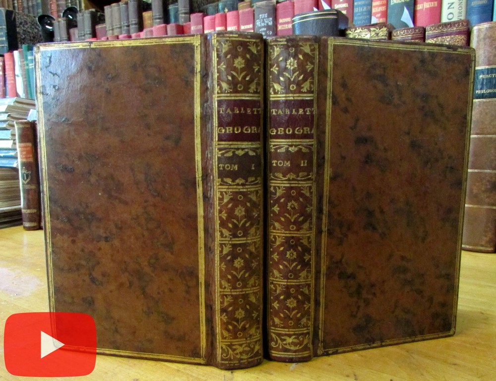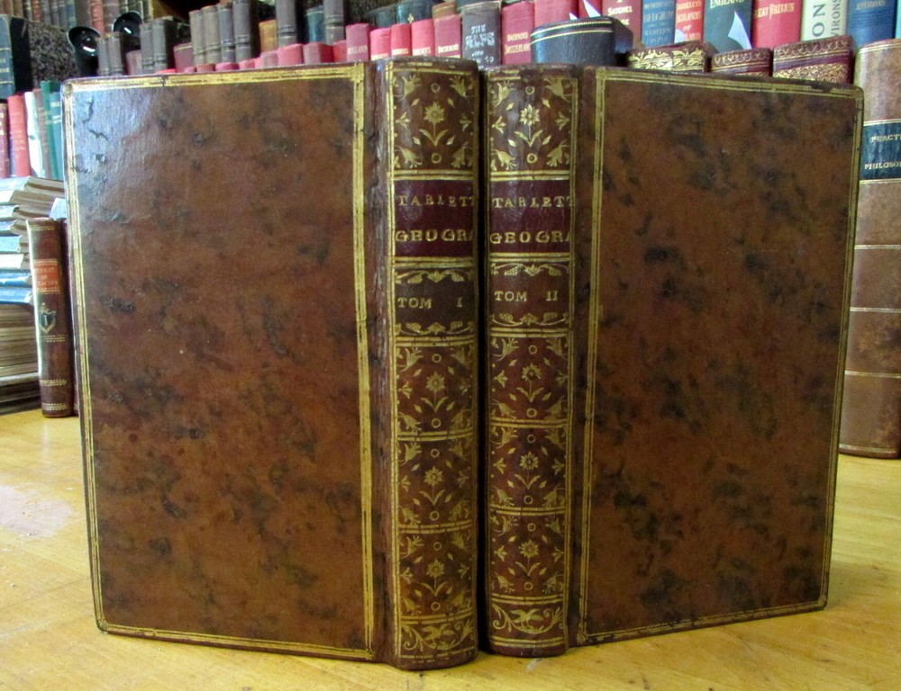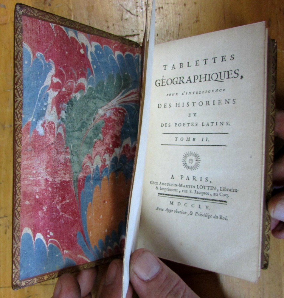 World Geography 1755 rare 2 vol pocket set Geographical dictionary leather books World Geography 1755 rare 2 vol pocket set Geographical dictionary leather books Rare mid-18th century French geographical work, beautifully bound in mottled calf bindings. Tablettes Geographiques, pour l'Intelligence des Historiens et des Poetes Latins. 1755, Paris , Augustin-Martin Lottin. Full period French calf, smooth spines richly gilt decorated with floral devices and contrasting leather labels, covers mottled and outline ruled in gilt, turn-ins gilt patterned, marbled end papers, all edges gilt. Fine typography, nice paper, well printed, excellent small two volume set. Set is a geographical dictionary as opposed to a gazetteer, which means no maps were ever produced for inclusion within this set. Thus, no maps as issued. Very well preserved mid-18th century set. Gilt remains bright, leather supple, boards clean and fresh, contents tight, clean and sound, an overall superb age patina. Unique and rare set thus. Books measure: 6 1/4" H X 3 3/4" W. Set along shelf measures: 2 1/8". [B14970-V1473]. Click here to view a short video presentation. Short video captures condition much better than words. Please watch prior to purchase to ensure a clear understanding of the set. Nicer than typical for the era and type of binding.