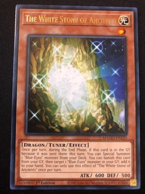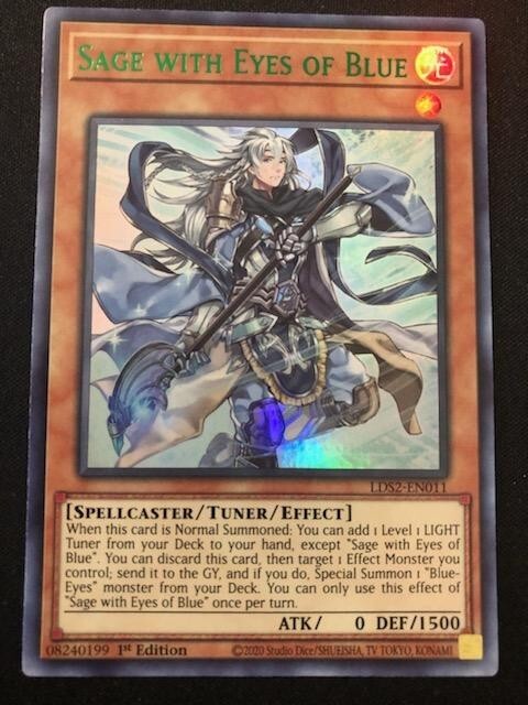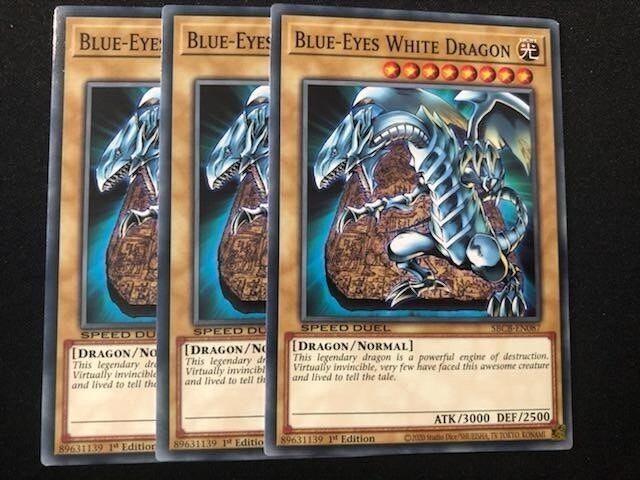 MONSTERS: 3X BLUE-EYES WHITE DRAGON (COMMON- SPEED DUEL) 1X SAGE WITH EYES OF BLUE (COLOR ULTRA RARE) 2X DRAGON SPIRIT OF WHITE (COMMON) 2X PROTECTOR WITH EYES OF BLUE (COMMON) 2X MASTER WITH EYES OF BLUE (COMMON) 2X MAIDEN WITH EYES OF BLUE (COMMON) 2X PRIESTESS WITH EYES OF BLUE (COMMON) 1X THE KING OF D. (ULTRA RARE) 1X THE WHITE STONE OF ANCIENTS (GOLD RARE) 2X THE WHITE STONE OF LEGEND (COMMON) 2X KAIBAMAN (COMMON) 1X RED-EYES DARKNES METAL DRAGON (COMMON) 1X LORD OF D. (SUPER RARE- SPEED DUEL) 2X DECOY DRAGON (COMMON) SPELLS: 1X THE FLUTE OF SUMMONING DRAGON (COMMON) 2X MAUSOLEUM OF WHITE (COMMON) 3X BEACON OF WHITE (COMMON) 1X DRAGON SHRINE (COMMON) 3X BURST STREAM OF DESTRUCTION (COMMON) 1X STAMPING DESTRUCTION (SUPER RARE) 1X A WINGBEAT OF GIANT DRAGON (COMMON) 1X MAJESTY WITH EYES OF BLUE (COMMON) 1X NEUTRON BLAST (COMMON) 1X POLYMERIZATION (COMMON- SPEED DUEL) TRAPS: 2X TYRANT WING (COMMON) EXTRA DECK: 1X BLUE-EYES ULTIMATE DRAGON (COLOR ULTRA RARE)