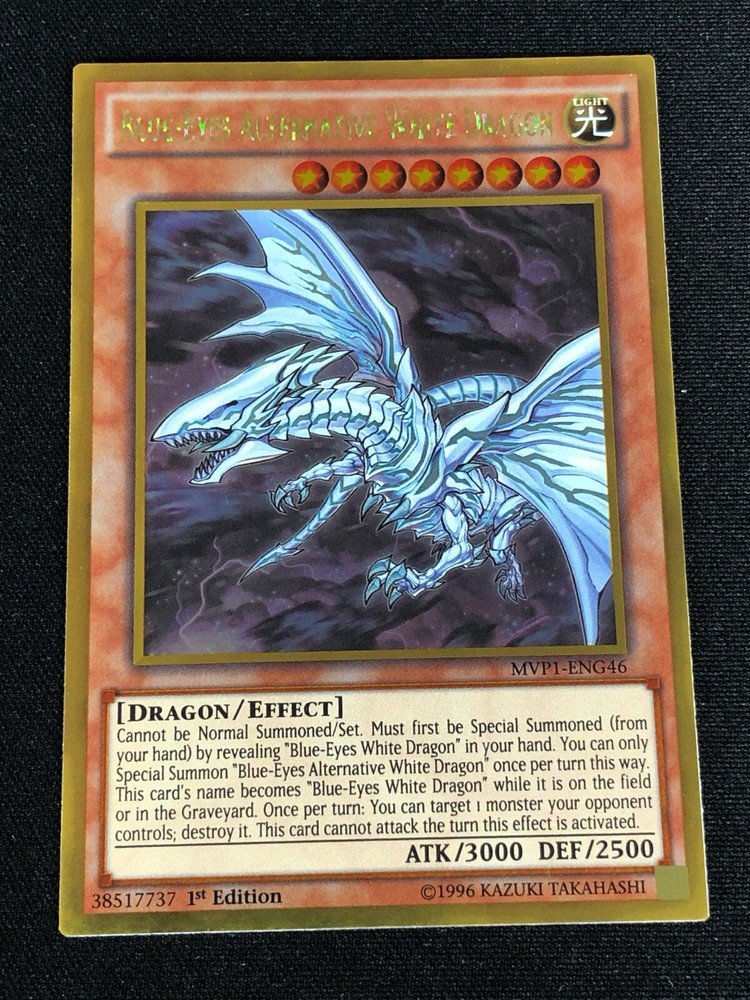 YUGIOH BLUE-EYES ALTERNATIVE WHITE DRAGON MVP1-ENG46 1ST GOLD ALL CARDS IN THIS AUCTION ARE IN NEAR MINT TO MINT CONDITION UNLESS STATED OTHERWISE IN THE TITLE. AND, YOU ARE GUARANTEED TO RECEIVE THE CARD NAMED IN THE TITLE. PLEASE NOTE, IF THERE'S MORE THAN 1 COPY AVAILABLE, YOU MAY NOT RECIEVE THE SAME EXACT CARD IN THE PHOTO. HOWEVER, IT WILL BE THE SAME EXACT CARD IN THE TITLE, AND DESCRIPTION! PLEASE CONTACT ME IF THERE IS ANYTHING WRONG WITH YOUR ORDER OR SHIPPING BEFORE LEAVING FEEDBACK. PLEASE GIVE ME A CHANCE TO FIX ANY PROBLEM YOU MAY HAVE. THANK YOU! Shipping Information: Shipping and Handling for this auction will be Free inside the United States - With Tracking! International Shipping Available Through Ebay’s Global Shipping Program. (BUYER IS RESPONSIBLE FOR ANY TAX) **Read the TITLE to see the condition of the cards Before you place a bid. Any damaged cards will be listed as such In The Title (FOR EXAMPLE: Blue Eyes White Dragon LOB-001 (HP) If it doesn't say anything about damage, it is in near-mint to mint condition. If you have any questions, message me Before you place your bid.** *PLEASE READ* Ebay's Card Condition Guidelines: (NM) = Near mint or better Comparable to a fresh pack Flaws may include Minor corner and edge wear (LP) = Lightly played (Excellent) Has clearly visible signs of wear Flaws may include Moderate edge chipping Moderate surface scuffing Fuzzy corners (MP) = Moderately played (Very good) Has moderate-to-heavy damage all over Flaws may include Moderate discoloration Moderate creasing Moderate to heavy edge chipping Rounding and soft corner (HP) = Heavily played (Poor) Is extremely worn and displays flaws all over Heavily Played condition cards exhibit signs of heavy wear. Heavily Played condition cards may include cards that have significant creasing, folding, severe water damage, heavy whitening, heavy border wear, and/or tearing. RETURN POLICY: RETURNS ARE ACCEPTED IF THE ITEM ARRIVES DAMAGED, OR NOT AS DESCRIBED. RETURNS ARE NOT ACCEPTED FOR BUYERS REMORSE. CHECK OUT MY OTHER AUCTIONS! _gsrx_vers_1680 (GS 9.8.3 (1680))