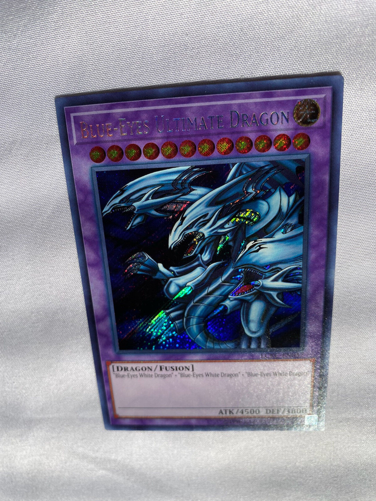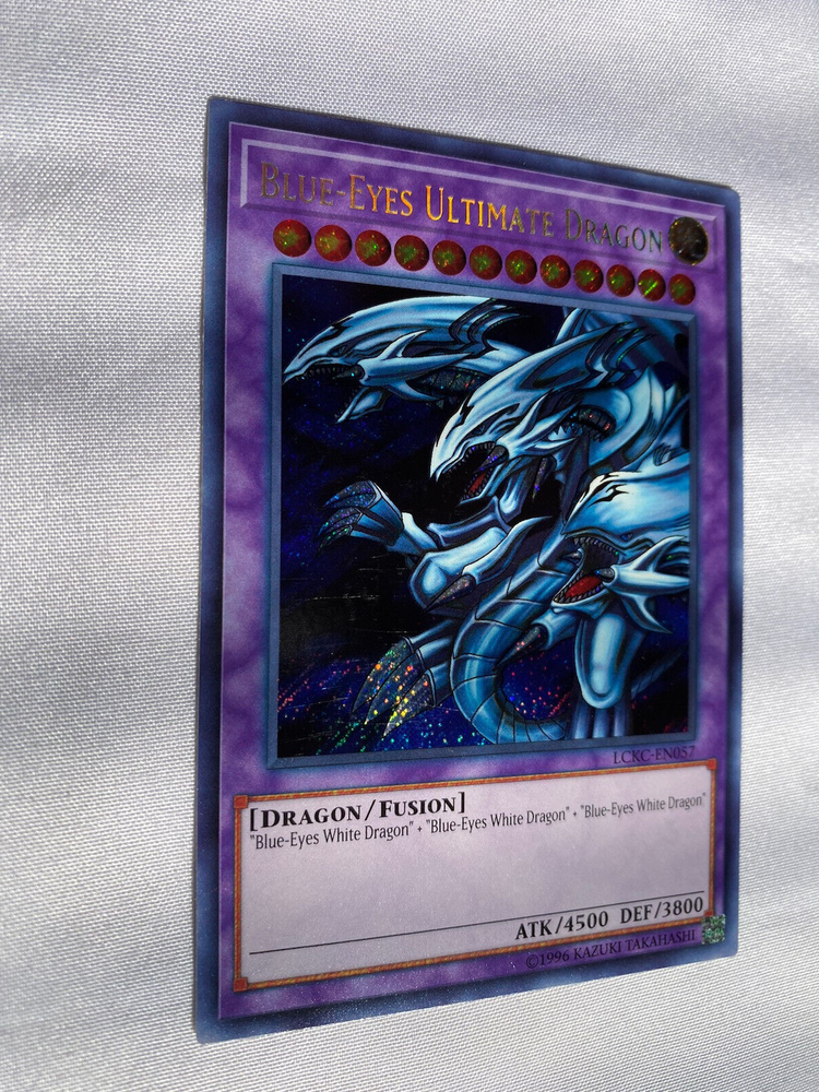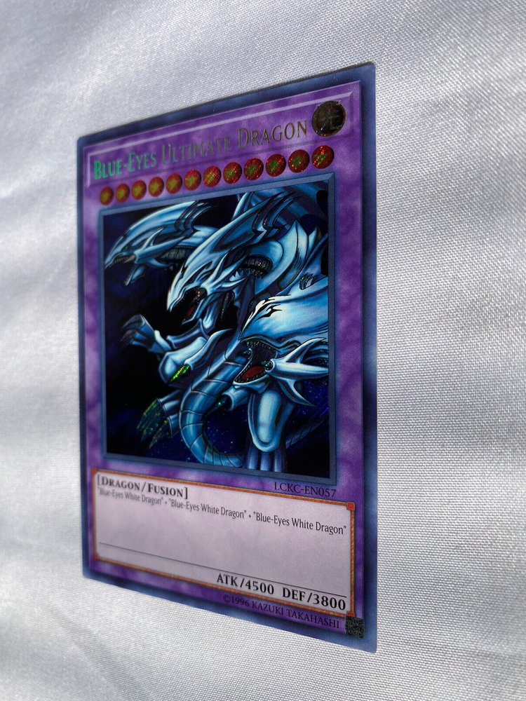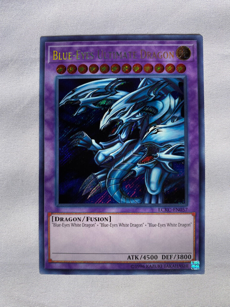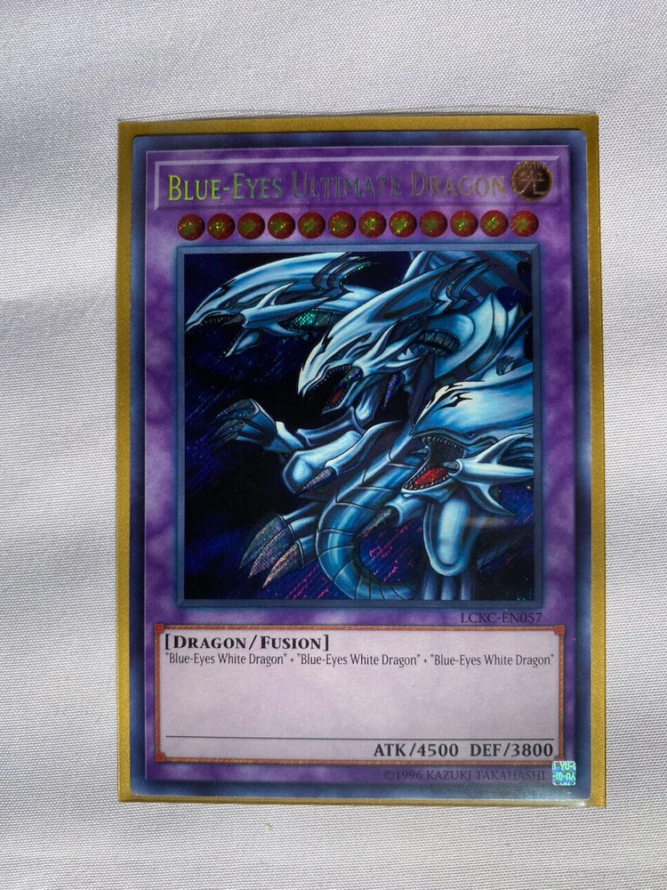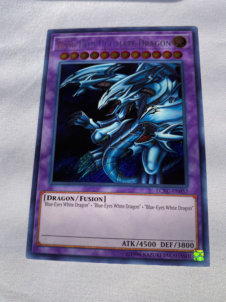 Up for sale is a BLUE-EYES ULTIMATE DRAGON card from the Legendary Collection Kaiba [LCKC]. This card has never been used or placed in a deck. This card is Secret Rare and in mint condition and has only been handled to take these pictures. This card ships for FREE in a card sleeve (picture 6 & 7) and a top loader for protection. Thank you for looking! BLUE-EYES ULTIMATE DRAGON (LIGHT) 12 star [LCKC-EN057] [DRAGON / FUSION] "Blue-Eyes White Dragon" * "Blue-Eyes White Dragon" * "Blue-Eyes White Dragon" ATK / 4500 DEF / 3800