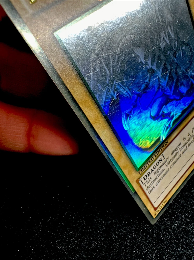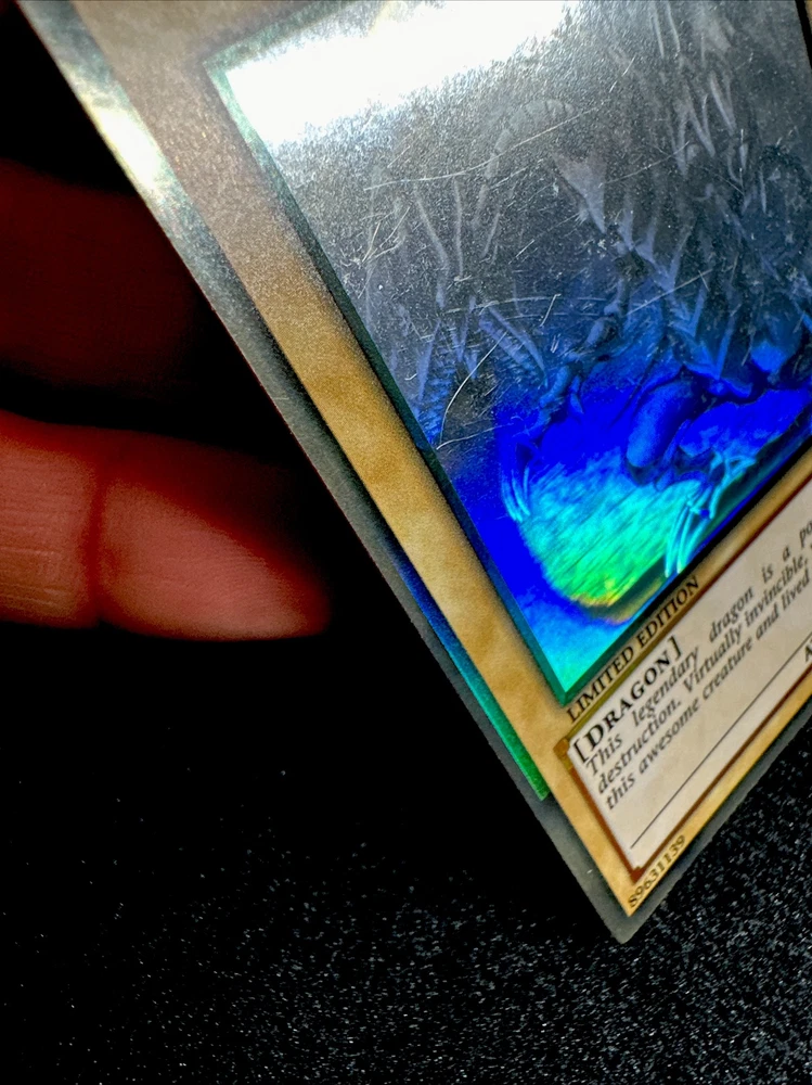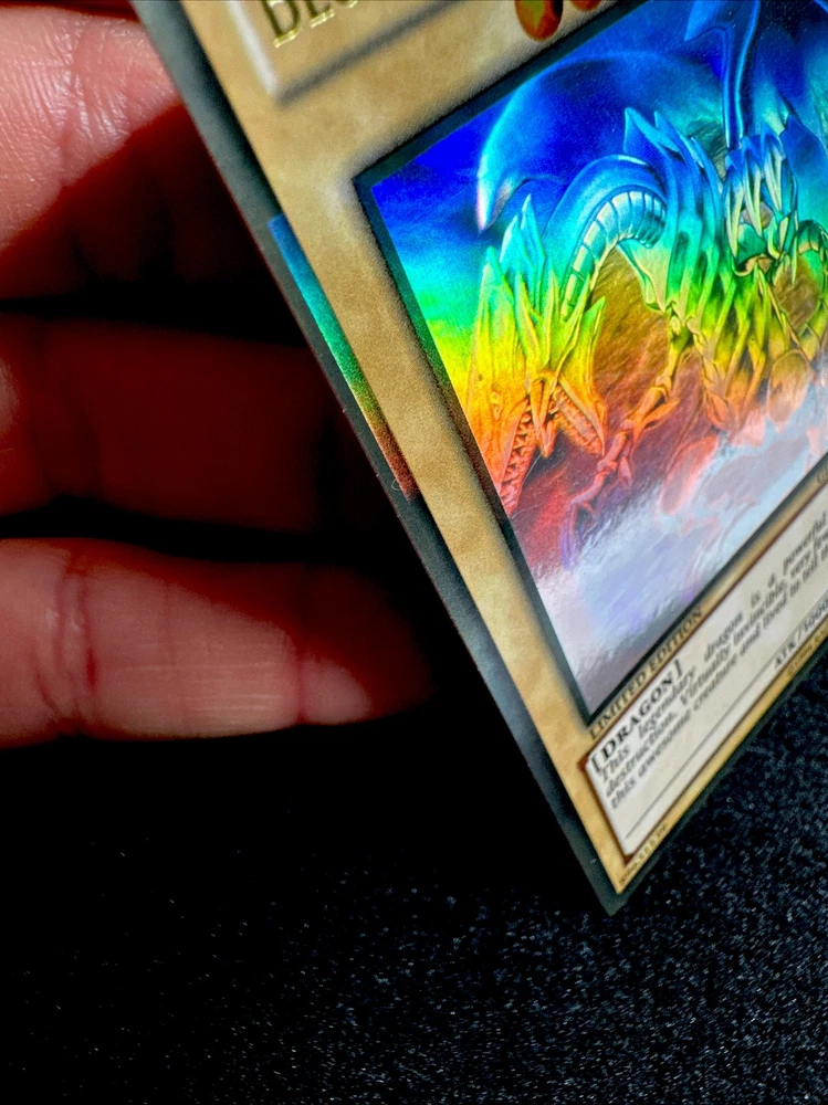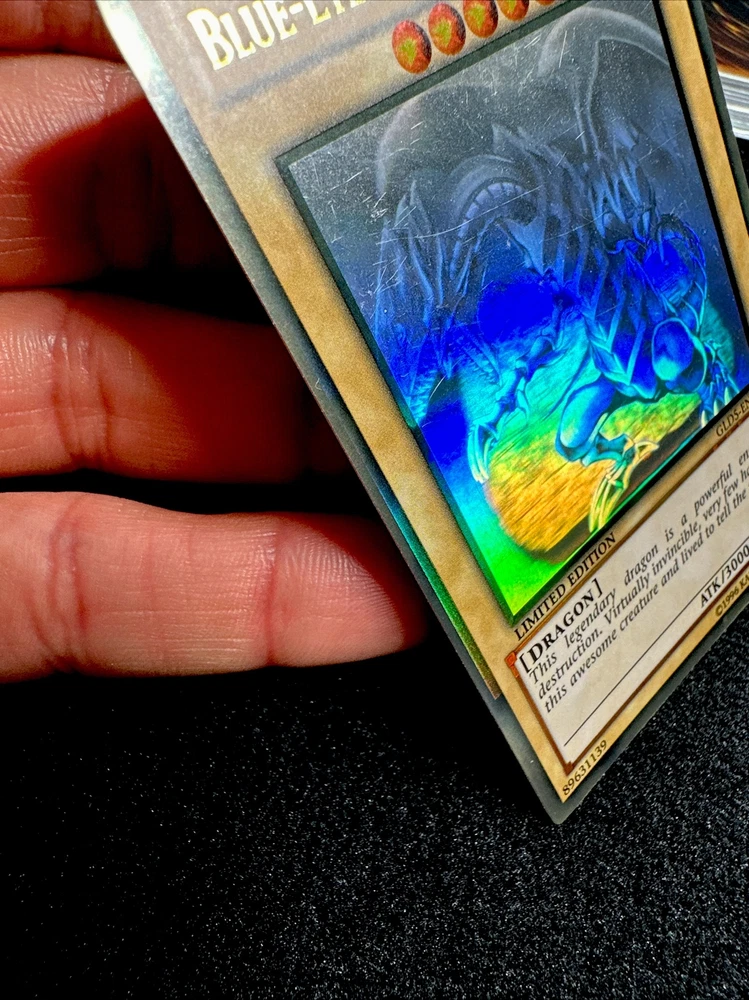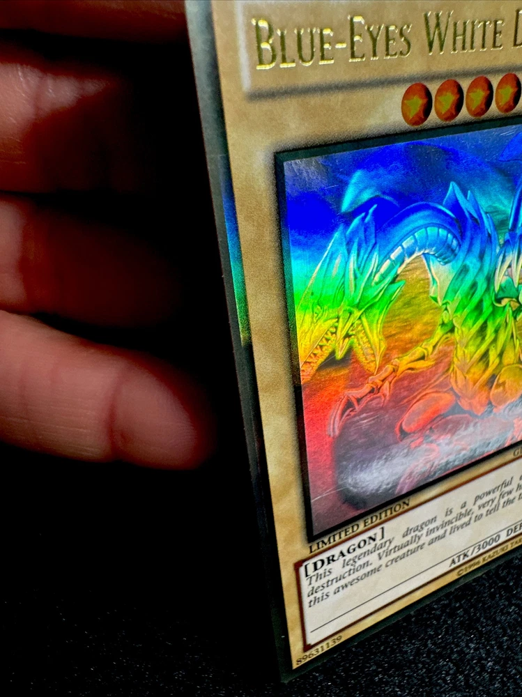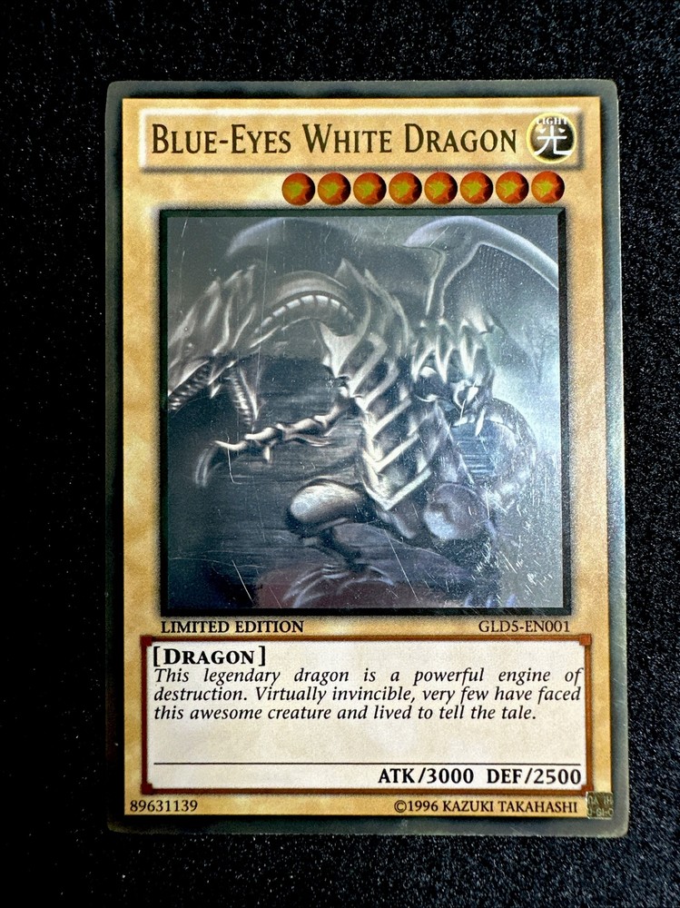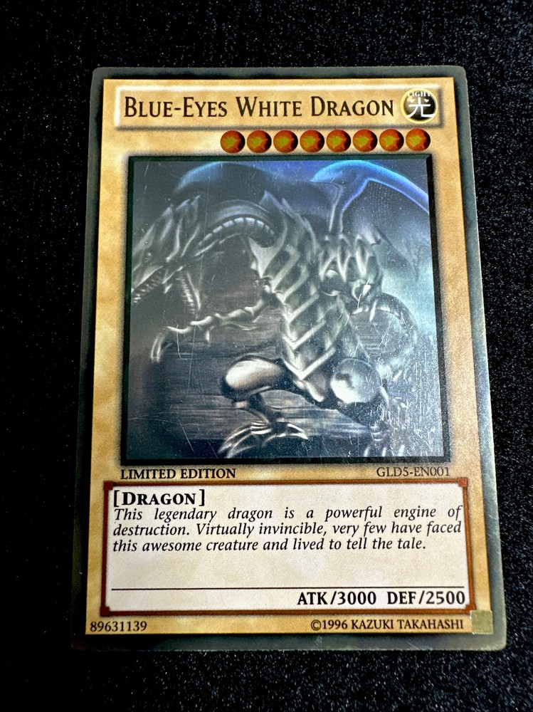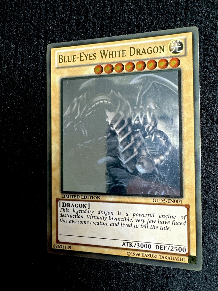 YUGIOH • BLUE-EYES WHITE DRAGON • GHOST RARE • GLD5-EN001 • LIMITED • MISPRINT • NM FOIL SHIFTED ERROR Card Sleeve Included + Top Loader • Never Play Near Mint card • Authentic Konami USA Version YOU ARE GUARANTEED TO GET THE CARD NAMED IN THE TITLE. Thank you.