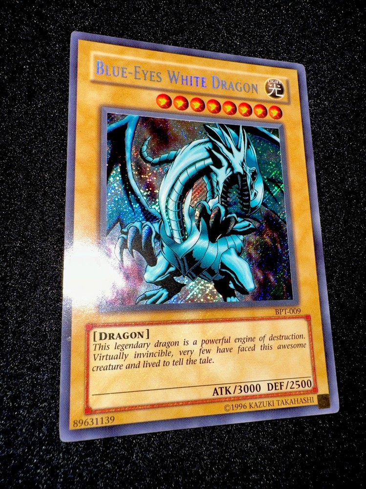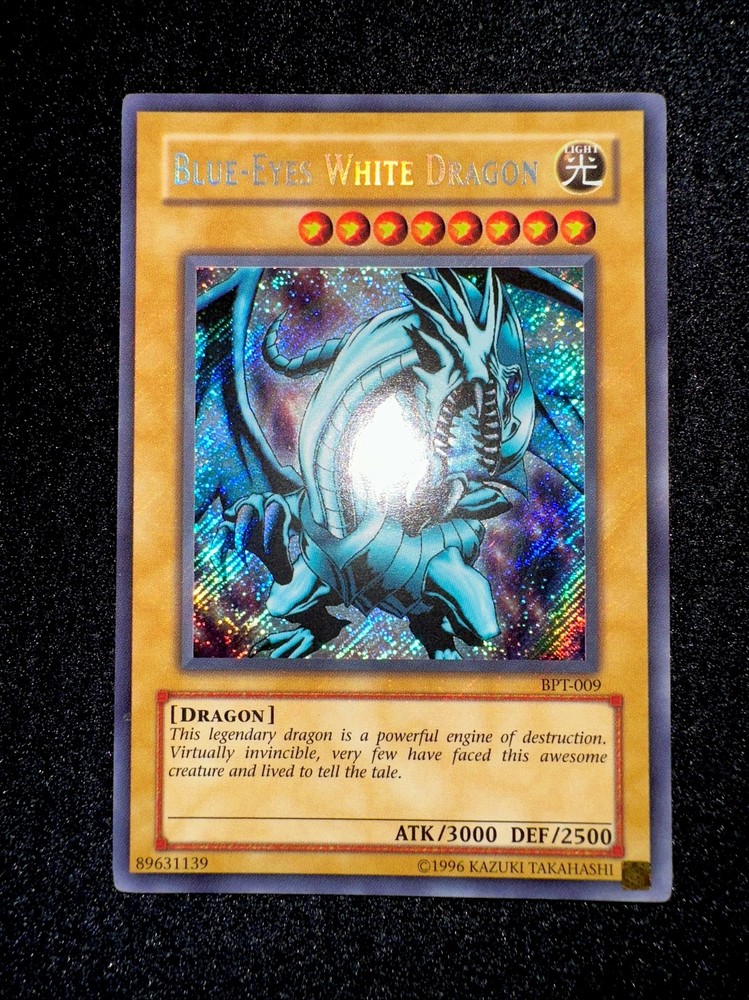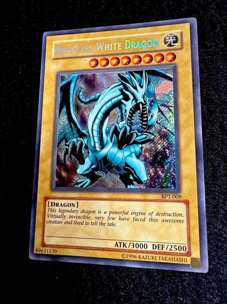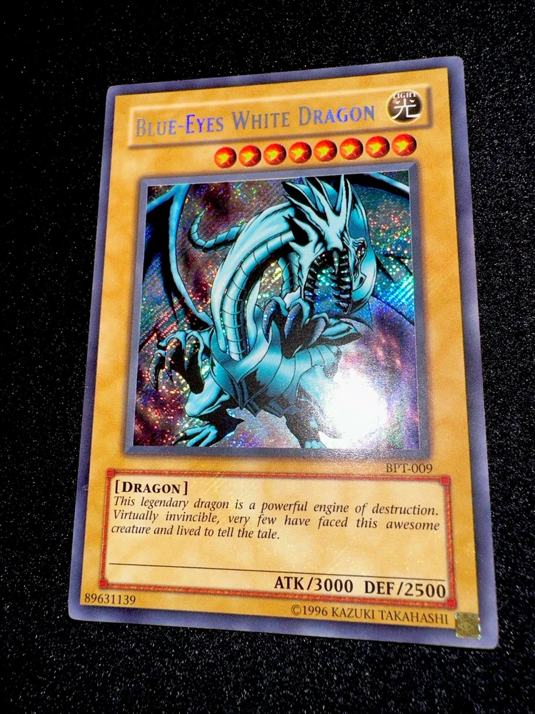 🔥 YUGIOH • BLUE-EYES WHITE DRAGON • SECRET RARE • BPT-009 • PROMO • VLP 🔥 Card Sleeve Included + Top Loader • VERY LIGHTLY PLAY CARD • Authentic Konami USA Version YOU ARE GUARANTEED TO GET THE CARD NAMED IN THE TITLE. Thank you.
