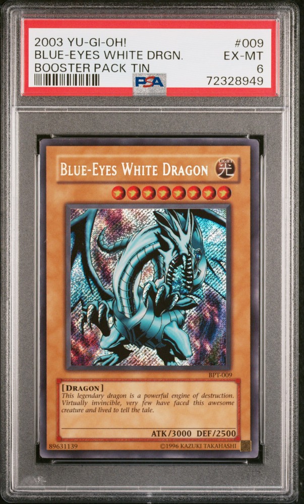 Description Condition: PSA 6 EX-MT Availability: In Stock You are Purchasing YUGIOH BPT-009 BLUE-EYES WHITE DRAGON SECRET RARE HOLO FOIL PSA 6 #72328949 Professionally graded by Professional Sports Authenticator (PSA) *PLEASE REVIEW PHOTO(S) BEFORE BIDDING/BUYING. >>MORE GRADED YUGIOH CARDS<< IG: CARD_RUSH_INC Payment Options Payment is expected within 7 days of your purchase date. We accept all forms of payments through Paypal. Shipping and Handling We ship to all U.S. states, U.S. territories, APO/FPO locations and any international countries listed under our "ship to" heading. Shipping and Handling is calculated based on the combined shipping weight of your item(s). Please use the shipping calculator to estimate your shipping and handling charges. In order to qualify for combined shipping terms, all items must be paid for in one payment; please do not pay until you are done bidding/shopping. Please contact us if you have any questions regarding our shipping and handling terms. Shipping and Delivery Packages are shipped out every Monday, Wednesday, and Friday. Domestic Packages take approximately 2-7 days to arrive. International packages may take a little longer to arrive, typically 1-4 weeks. Please allow ample transit times before inquiring about your package, thank you. Sales Tax Sales tax will be automatically collected by Ebay. Customer Service We will make every effort to get your purchase is mailed in a timely manner. Please contact us if you have any questions or concerns; we would love to hear any suggestions you have on how we can improve your eBay experience. Thank you for visiting us today.