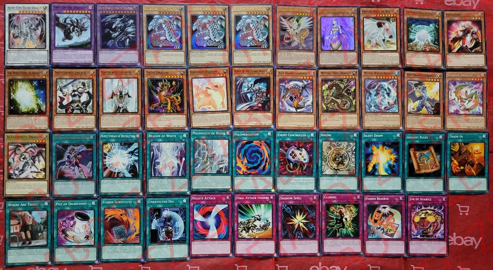 Description You are purchasing one Blue-Eyes deck, includes all 43 cards shown in displayed images. See below for the complete deck list. Unless stated otherwise, all cards are mint/near mint condition. Shipping Unless stated otherwise, free shipping. All cards are shipped in a bubble mailer. All items are shipped within 24 hours (1 business day). Weekends do not count as business days. All orders made on Fridays after 8AM EST and weekends will be shipped on the following Monday, excluding holidays. International Shipping Only ship to eligible countries under the GSP (Global Shipping Program). Buyers are responsible for all international shipping fees. For more information, go to this link [http://pages.ebay.com/help/buy/shipping-globally.html] Returns (DOES NOT APPLY TO OPENED FACTORY SEALED PRODUCTS) 14 days money back, buyer pays return shipping, 20% restocking fee will be charged Monsters:20 3 Blue-Eyes White Dragon 1 Hieratic Dragon of Tefnuit 1 Maiden with Eyes of Blue 1 Dragon Spirit of White 1 Kaibaman 1 The White Stone of Legend 1 The White Stone of Ancients 1 Protector with Eyes of Blue 1 Master with Eyes of Blue 1 Tiger Dragon 1 Kidmodo Dragon 1 Rider of the Storm Winds 1 Black Dragon Collapserpent 1 Mythic Tree Dragon 1 Mythic Water Dragon 1 White Dragon Wyverburster 1 Dodger Dragon 1 Alexandrite Dragon Spells:14 1 The Melody of Awakening Dragon 1 Burst Stream of Destruction 1 Beacon of White 1 Mausoleum of White 1 Polymerization 1 Enemy Controller 1 Shrink 1 Silent Doom 1 Ancient Rules 1 Trade-In 1 Where Arf Thou? 1 Pot of Dichotomy 1 Fusion Substitute 1 Unexpected Dai Traps:6 1 Negate Attack 1 Final Attack Orders 1 Shadow Spell 1 Cloning 1 Fusion Reserve 1 Jar of Avarice Extra:3 1 Azure-Eyes Silver Dragon 1 First of the Dragons 1 Blue-Eyes Ultimate Dragon