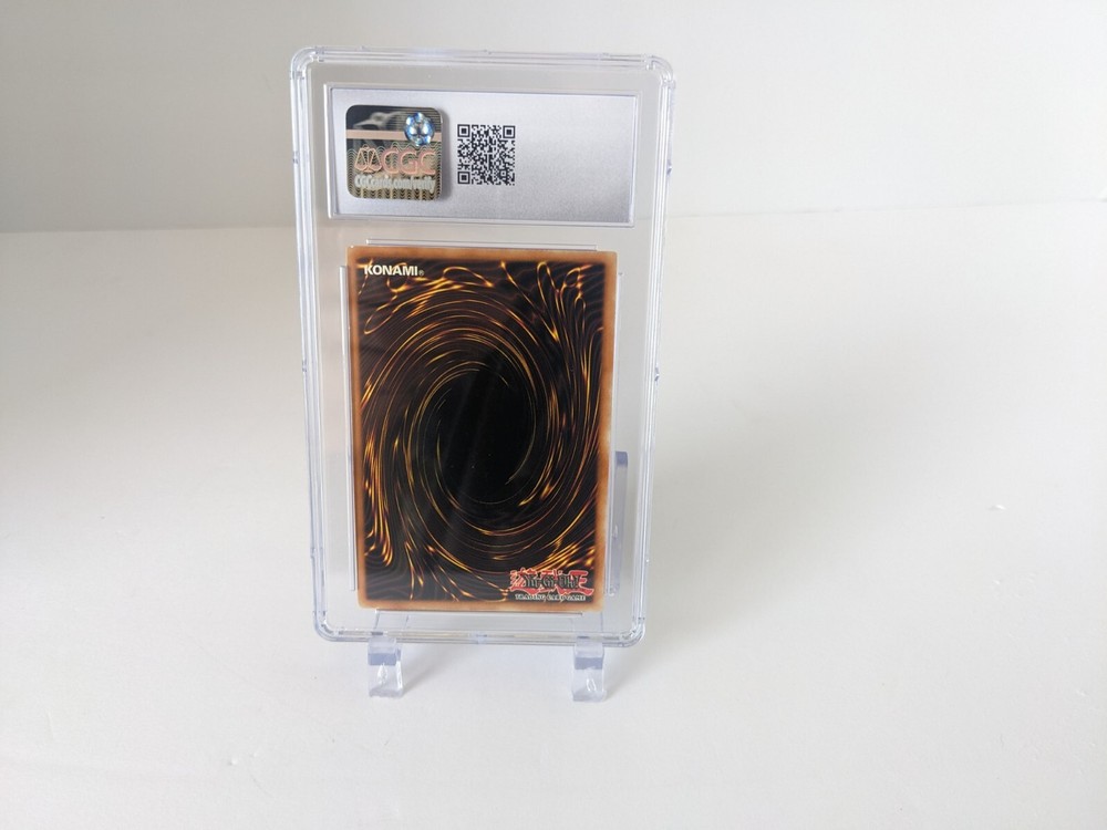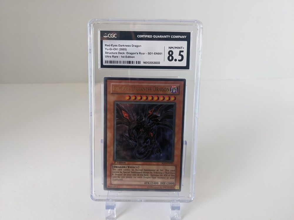 This is a rare, first edition collectible card game card from the Yu-Gi-Oh! TCG. The card is called Red-Eyes Darkness Dragon and is a Dark Dragon creature type with the attribute of Darkness. It was manufactured by Konami in 2005 and is part of the Dragons Roar set. The card number is SD1-EN001 and it has been certified by the Certified Guaranty Company (CGC) with a grade of 8.5. The card features the Ultra Rare rarity and belongs to the Yu-Gi-Oh! character family.