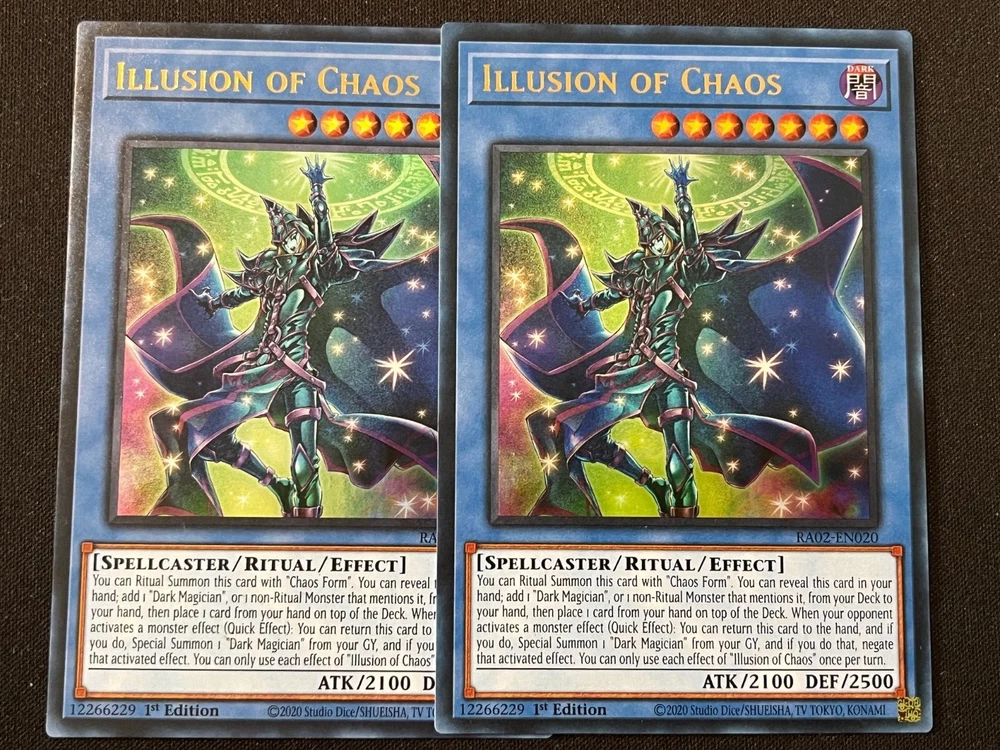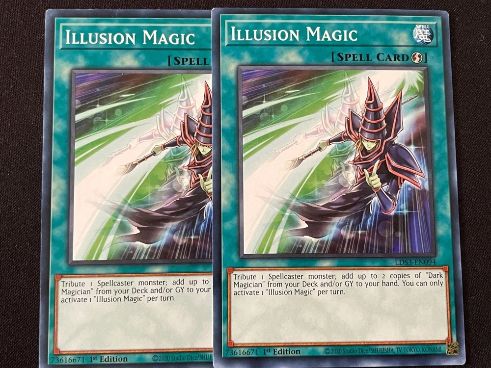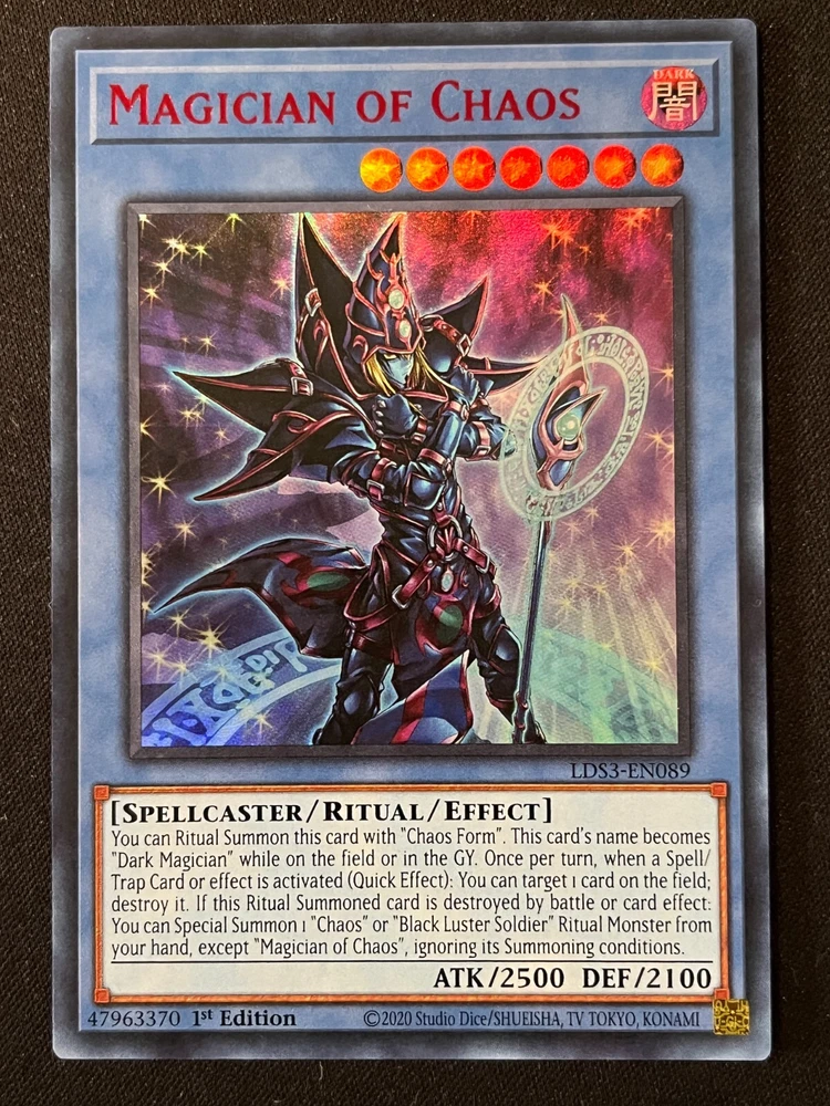 MONSTERS: 2X ILLUSION OF CHAOS (ULTRA RARE) 1X MAGICIAONOF CHAOS (ULTRA RARE COLOR) 3X DARK MAGICIAN (COMMON) 2X MAGICIANS' SOUL (ULTRA ARRE) 2X MAGICAN'S ROD (COMMON) 2X MAGICIAN'S ROBE (COMMON) 2X APPRENTICE ILLUSION MAGICIAN (COLOR ULTRA RARE) 1X MAGIKURIBOH (PRISMATIC SECRET RARE) 1X TIMAEUS THE UNITED DRAGON (PRISMATIC SECRET RARE) 1X MAGICIAN OF DARK ILLUSION (COMMON) 1X CHAOS COMMAN MAGICIAN (COLOR ULTRA ARRE) 1X RED-EYES BLACK DRAGON (ULTRA RARE) SPELLS: 3X DARK MAGICAL CIRCLE (COLOR ULTRA RARE) 1X MAGICIAN'S SALVATION (ULTRA RARE) 1X PIERCING THE DARKNESS (ULTRA RARE) 2X DARK MAGIC ATTACK (COMMON) 2X THOUSAND KNIVES (COMMON) 2X ILLUSION MAGIC (COMMON) 2X CHAOS FORM (COMMON) 1X DIFFUSION WAVE-MOTION (COMNMON) 1X RED-EYES FUSION (ULTRA RARE) TRAPS: 2X MAGICIAN NAVIGATION (COMMON) 1X MAGICIANS' COMBINATION (COLOR ULTRA RARE) 1X DARK RENEWAL (COMMON) 1X ETERNAL SOUL (ULTRA RARE) EXTRA DECK: 1X EBON ILLUSION MAGICIAN (COLOR ULTRA RARE) 1X RED-EYES DARK DRAGOON (ULTRA RARE) V7