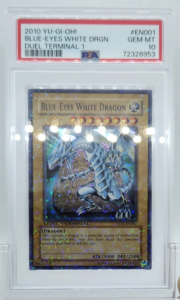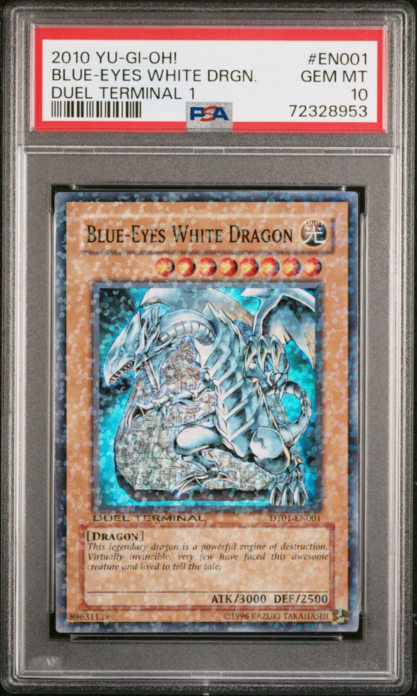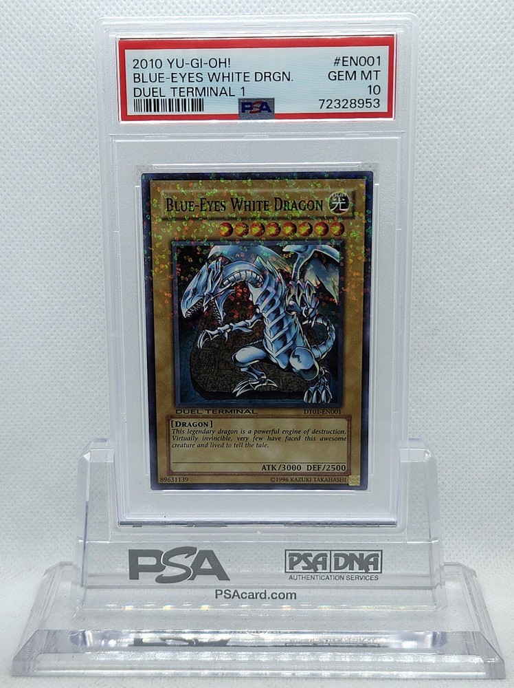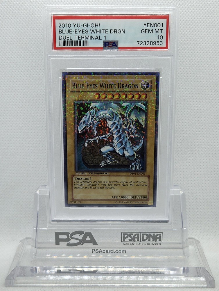 Description Condition: PSA 10 GEM MINT Availability: In Stock You are Purchasing YUGIOH DUEL TERMINAL DT01-EN001 BLUE-EYES WHITE DRAGON PSA 10 GEM MINT #72328953 Professionally graded by Professional Sports Authenticator (PSA) *PLEASE REVIEW PHOTOS BEFORE BIDDING/BUYING >>MORE GRADED YUGIOH CARDS<< IG: CARD_RUSH_INC Payment Options Payment is expected within 2 weeks of your purchase date. We accept all forms of payments through Paypal. Shipping and Handling We ship to all U.S. states, U.S. territories, APO/FPO locations and any international countries listed under our "ship to" heading. Shipping and Handling is calculated based on the combined shipping weight of your item(s). Please use the shipping calculator to estimate your shipping and handling charges. In order to qualify for combined shipping terms, all items must be paid for in one payment; please do not pay until you are done bidding/shopping. Please contact us if you have any questions regarding our shipping and handling terms. Shipping and Delivery Packages are shipped out every Monday, Wednesday, and Friday. Domestic Packages take approximately 2-7 days to arrive. International packages may take a little longer to arrive, typically 1-4 weeks. Please allow ample transit times before inquiring about your package, thank you. Sales Tax Sales tax will be automatically collected by Ebay. Customer Service We will make every effort to get your purchase is mailed in a timely manner. Please contact us if you have any questions or concerns; we would love to hear any suggestions you have on how we can improve your eBay experience. Thank you for visiting us today.