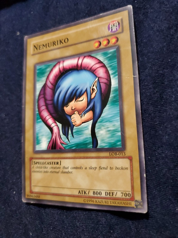 YUGIOH! LEGEND OF BLUE EYES WHITE DRAGON #LOB-013 NEMURIKO There is some wear on the corners and edges along with a crease across the center of the card. Please let me know if you have any questions or need additional images before bidding or purchasing. Shipping and returns are free and all cards are shipped in a penny sleeve and either a sealed top loader or card saver 1. Unless specifically requested, cards selling for less than $5 will be shipped in a regular envelope (PWE) with a first class stamp. Multiple cards, or those selling for greater than $5 will be shipped with tracking by either USPS or eBay Standard Envelope. All cards will be well protected regardless of shipping method.