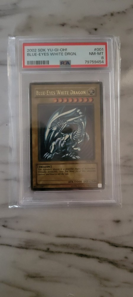 This is a Japanese-sized, autographed Blue-Eyes White Dragon card featuring Seto Kaiba from Yu-Gi-Oh! TCG. The card is graded 8 by Professional Sports Authenticator (PSA), manufactured in 2002 by Konami in the United States. It is an Ultra Rare card with a holo finish, part of the Dragons set, and suitable for ages 6 and up.