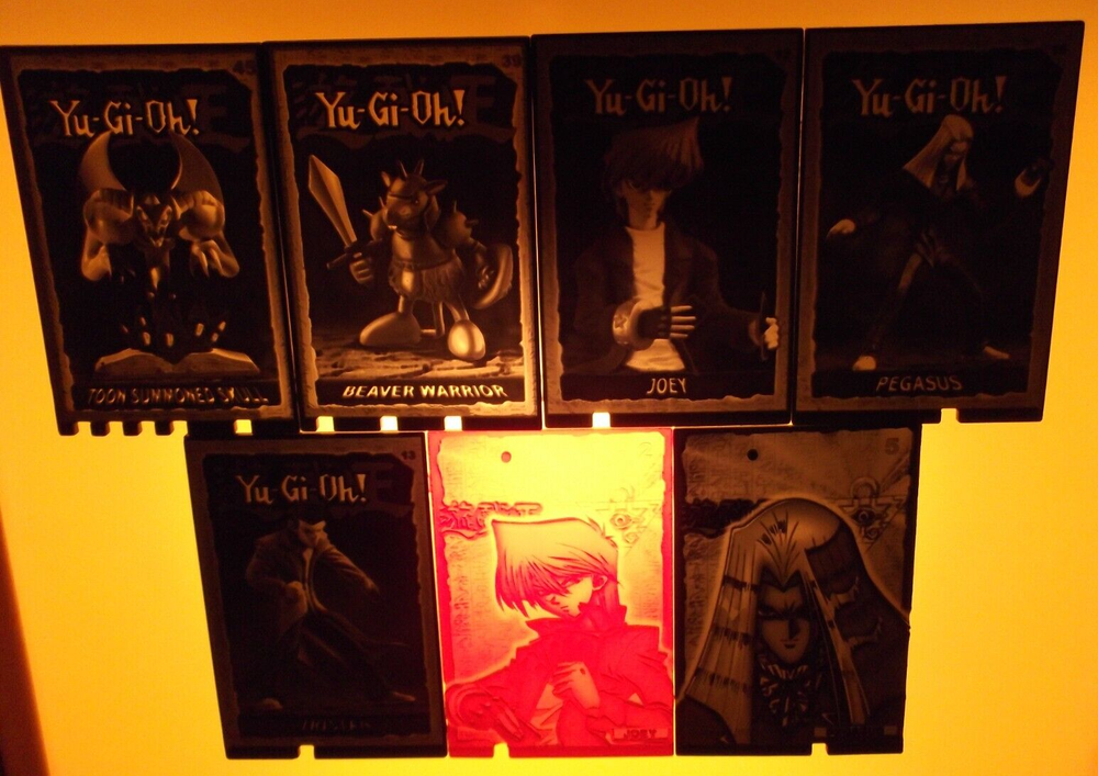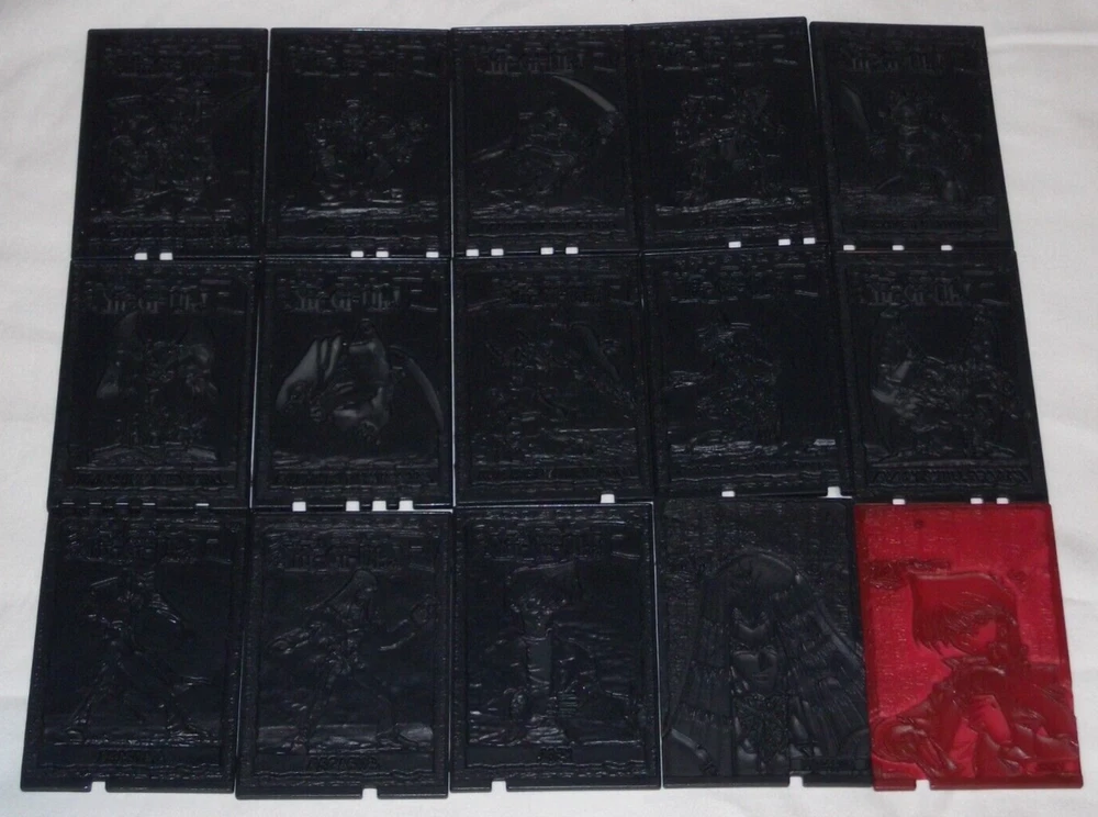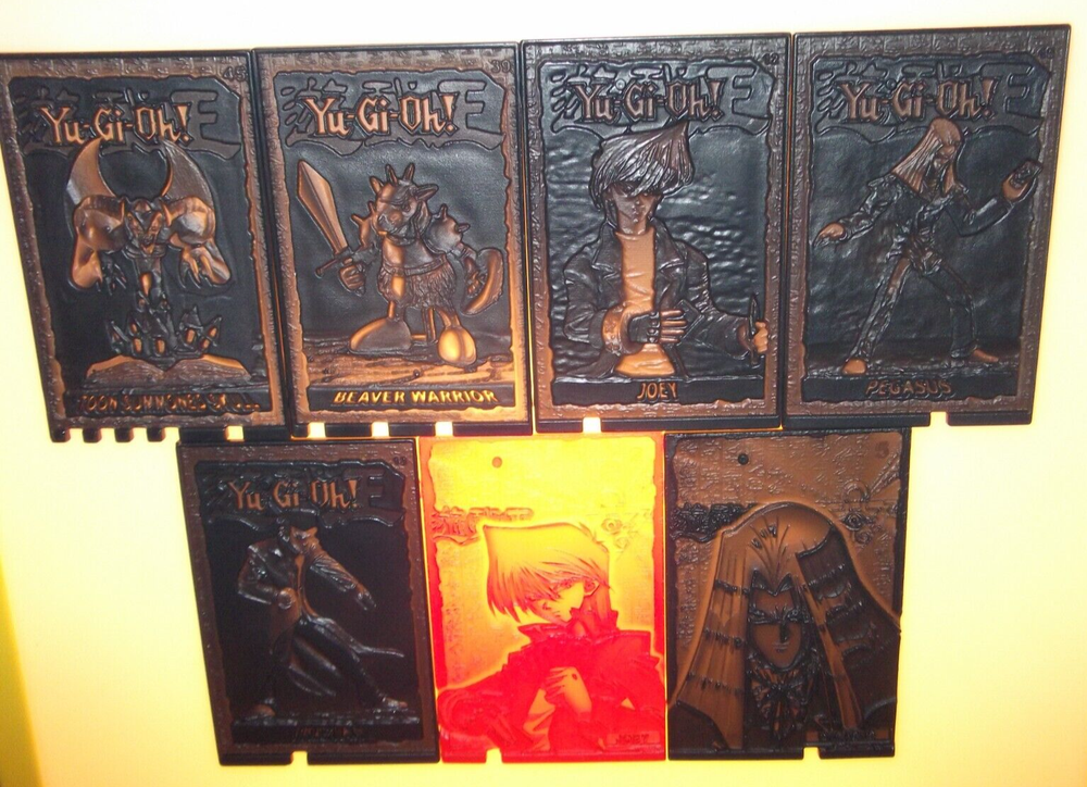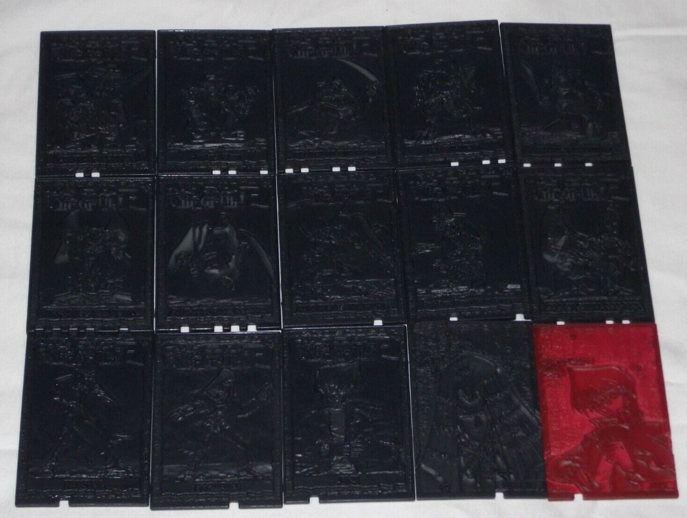 Selling a lot of 15 (1-red, 14-black) Yu-Gi-Oh! molded plastic cards from 1996 by Kazuki Takahashi. I experimented with taking pictures on a light table to try and show the card detail better...pretty cool...would make a neat lighted display! Cards included are as follows: #2 "JOEY" (red card) #5 "PEGASUS" (black cards from here on...) #12 "JOEY" #13 "TRISTAN" #15 "PEGASUS" #16 "BLUE EYES WHITE DRAGON" #19 "CELTIC GUARDIAN" #39 "BEAVER WARRIOR" #45 "TOON SUMMONED SKULL" #46 "REAPER OF THE CARDS" #50 "BLACK SKULL DRAGON" #53 "BLUE EYES TOON DRAGON" #62 RED EYES BLACK METAL DRAGON" #64 "JUDGE MAN" #66 "GAROOZIS" Thanks so much for looking! *From a pet-free and smoke-free home.* *Please look at all pictures closely and ask any questions you may have.* *Please pay immediately if buy-it-now listing or within 2 days of ending if auction-style listing.* *Will be shipped your choice of First-Class or Priority Mail with insurance included, within 2 days of cleared payment.* Thanks so much for checking out all my listings:)