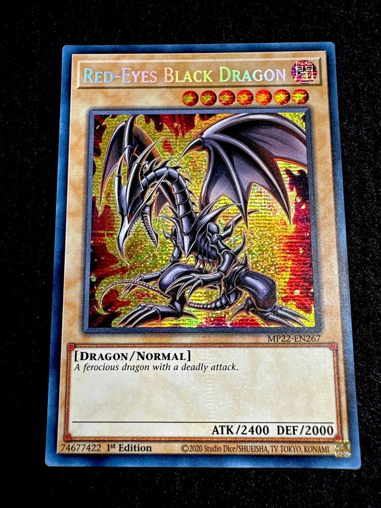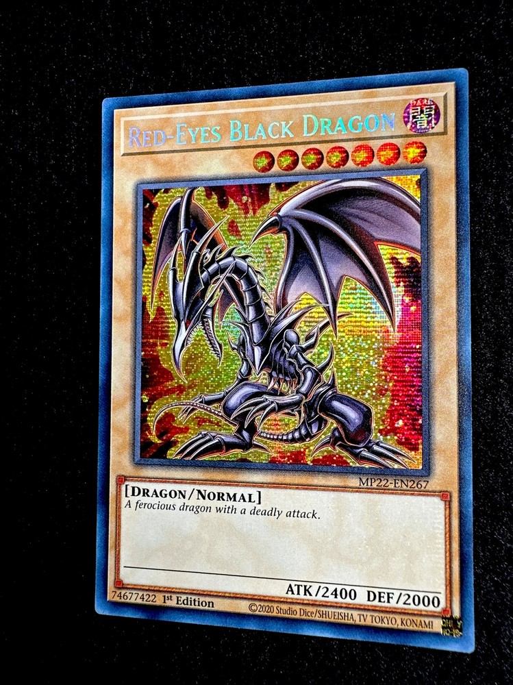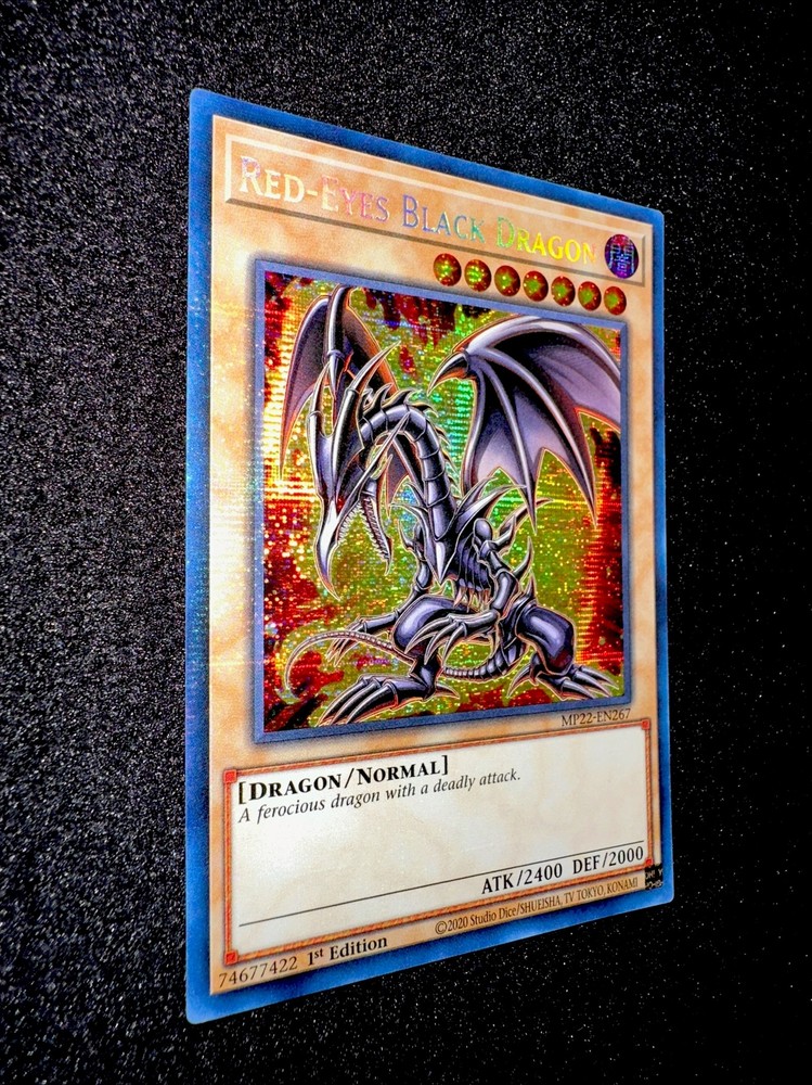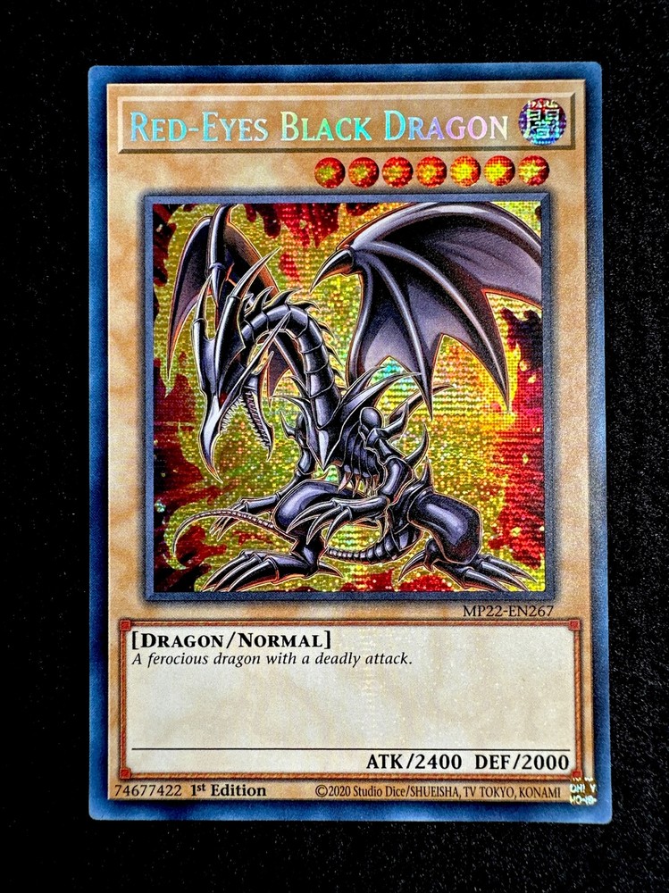 🔥 YUGIOH • RED-EYES BLACK DRAGON • SECRET RARE • MP22-EN267 • 1st ED • NM 🔥 This rare and highly sought-after Yu-Gi-Oh! TCG card features the iconic character Joey Wheeler's powerful Red Eyes Black Dragon. With a defense of 2000 and an attack power of 2400, this dragon is a formidable creature to have in your deck. The card is made of high-quality card stock and has a prismatic secret rare finish, making it a shining addition to any collection. The card is a 1st edition and is in near mint condition. It comes from the 2022 Tin of the Pharaoh's Gods set and has the card number MP22-EN267. The card is in English and has a holographic finish. This is a must-have for any Yu-Gi-Oh! fan or collector. Card Sleeve Included + Top Loader •Never Play Near Mint card • Authentic Konami USA Version YOU ARE GUARANTEED TO GET THE CARD NAMED IN THE TITLE. Thank you.