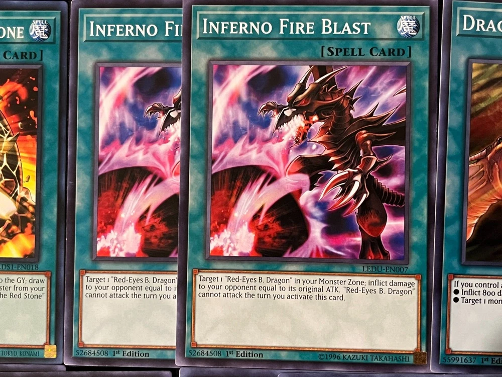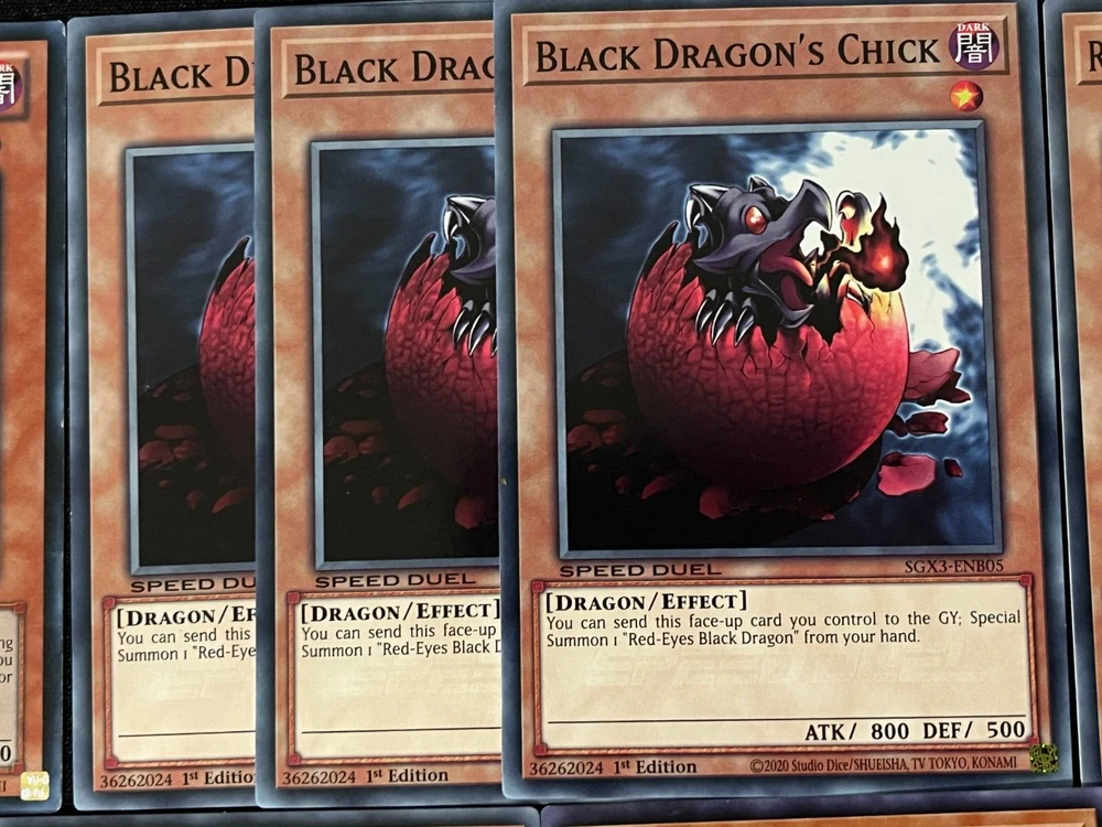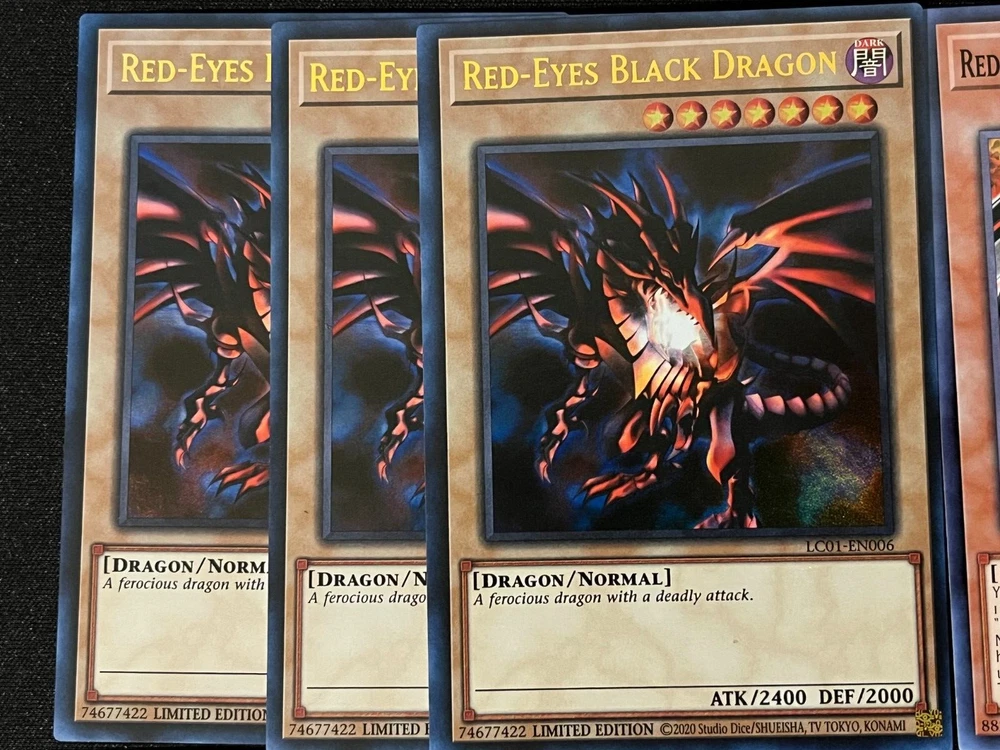 MONSTERS: 3X RED-EYES BLACK DRAGON (ULTRA RARE) 3X RED-EYES DARKNESS METAL DRAGON (COMMON) 3X BLACK DRAGON'S CHICK (COMMON) 2X RED-EYES DARKNESS DRAGON (COMMON) 1X DECOY DRAGON (COMMON) 2X RED-EYES DOUL (RARE) 2X MALEFIC RED-EYES BLACK DRAGON (COMMON) 1X RED-EYES BLACK METAL DRAGON (COMMON) 1X RED-EYES RETRO DRAGON (COMMON) 2X KEEPER OF THE SHRINE (COMMON) SPELLS: 2X CARDS OF THE RED STONE (COMMON) 2X INFERNO FIRE BLAST (COMMON) 2X DRAGON'S GUNFIRE (SUPER RARE) 2X A WINGBEAT OF GIANT DRAGON (COMMON) 2X STAMPING DESTRUCTION (SUPER RARE) TRAPS: 1X BURST BREATH (COMMON) 2X RETURN OF THE RED-EYES (COMMON) 2X RED-EYES BURN (COMMON) 2X RED-EYES SPIRIT (COMMON) 2X METALMORTH (COMMON) 1X CASTLE OF DSRAGON SOULS (COMMON) EXTRA DECK: 3X RED-EYES FLARE METAL DRAGON (SUPER RARE)