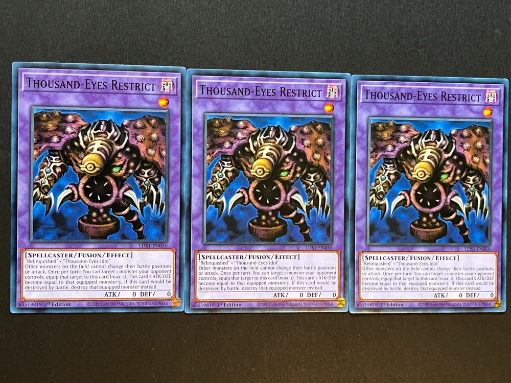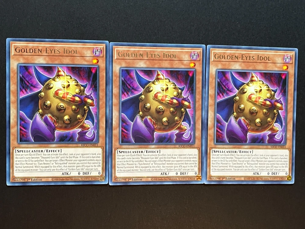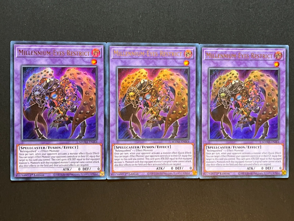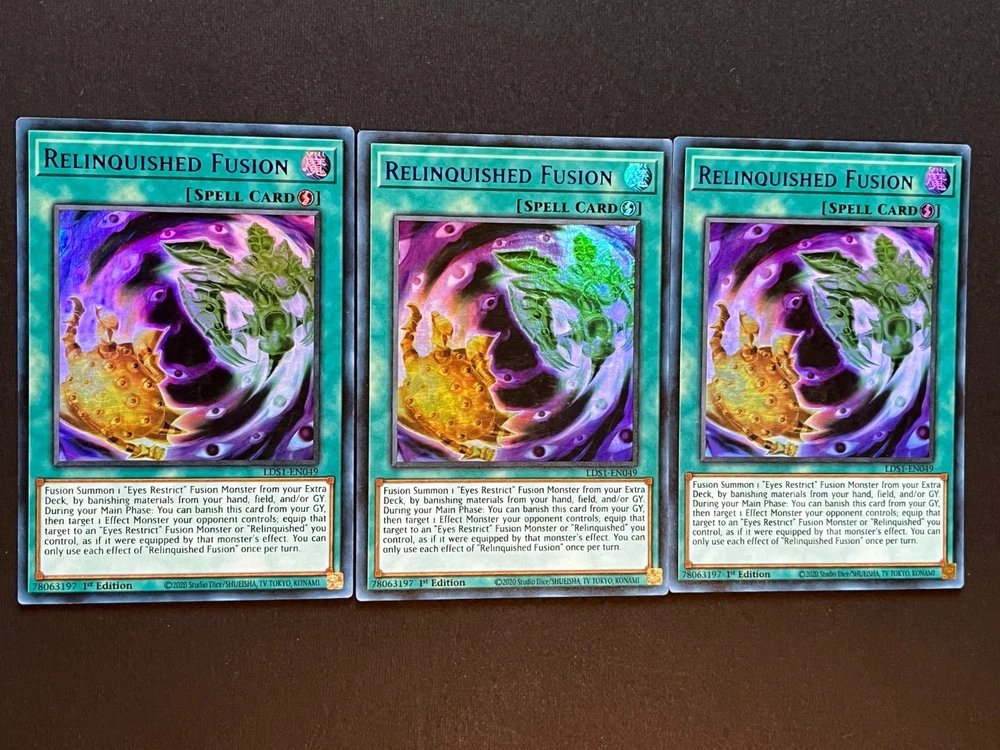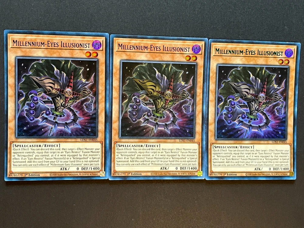 MONSTERS: 3X MILLENNIUM-EYES ILLUSIONIST (COLOR ULTRA RARE) 3X GOLDEN-EYES IDOL (RARE) 3X ILLUSIONIST FACELESS MAGICIAN (COMMON) 1X THOUSAND-EYES IDOL (COMMON) 1X RELINKURIBOH (SUPER RARE) 2X MAGICIANS' SOULS (ULTRA RARE) 2X DARK MAGICIAN (ULTRA RARE) 2X RED-EYES BLACK DRAGON (ULTRA RARE) 1X CHOCOLATE MAGICIAN GIRL (SECRET RARE) 3X RELINQUISHED (ULTRA RARE- LIGHTYLY PLAYED) SPELLS: 3X RELINQUISHED FUSION (COLOR ULTRA RAE) 3X BLACK ILLUSION RITUAL (COMMON) 1X INSTANT FUSION (ULTRA RARE) 1X EYE OF ILLUSION (ULTRA RARE) 3X PRE-PREPARATION OF RITES (RARE) 3X PREPARATION OF RITES (RARE) 3X ALLURE OF DARKNESS (RARE) 1X RAIGEKI (PREMIUM GOLD RARE) 1X MONSTER REBORN (ULTRA RARE) 1X WONDER WAND (SUPER RARE) 1X ADVANCED RITUAL ART (ULTRA RARE) 1X SCAPEGOAT (ULTRA RARE) 2X RED-EYES FUSION (ULTRA RARE) 1X CHANGE OF HEART (ULTRA RARE) TRAPS: 1X DARK RENEWAL (SECRET RARE) 1X BLACK ILLUSION (SECRET RARE) EXTRA DECK: 3X MILLENNIUM-EYES RESTRICT (ULTRA RARE) 3X THOUSAND-EYES RETRICT (COMMON) 2X RED-EYES DARK DRAGON (ULTRA RARE) 1X RELINQUISHED ANIMA (PLATINUM SECRET RARE)