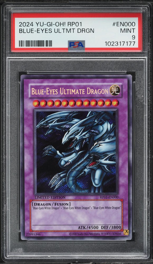 Description Condition: PSA 9 MINT Availability: In Stock You are Purchasing YUGIOH RP01-EN000 BLUE-EYES ULTIMATE DRAGON SECRET RARE PSA 9 MINT #102317177 Professionally graded by Professional Sports Authenticator (PSA) *PLEASE REVIEW PHOTOS BEFORE BIDDING/BUYING >>MORE GRADED YUGIOH CARDS<< IG: CARD_RUSH_INC Payment Options Payment is expected within 2 weeks of your purchase date. We accept all forms of payments through Paypal. Shipping and Handling We ship to all U.S. states, U.S. territories, APO/FPO locations and any international countries listed under our "ship to" heading. Shipping and Handling is calculated based on the combined shipping weight of your item(s). Please use the shipping calculator to estimate your shipping and handling charges. In order to qualify for combined shipping terms, all items must be paid for in one payment; please do not pay until you are done bidding/shopping. Please contact us if you have any questions regarding our shipping and handling terms. Shipping and Delivery Packages are shipped out every Monday, Wednesday, and Friday. Domestic Packages take approximately 2-7 days to arrive. International packages may take a little longer to arrive, typically 1-4 weeks. Please allow ample transit times before inquiring about your package, thank you. Sales Tax Sales tax will be automatically collected by Ebay. Customer Service We will make every effort to get your purchase is mailed in a timely manner. Please contact us if you have any questions or concerns; we would love to hear any suggestions you have on how we can improve your eBay experience. Thank you for visiting us today.
