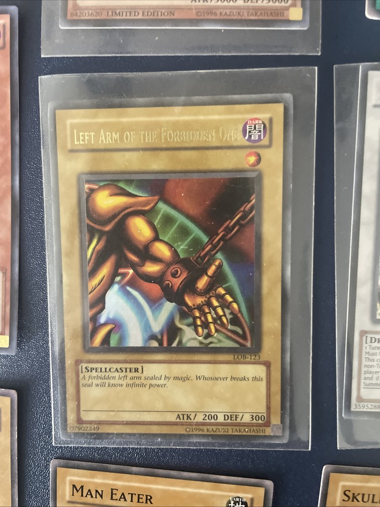 Dive into the world of strategic duel battles with this diverse lot of Yu-Gi-Oh! TCG cards featuring 19 cards from the iconic Legend of Blue Eyes White Dragon set. Among these are sought after holographic finishes that brings the artwork to life. The set includes a mix of card types, showcasing the versatility and power of Earth, Water, Wind, spell, Dark, and Light traps, alongside a few Normal cards. Each card is in English and standard card size. manufactured in the United States by Konami in 1996