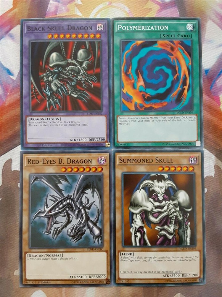Hey guys I am new to Ebay so give me feedback or ask questions if your unsure about something. I am in grad school and I work full time so my items take a little longer to Ship! Please Allow me the Set Handling time before your item will be shipped! It may take the full handling time set Thank You!!! Happy Bidding!!! **Picture may have been edited due to Inventory Changes Please read description Below.** Shipping - All orders will be shipped with bubble mailer and a protective case. - I ship to both Domestic (U.S.) and International destinations! Payment - Please pay within 3 days of your order to avoid an Unpaid Item Case. This just helps me run things smoothly for other bidders/buyers and myself. Will appreciate if you please leave feedback when you receive your item, and I will leave feedback as well. Contact me if anything is wrong with your order so I can have a chance to fix the issue- Your satisfaction is most important! **If you are a international buyer, Customs Fees are the responsobility of the Buyer** A bonus for ordering you will also Get a Free Holo Card from my collection. It maybe Super Rare, Ultra Rare, or SECRET Rare!!! As a Bonus Gift for buying my auction you will Recieve a Bonus Free Holo Card. It can be Super Rare, Ultra Rare, or Secret Rare or even GHOST Rare!!! You will receive the following items: 1x Black Skull Dragon 1x Red Eyes B. Dragon 1x Summoned Skull 1x Polymerization