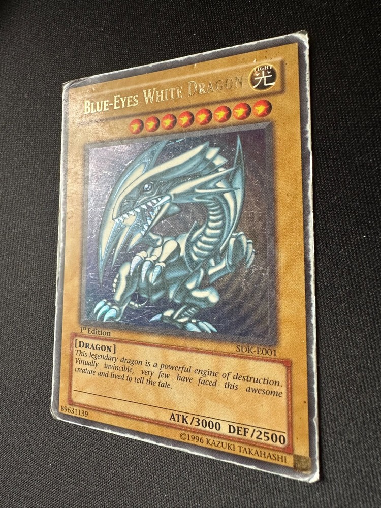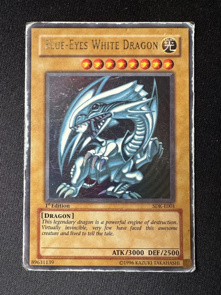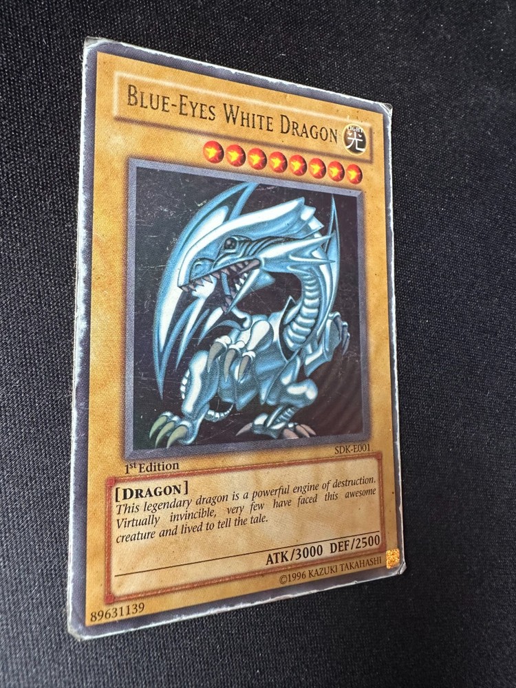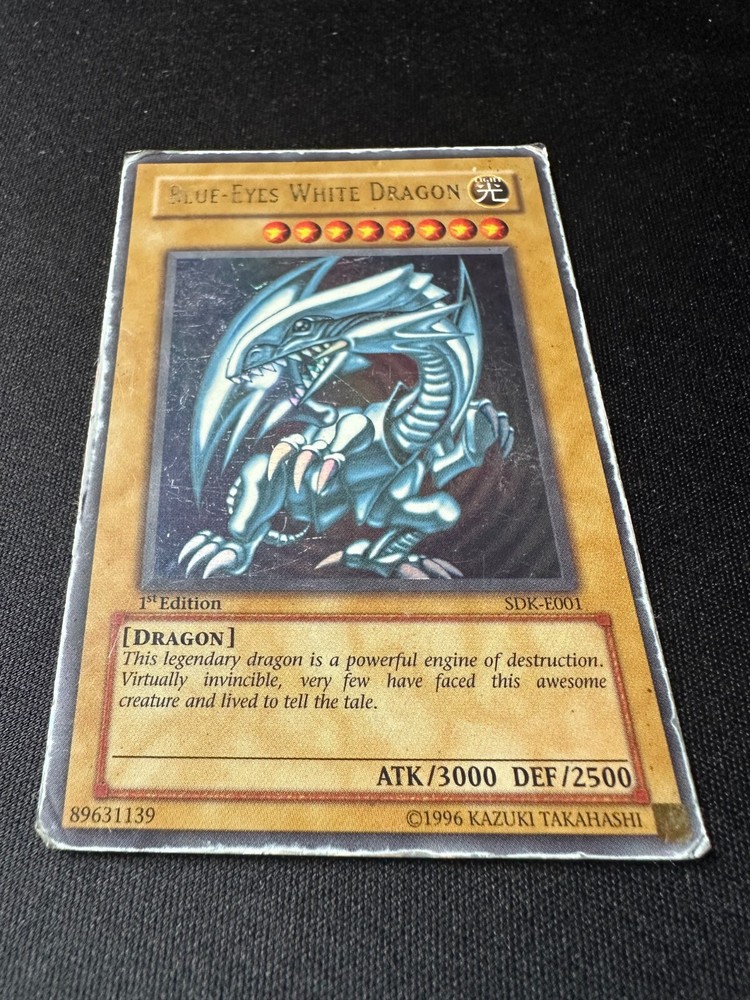 Yu-Gi-Oh! 1st Edition BLUE EYES WHITE DRAGON SDK-E001 Ultra Rare Holo Card - HP Ultra Rare 1st Edition Blue-Eyes White Dragon Yu Gi Oh card The card is in Heavy Played condition as shown in the photo's T he card is from the Starter Deck: Kaiba set which was released in 2002 The card will be shipped in a letterbox parcel with Track & Trace protected in a sleeve, toploader & team bag