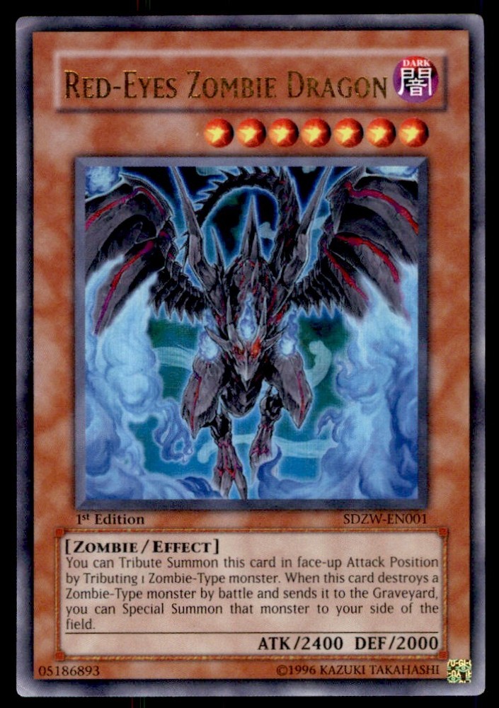 About Me Other Listings Feedback Add to Favorites Contact Me Bluenose Yu-Gi-Oh! 1st Edition Red-Eyes Zombie Dragon #SDZW-EN001 Light Play No stock photo / These are real scans or pictures Details Description: Red-Eyes Zombie Dragon Category: Yugioh Year: 1996 Product: Yu-Gi-Oh! Set: 1st Edition Card Number: SDZW-EN001 Special: Light Play Dimensions: 3¼" x 2¼" SKU: YU B0003 R01 N (4) Payment Payment for buy it now is required immediately and for auctions it must be paid within 72 hours. Shipping Shipments usually make their way out in 3 business days. All orders to USA under 800$ USD typically are NOT subject to import or duty! We also offer free shipping on all our cards for north america. Returns and Claims Please view listing photo and description prior to purchase of card to make sure the card and condition is right for you! About Us Please keep in mind the following conditions .-------------------------------------------Near Mint: a card that shows very little to no signs of ware or usage such as very little whiting. -------------------------------------------Light Play: A card that shows signs of ware such as but not limited to whiting, slight bend or scratches. -------------------------------------------Heavy Play: A card that shows signs of ware, whiting, bending, creasing, folding or other various issues.-------------------------------------------Damaged: a card in very bad condition can have some or all of the above mentioned condition notes including peeling, stains, writing, etc.-------------------------------------------The photo in ads are the EXACT card you will recieve. Listing By Kronocard trading cards software v2.7.0.1