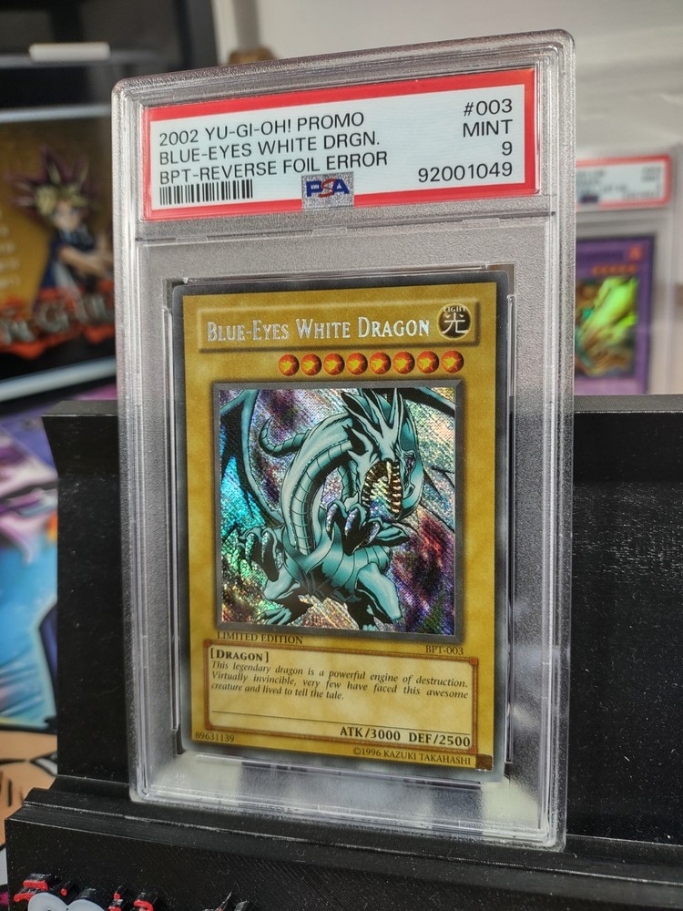 The product is a Yu-Gi-Oh! 2002 BPT-003 Blue-Eyes White Dragon Reverse Foil Error card graded as a PSA 9. This collectible card from the 2002 Collectors Tin set features a powerful Dragon creature with 2500 Defense/Toughness and 3000 Attack/Power. The limited edition card is in English and manufactured by Konami, making it a sought-after item for collectors and players of the Yu-Gi-Oh! TCG. With its secret rare rarity and unique foil finish, this Blue-Eyes White Dragon card is a valuable addition to any card collection.