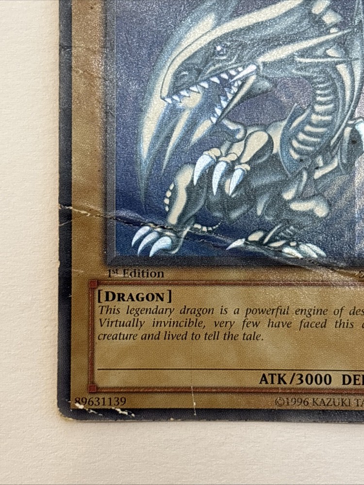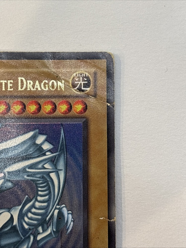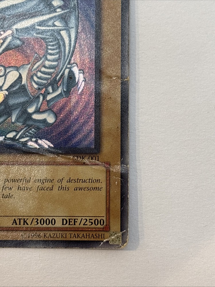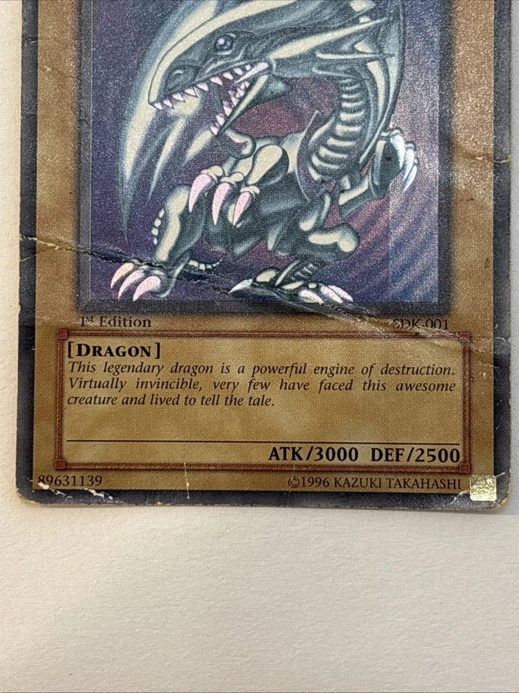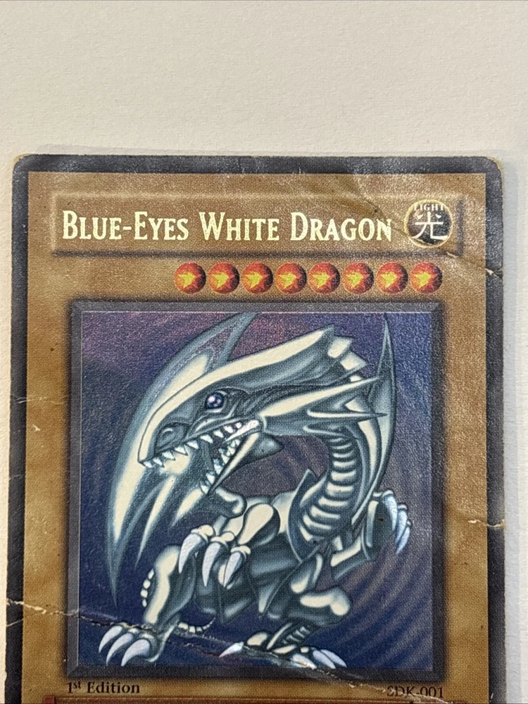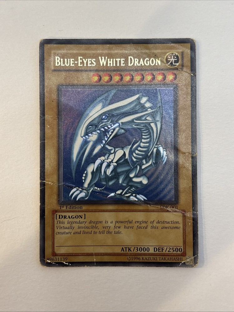 This Yu-Gi-Oh! TCG card from the - Yugi - set features the iconic Blue Eyes White Dragon, with a stunning holo finish. This ultra rare card is from the 1st edition and has the line SDK-001. It was manufactured in 2002 and is a must-have for any serious collector of collectible card games. The card's attributes include blue color and dragon theme, making it a powerful addition to any player's deck.