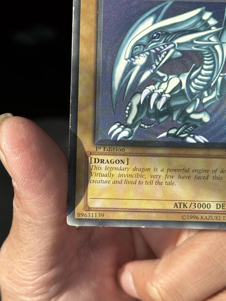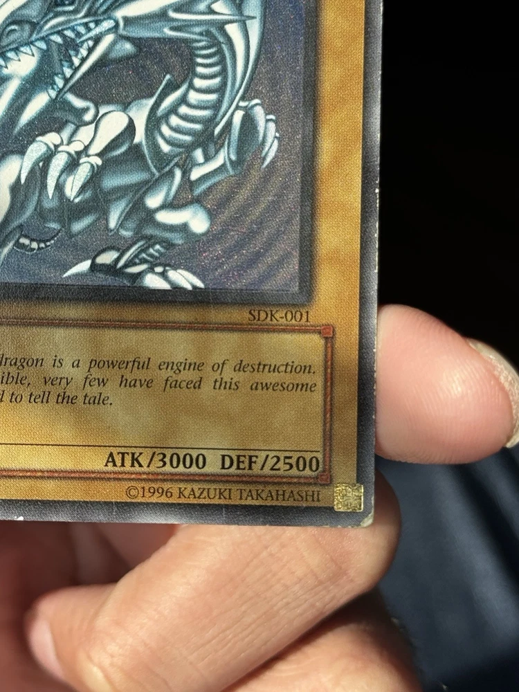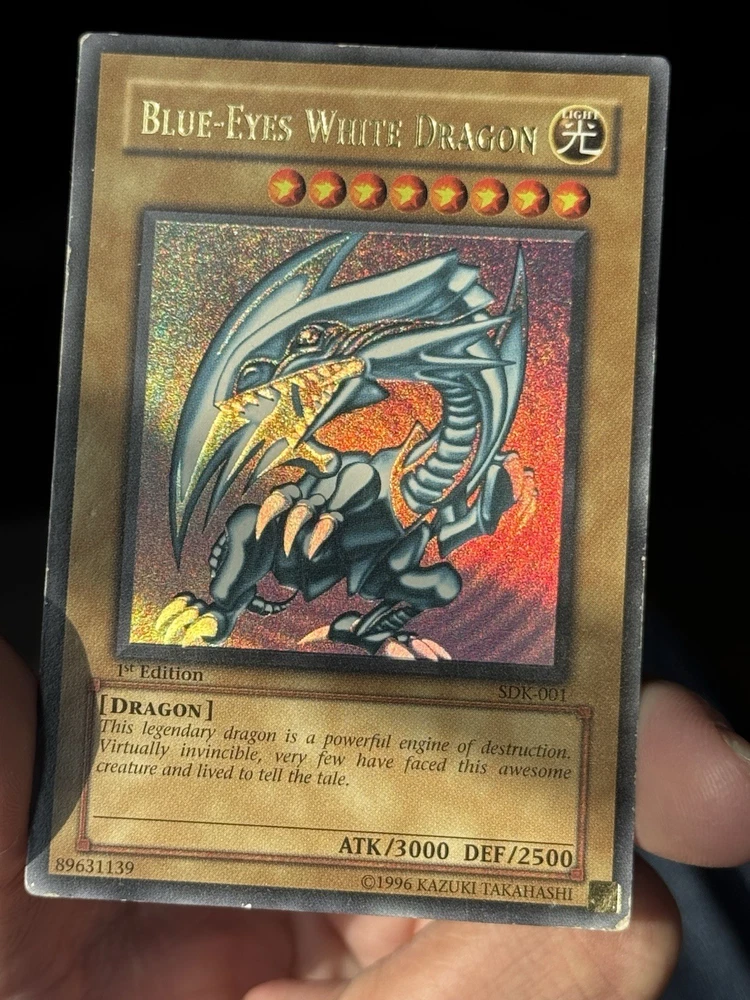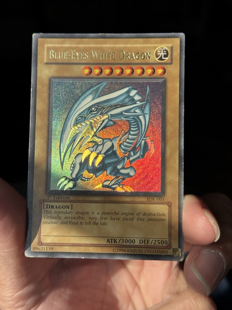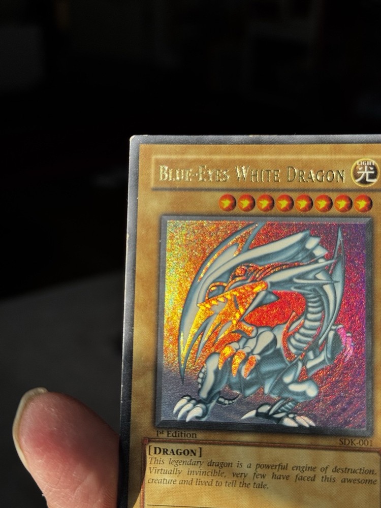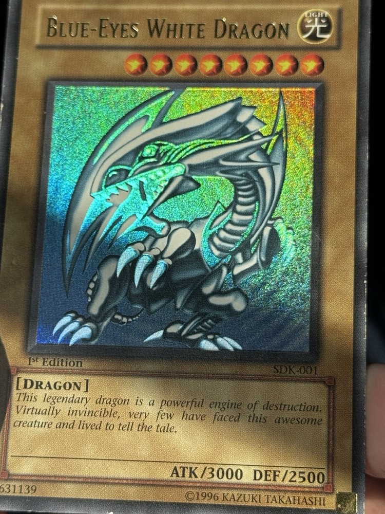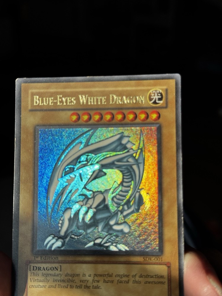 The product is a Yu-Gi-Oh! Blue Eyes White Dragon SDK-001 1st Edition card from the Yugi set, manufactured in 2002. This ultra rare collectible card features a holo finish and belongs to the Dragons attribute. As a highly sought-after and iconic card in the Yu-Gi-Oh! TCG, the Blue Eyes White Dragon is a valuable addition to any collector's deck. Its rarity and special 1st Edition status make it a valuable and sought-after item for fans of the game. U1