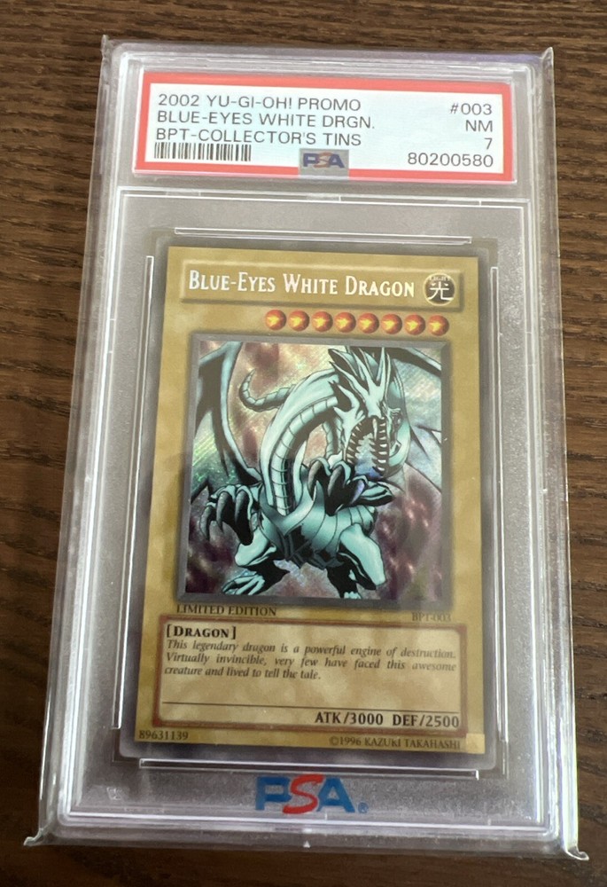 Yu-Gi-Oh! 2002 Blue-Eyes White Dragon BPT-Collector's tin BPT-003 PSA 7 is a highly sought-after card from the - Yugi - set. This Ultra Rare card features a beautiful Blue finish and holographic design, making it a valuable addition to any Yu-Gi-Oh! TCG collection. Manufactured by Konami in 2002, this card is a must-have for fans of the game, especially those who appreciate the intricate details of Dragons in the series. Don't miss the opportunity to own this rare and iconic card for your Yu-Gi-Oh! JCC deck.